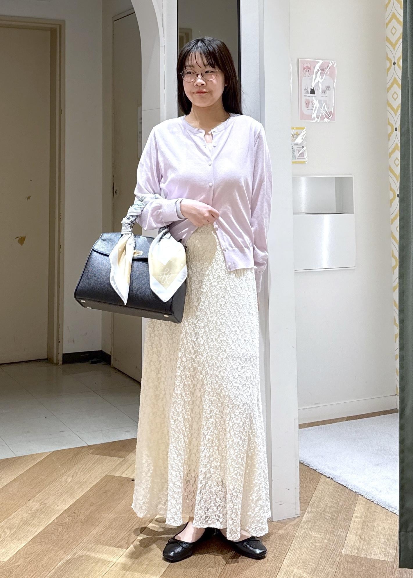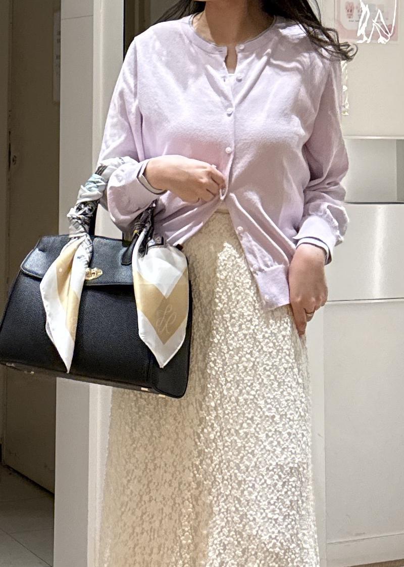 ラベンダーのカーディガンを主役としたフェミニンなお仕事コーデです。