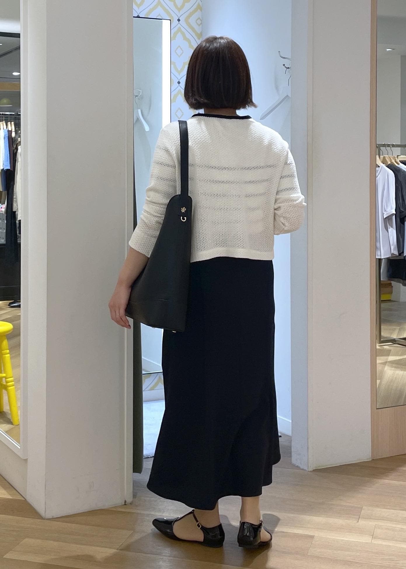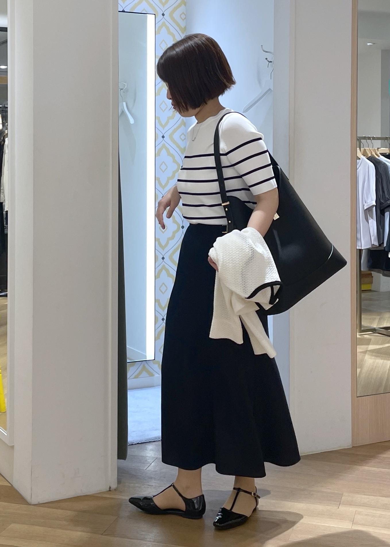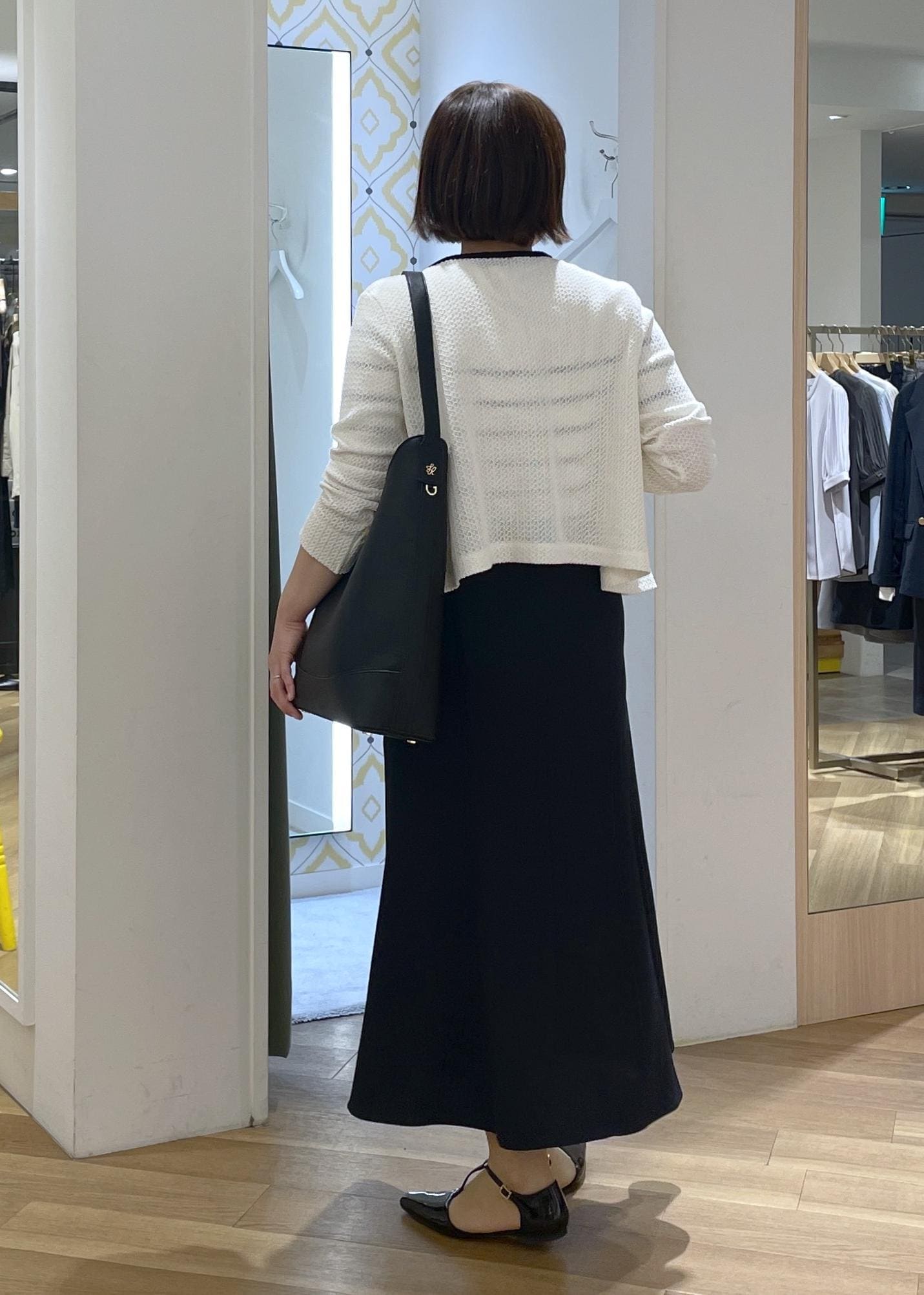 きちんと見えする黒のバッグとシューズを合わせて、通勤にも使えるスタイルに◎