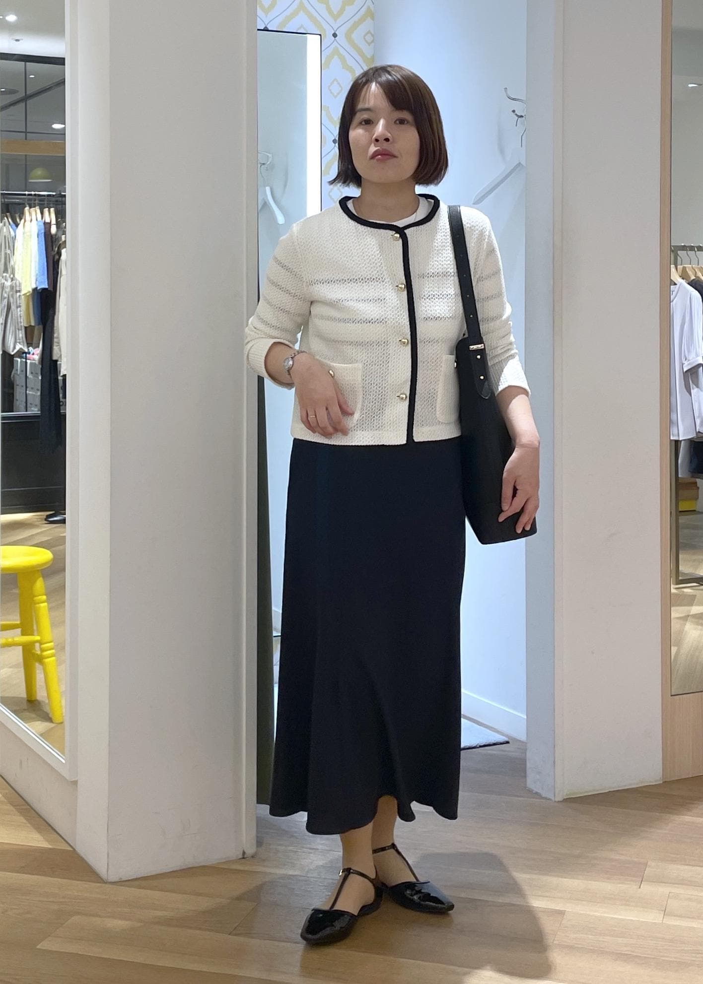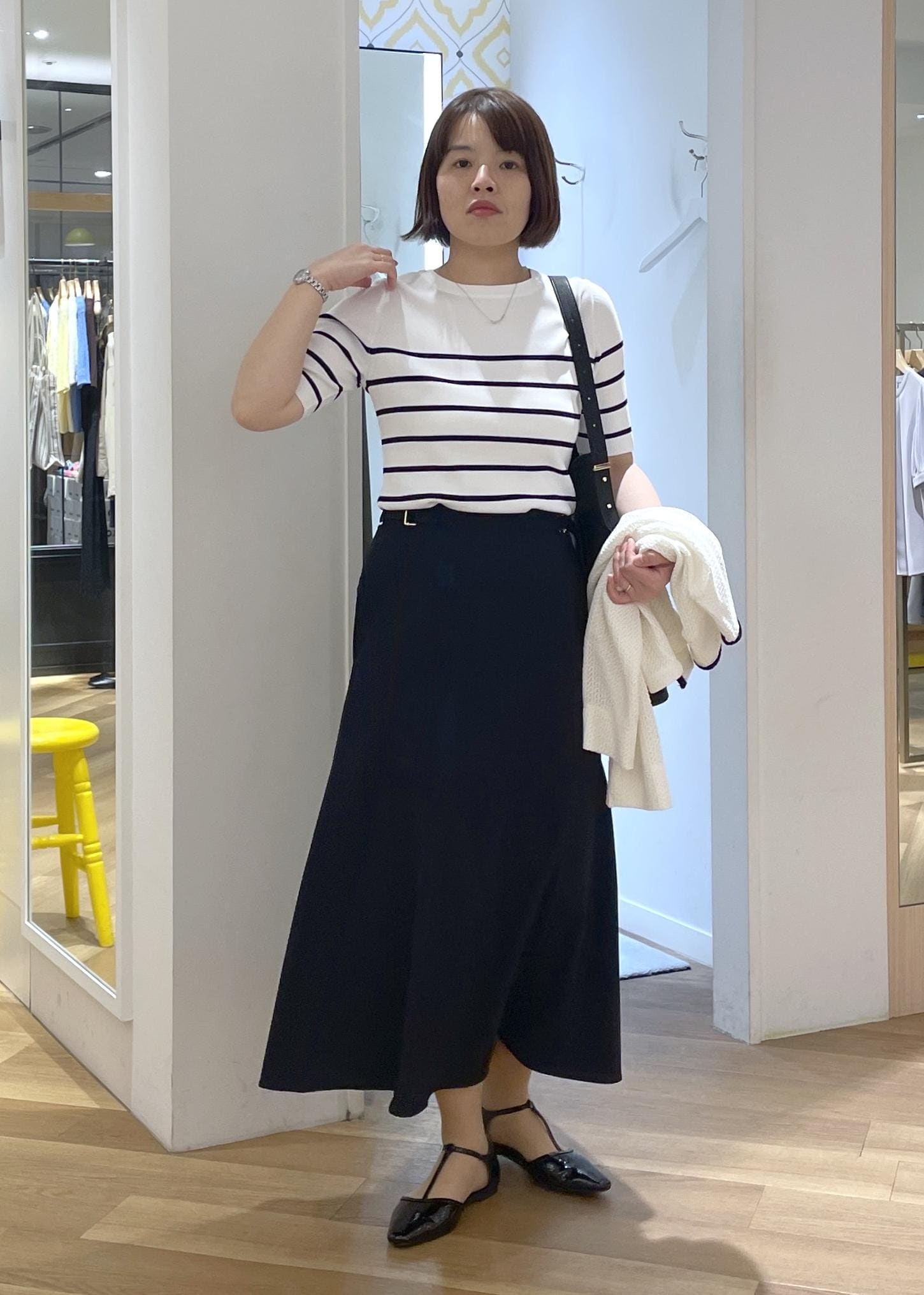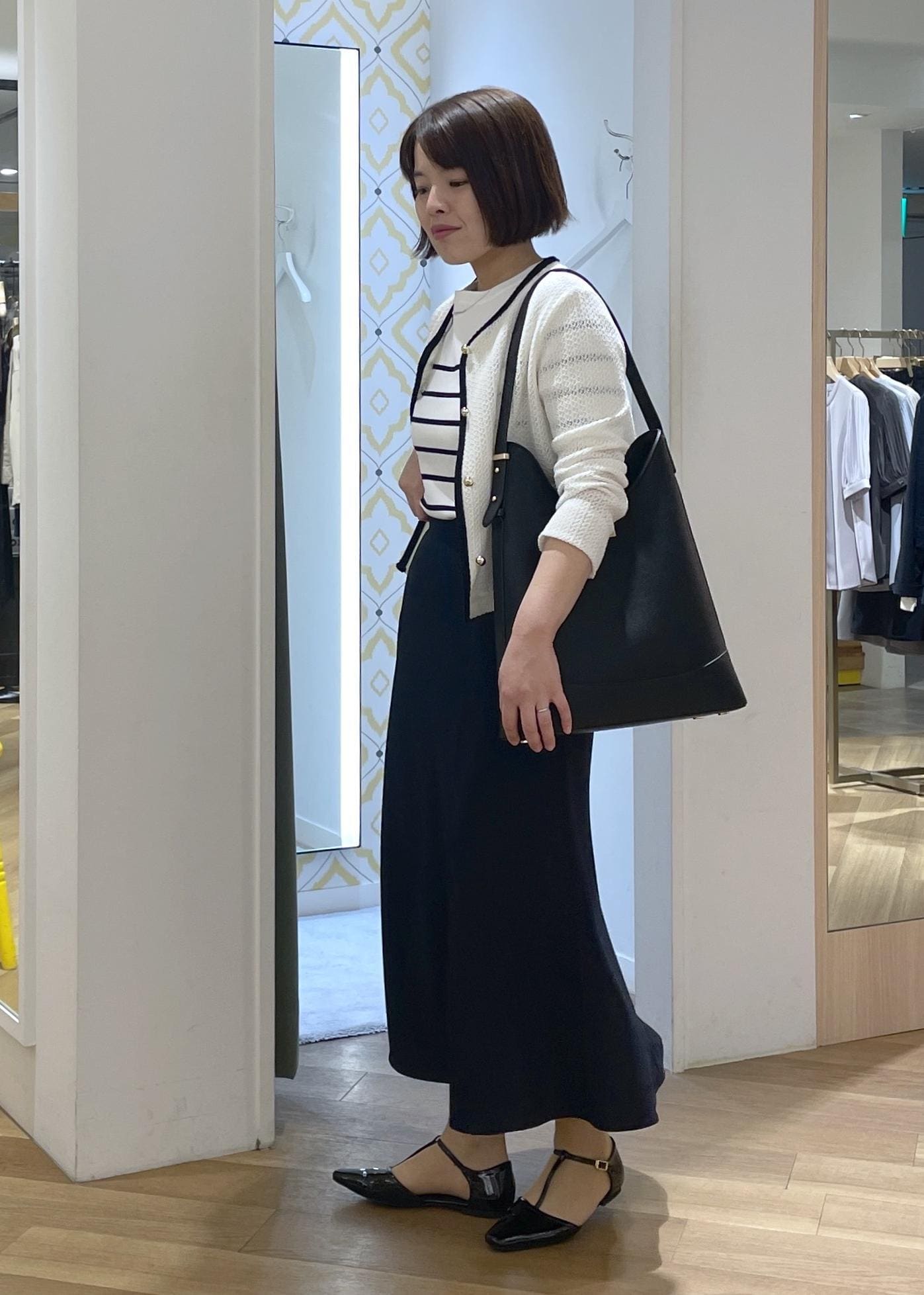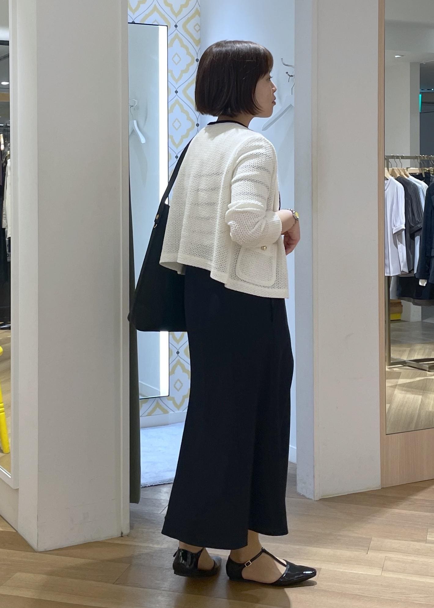 きちんと見えする黒のバッグとシューズを合わせて、通勤にも使えるスタイルに◎