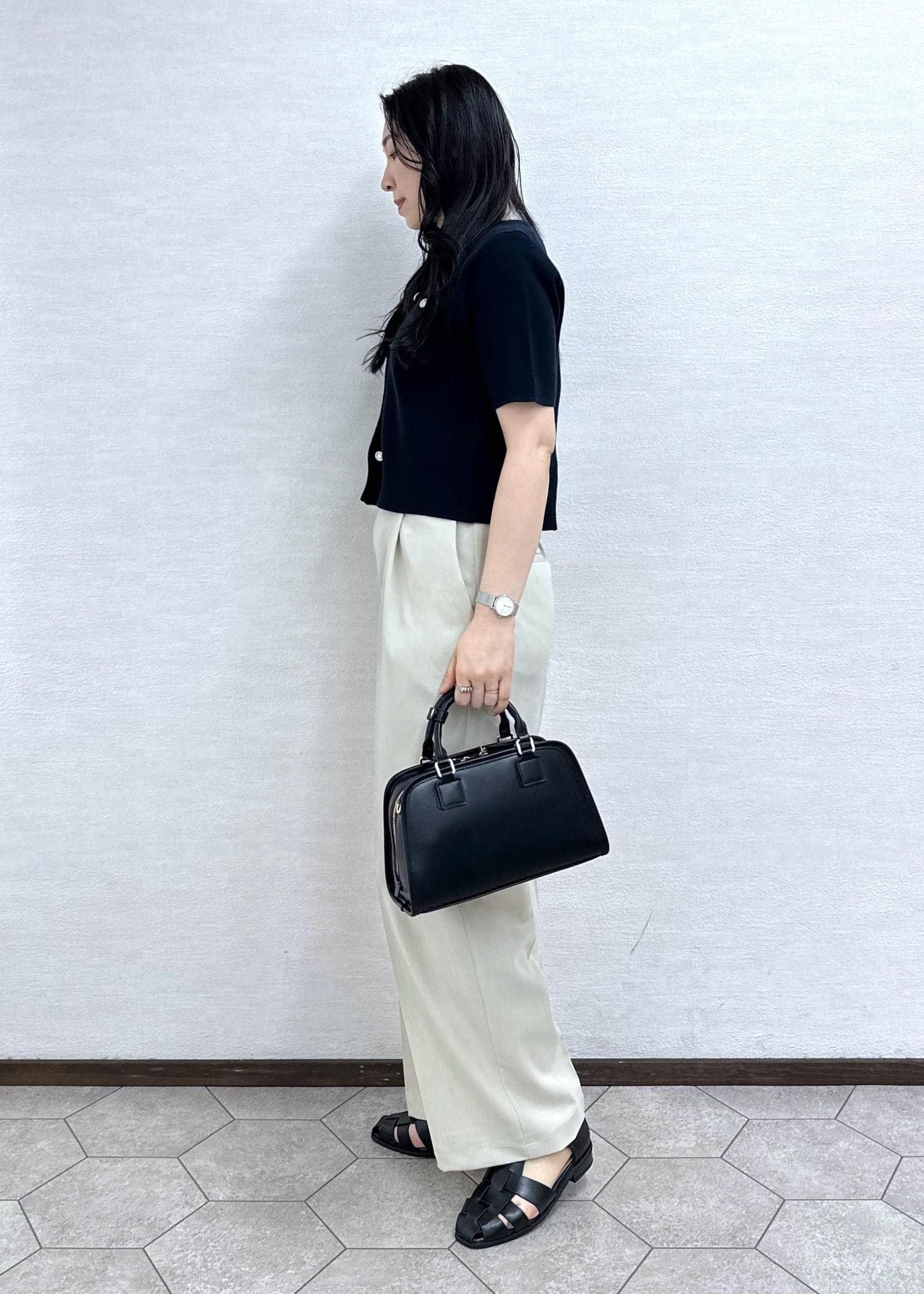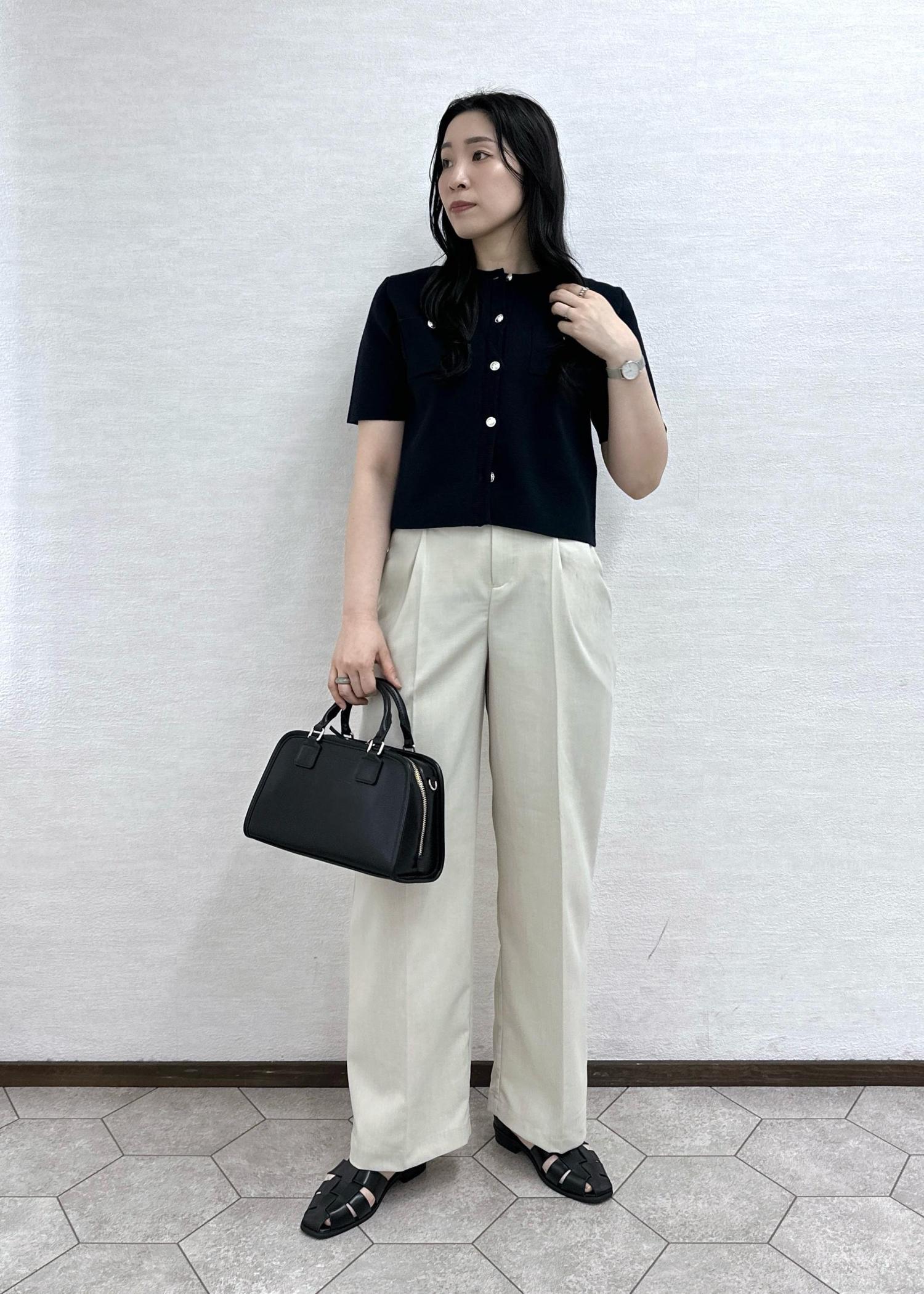 大人気のミラノリブカーディガンにワイドパンツを合わせたキレイめコーデ。