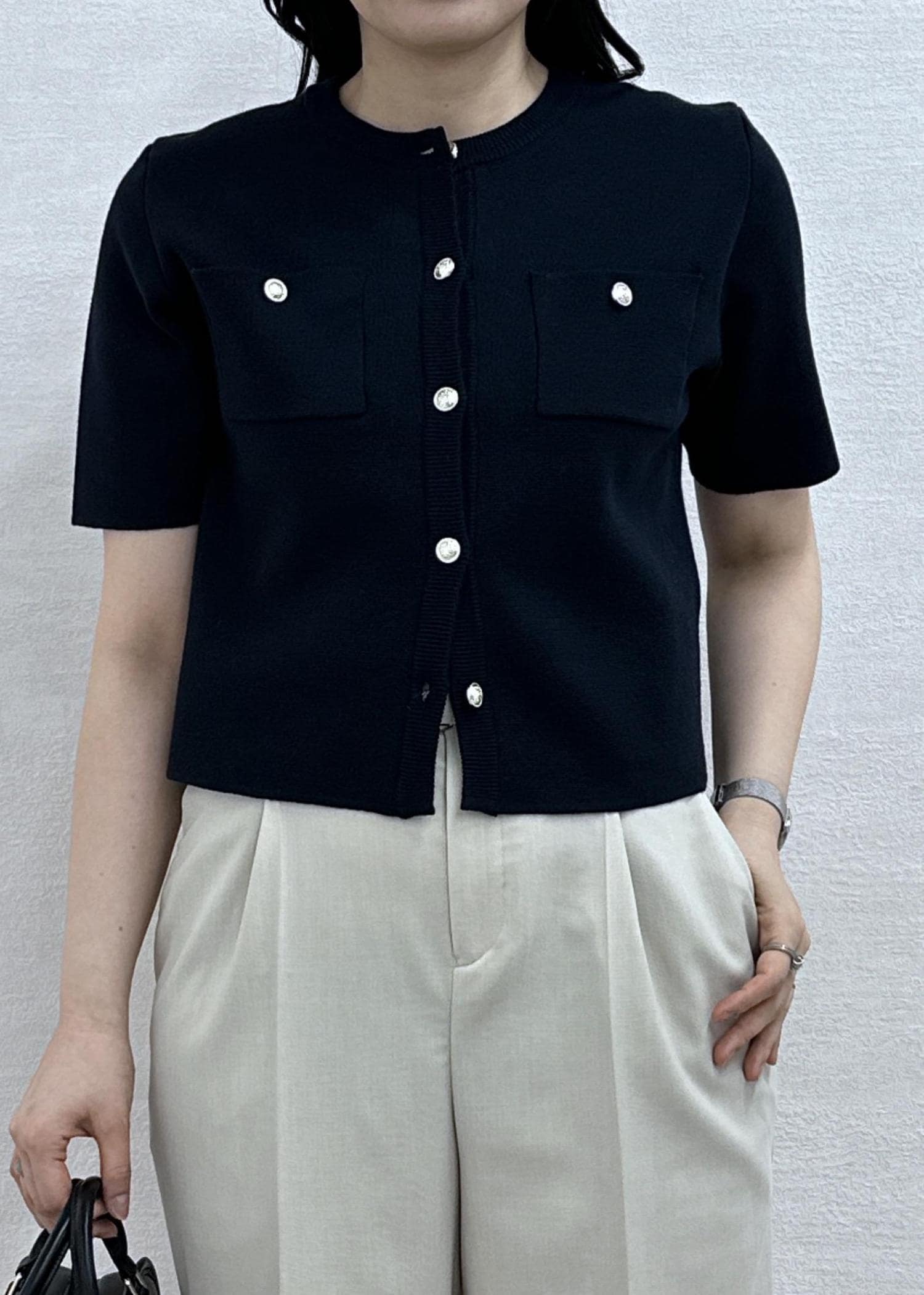 ボタンが華やかな印象になりきちんと感があり、お仕事からおでかけまで幅広く着回せます!