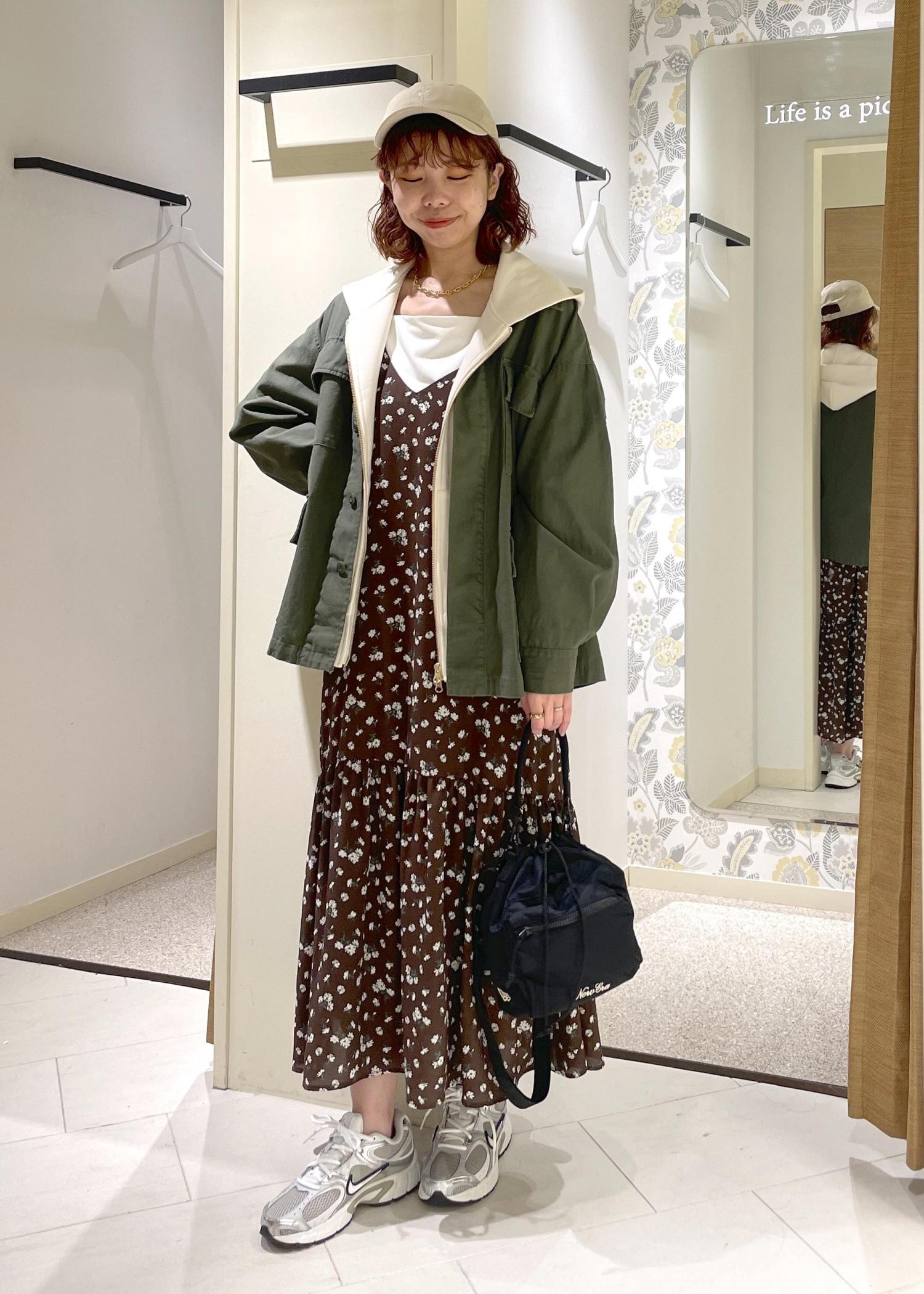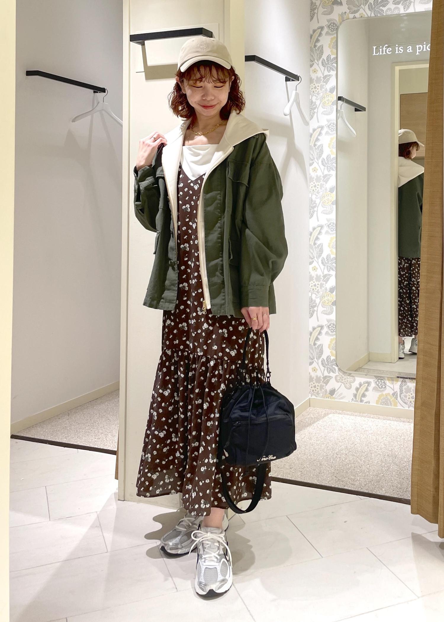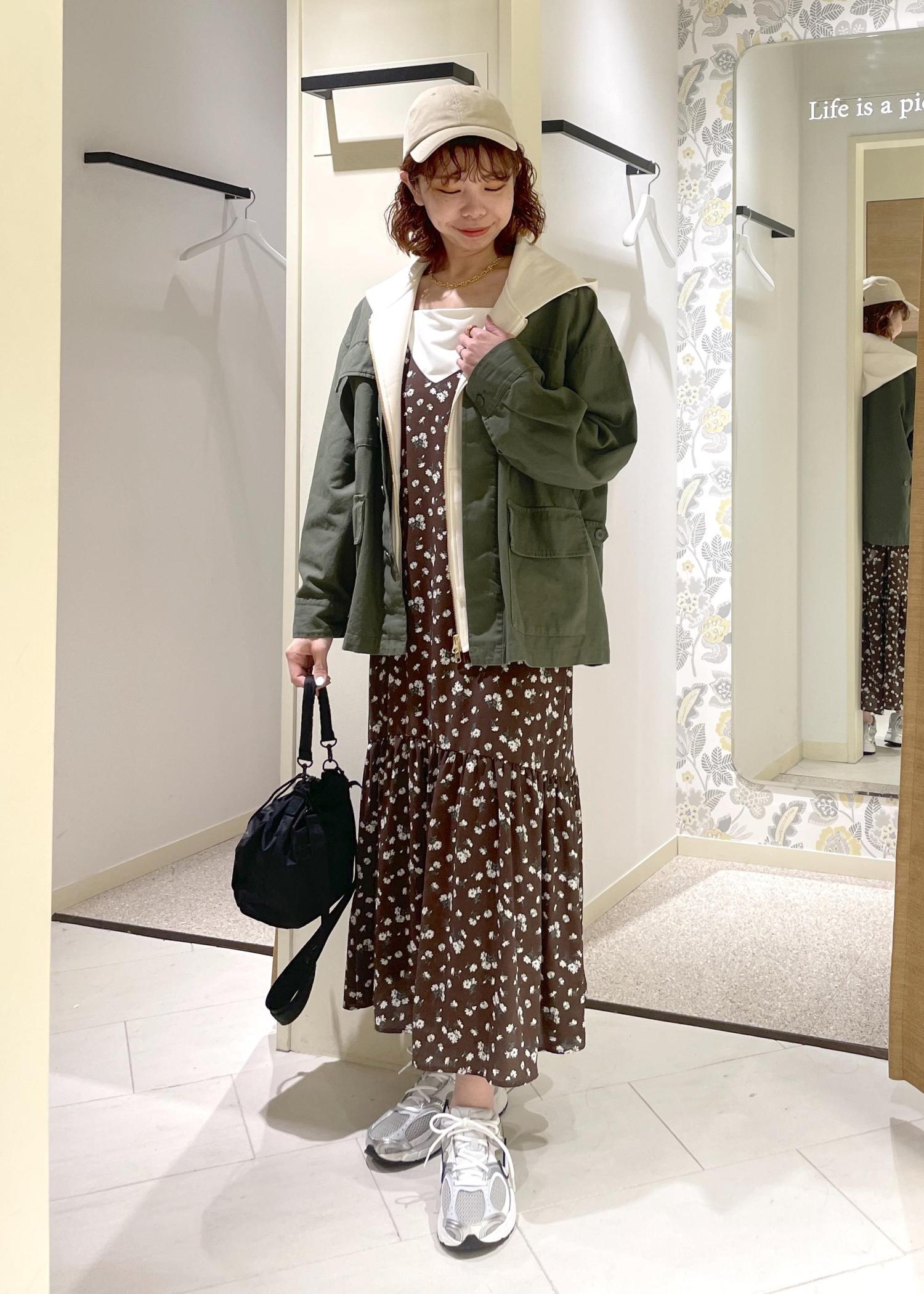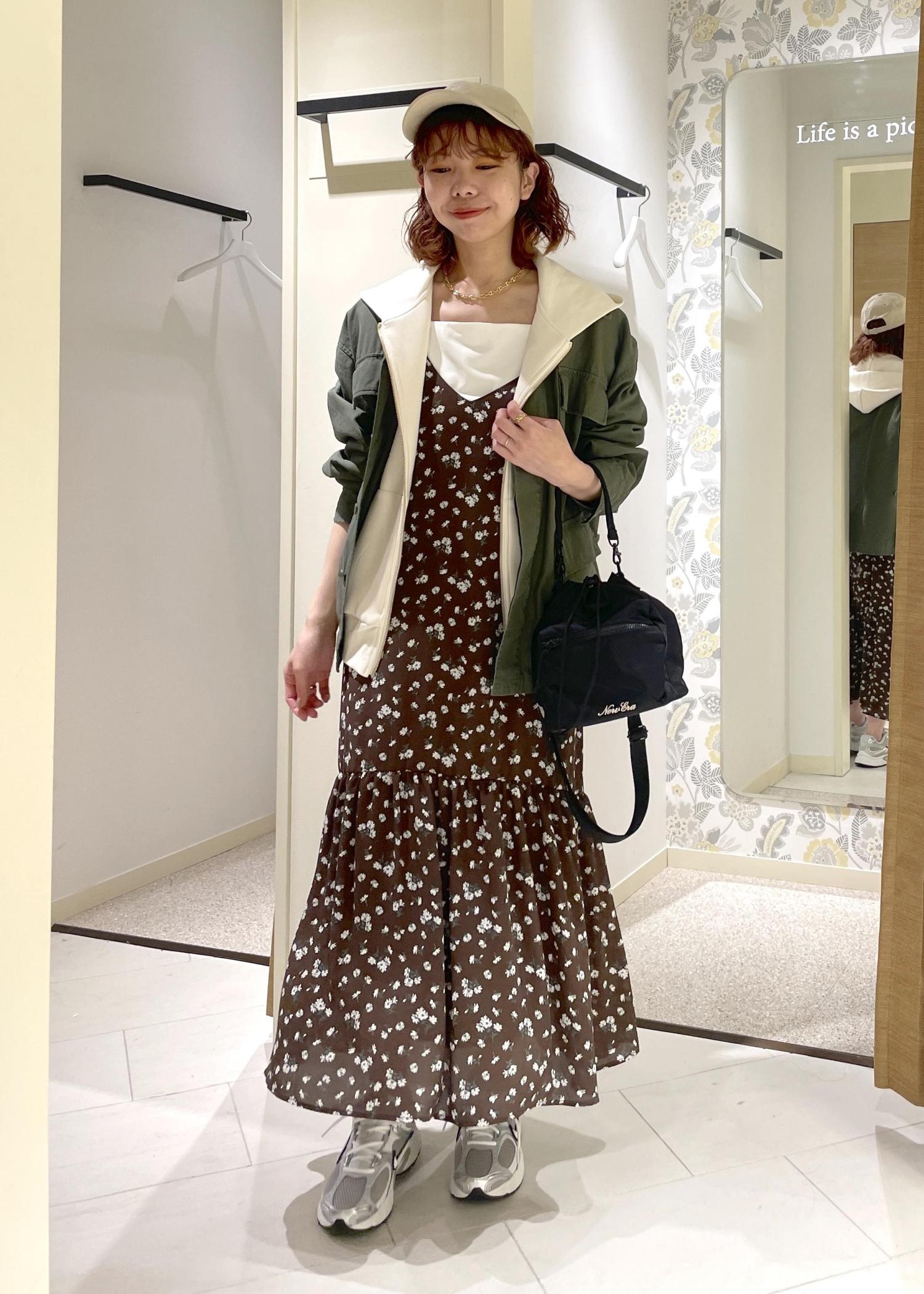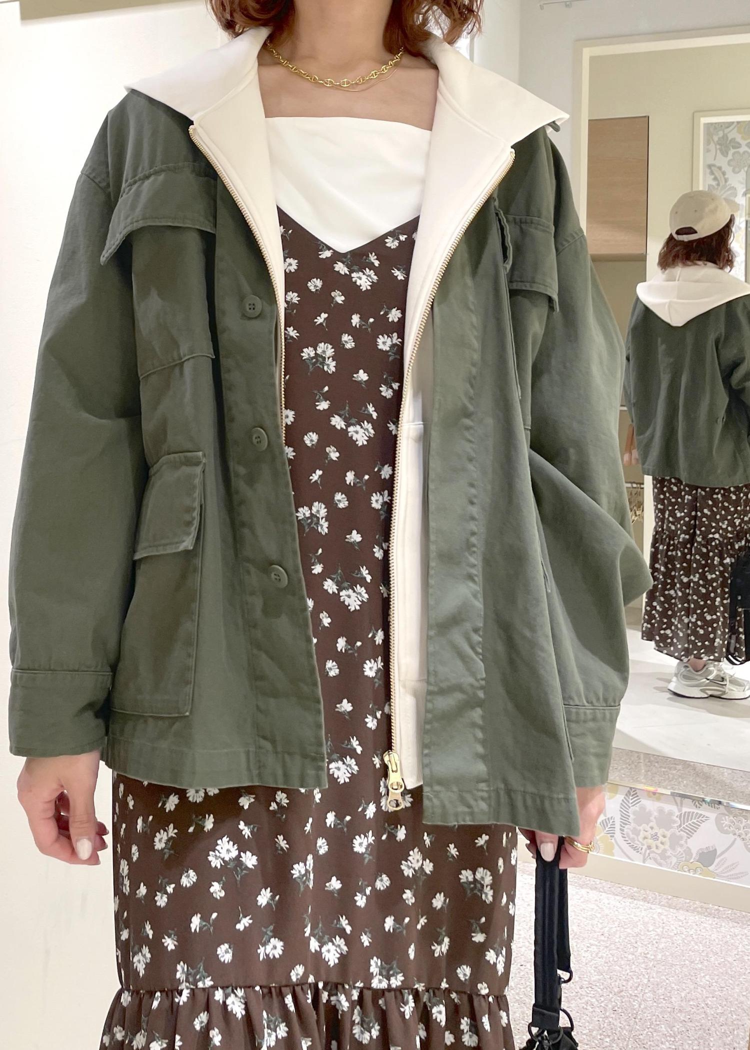 小花柄とティアードのデザインが可愛らしいキャミワンピースに、甘さを中和してくれるパーカー・ミリタリーブルゾンを合わせて、カジュアルにまとめてみました。