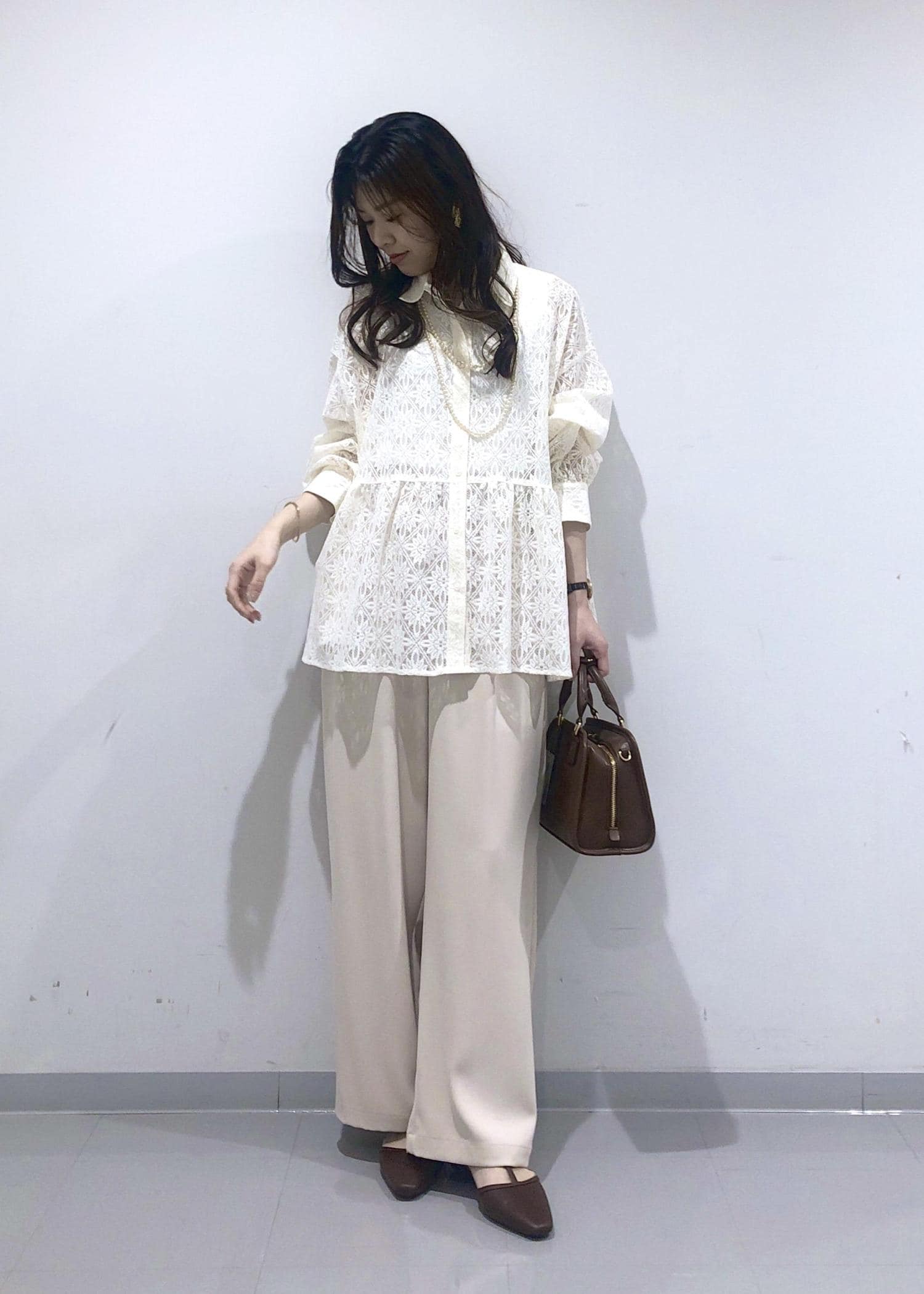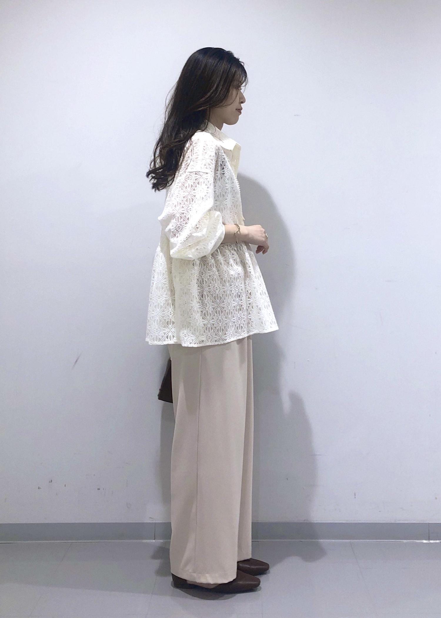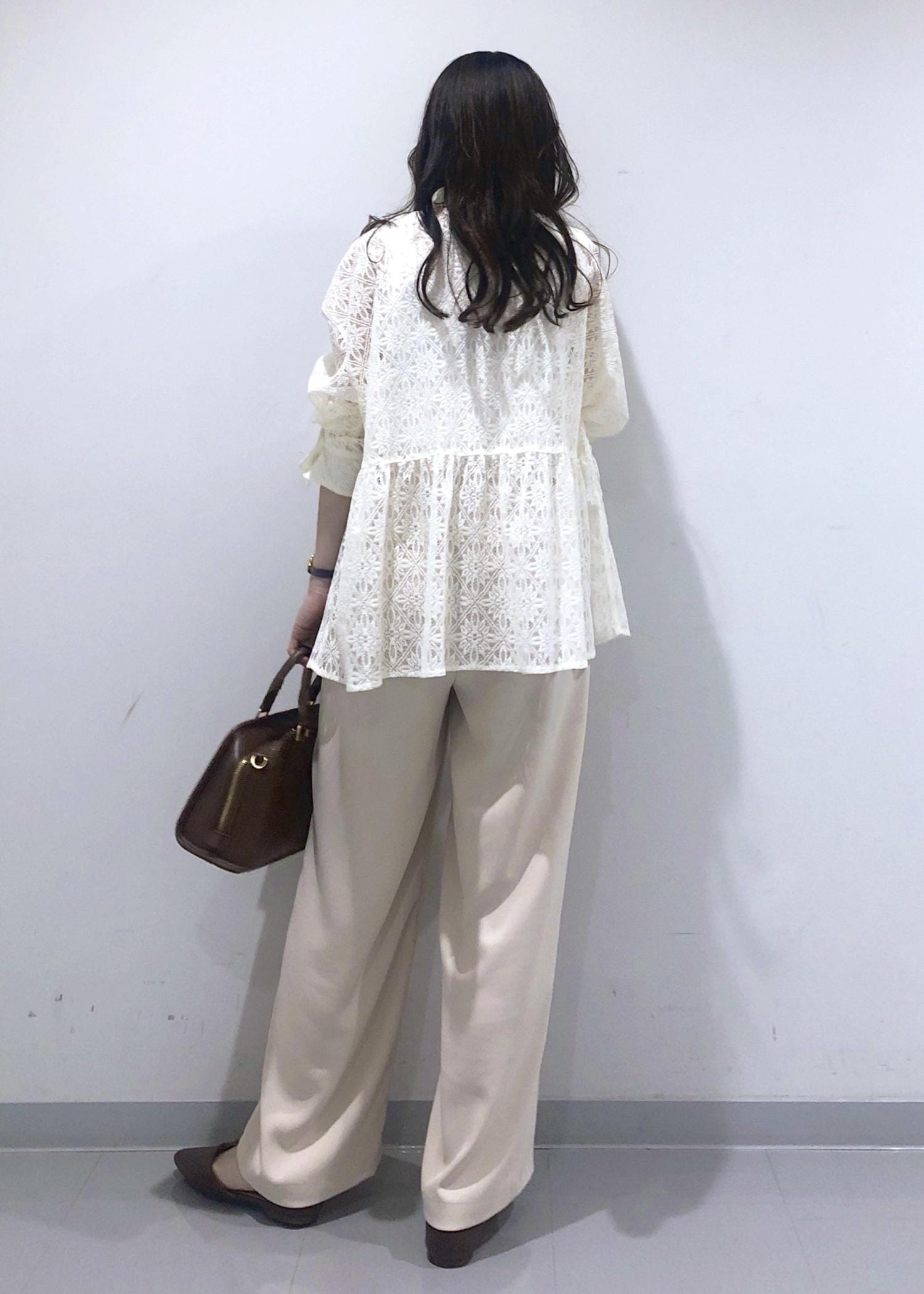 レース素材のペプラムブラウスが華やかで軽やかな印象の、春にぴったりなベージュワントーンコーデ!