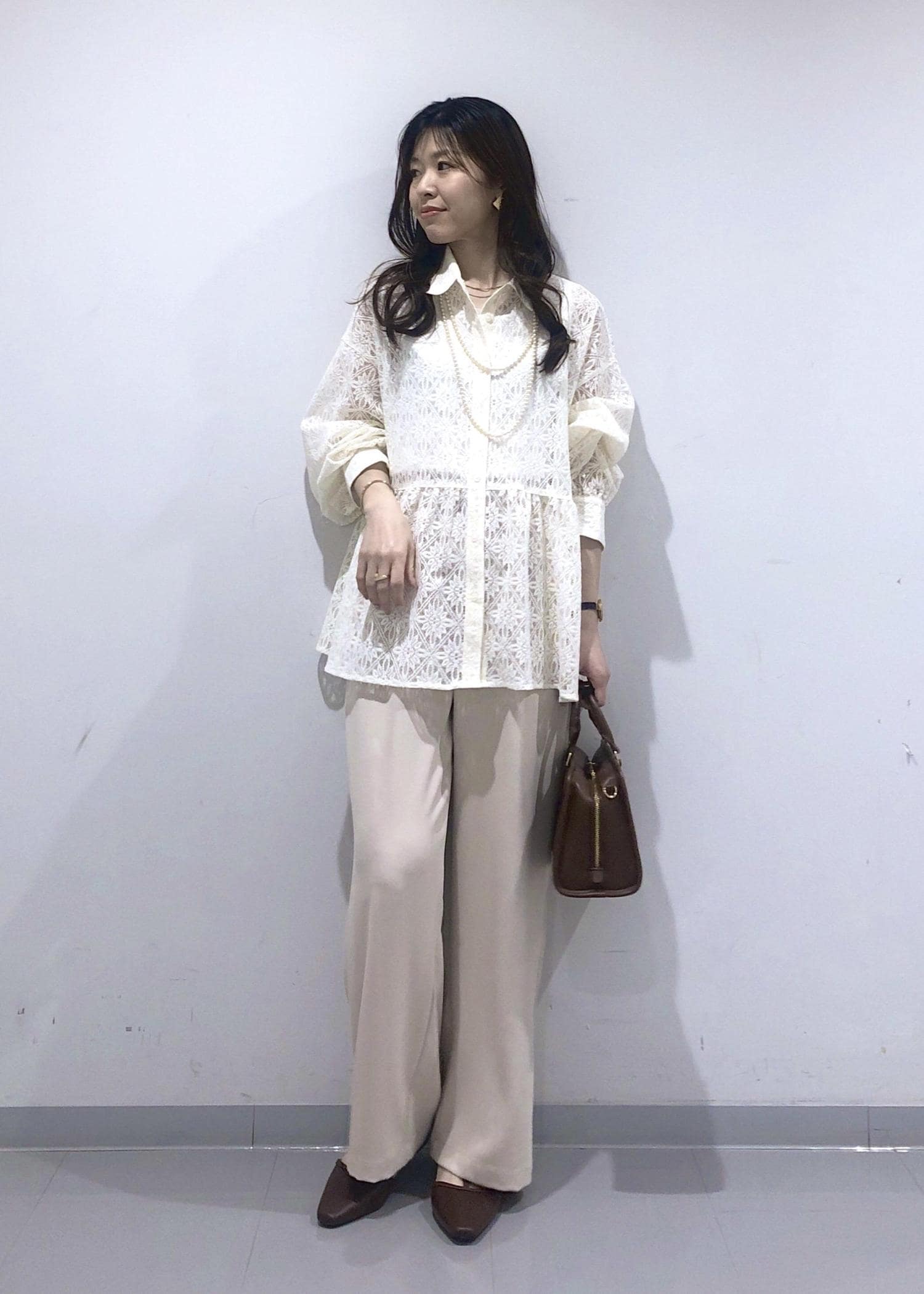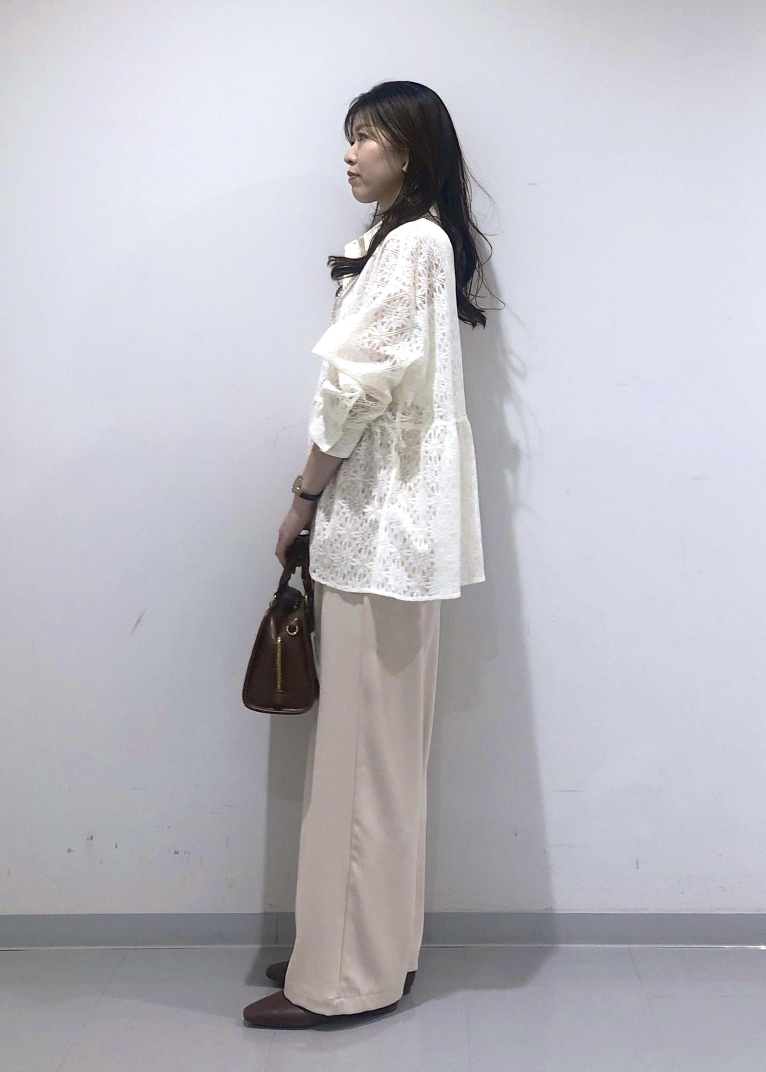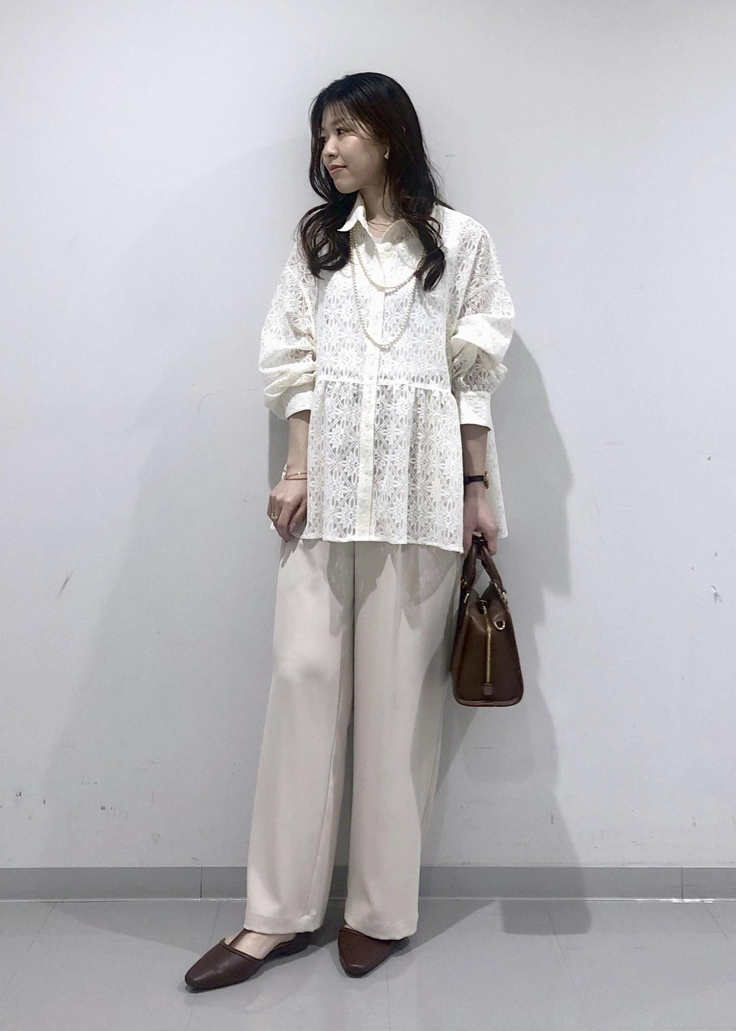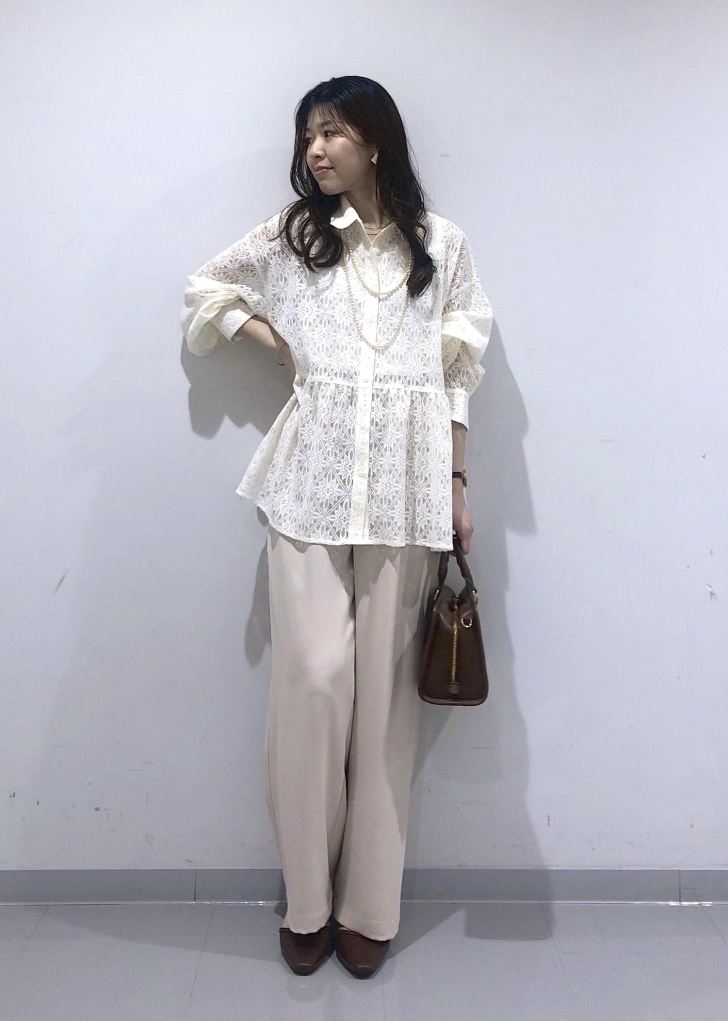 レース素材のペプラムブラウスが華やかで軽やかな印象の、春にぴったりなベージュワントーンコーデ!
