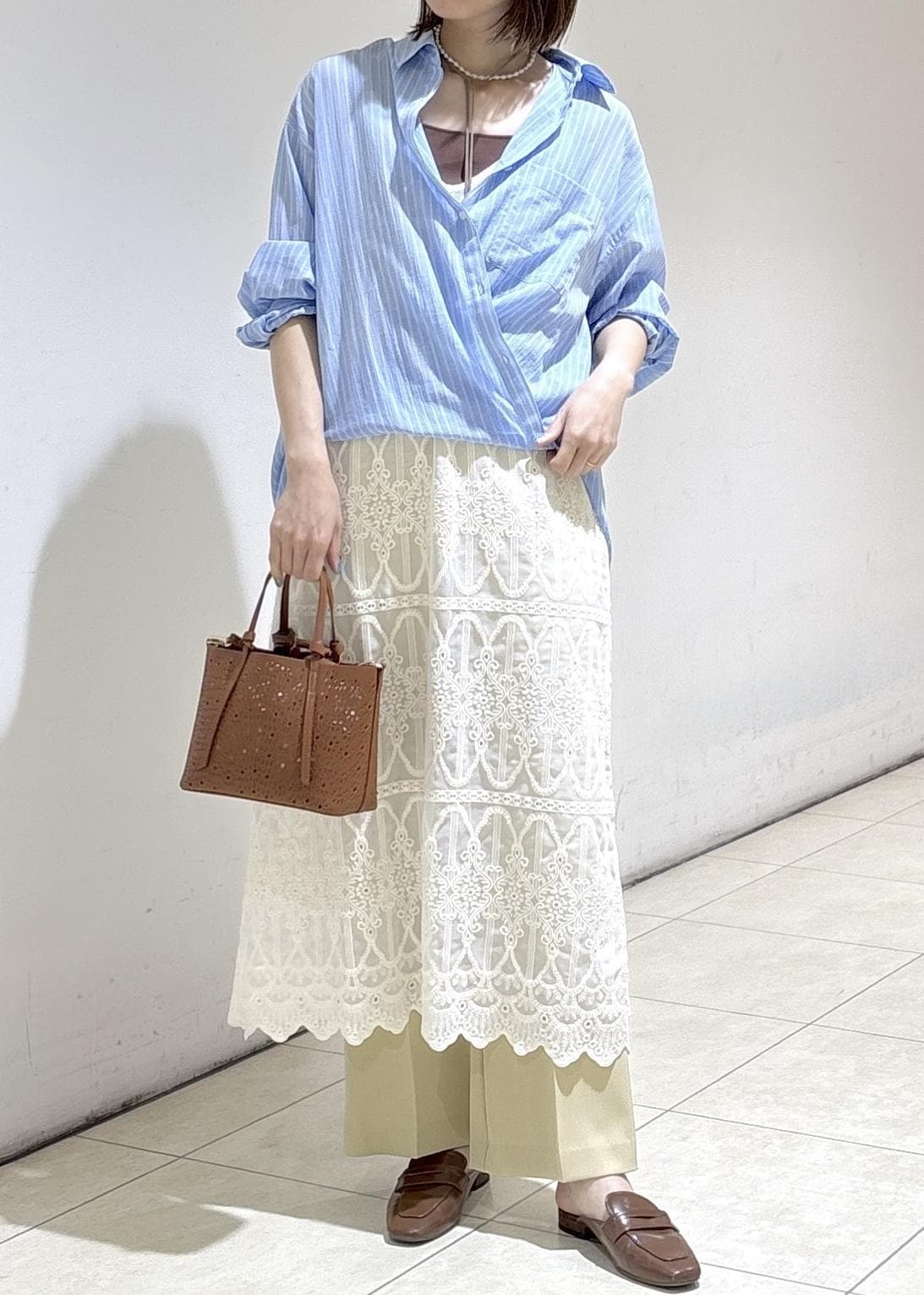 ブルーシャツを合わせた大人カジュアルコーデ。