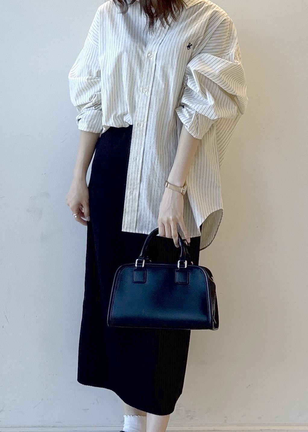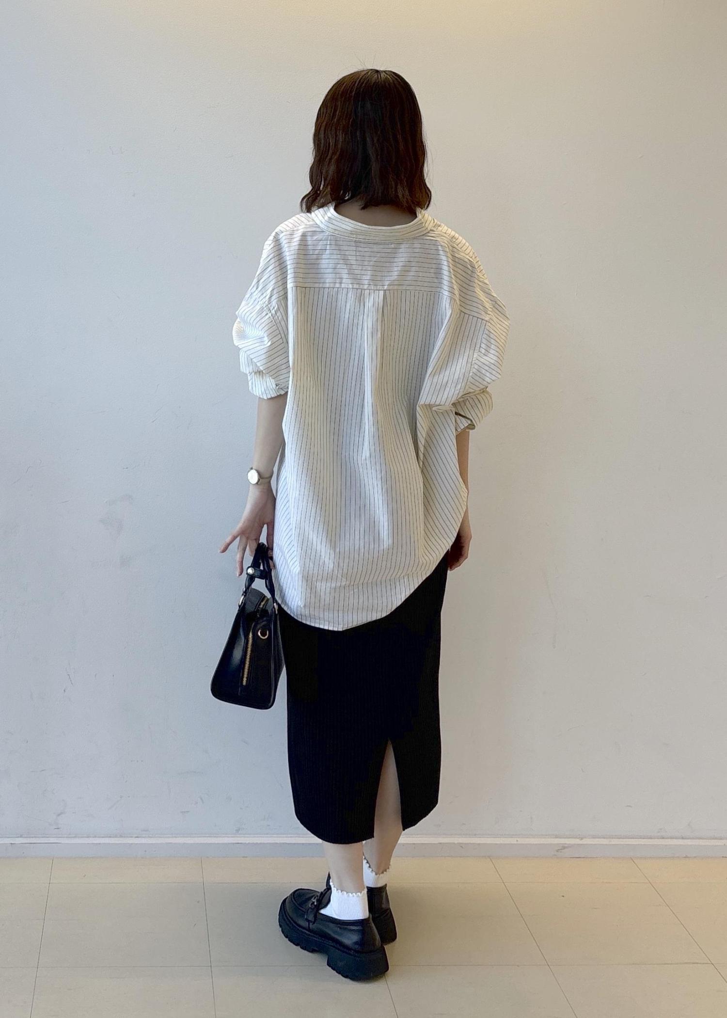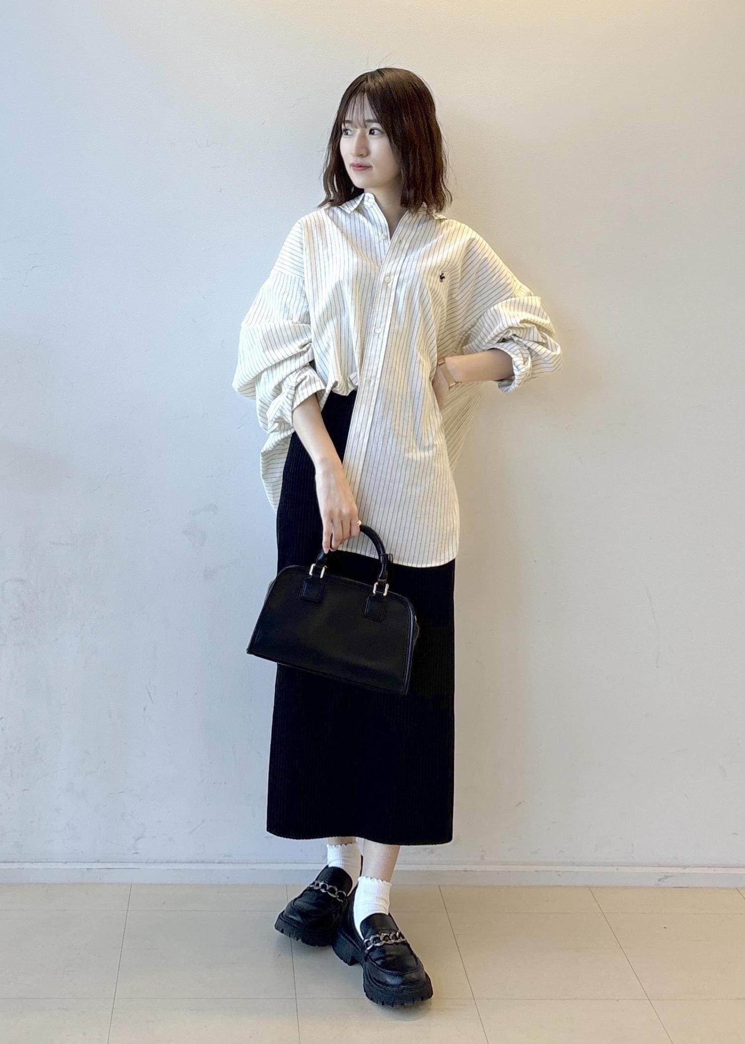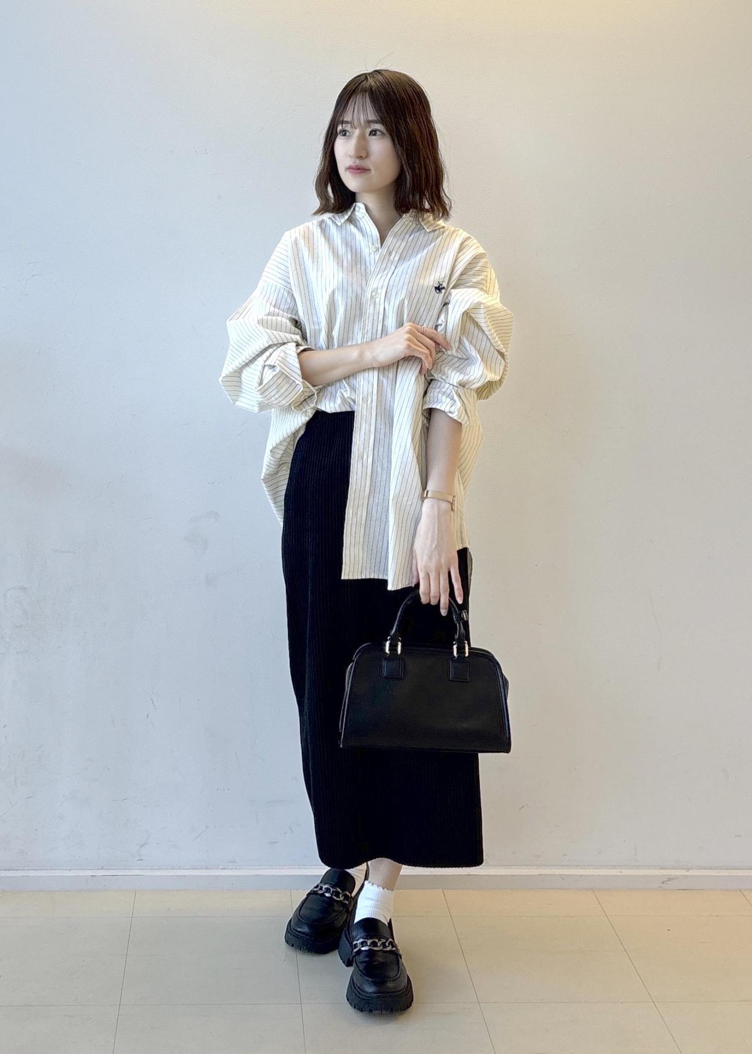 オーバーサイズなシャツなので下はタイトスカートを合わせて、カジュアルになりすぎず女性らさもプラスしてみました♡