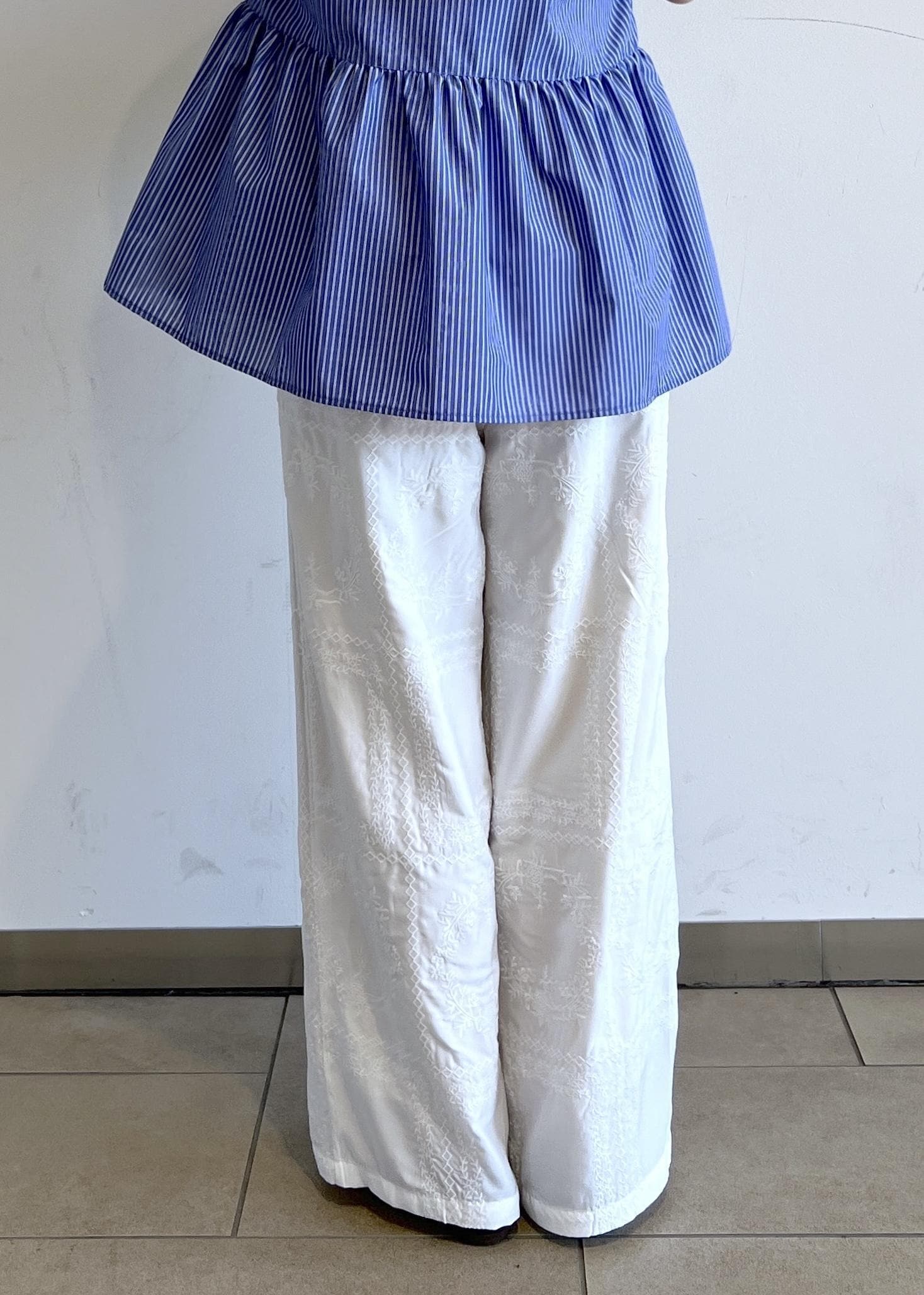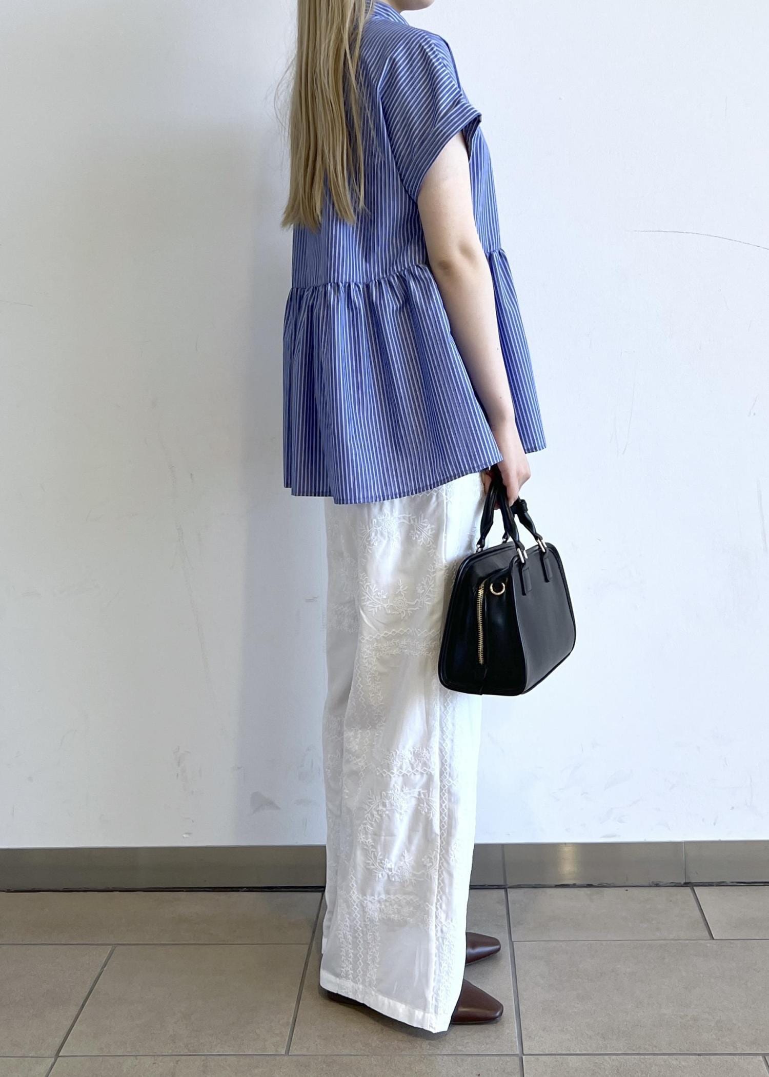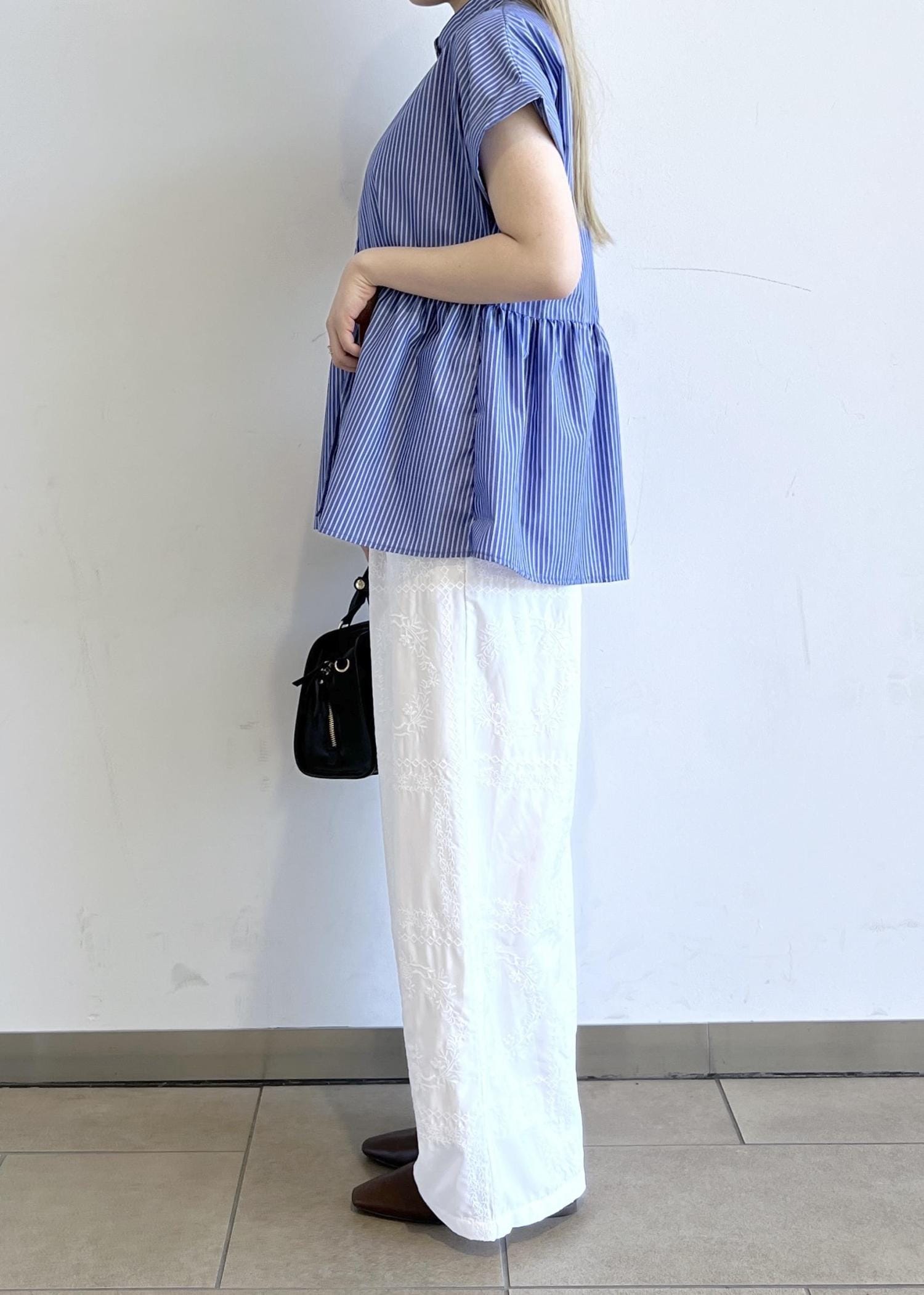 刺繍デザインのワイドパンツを合わせて、リラックス感のあるきれいめカジュアルにしました。