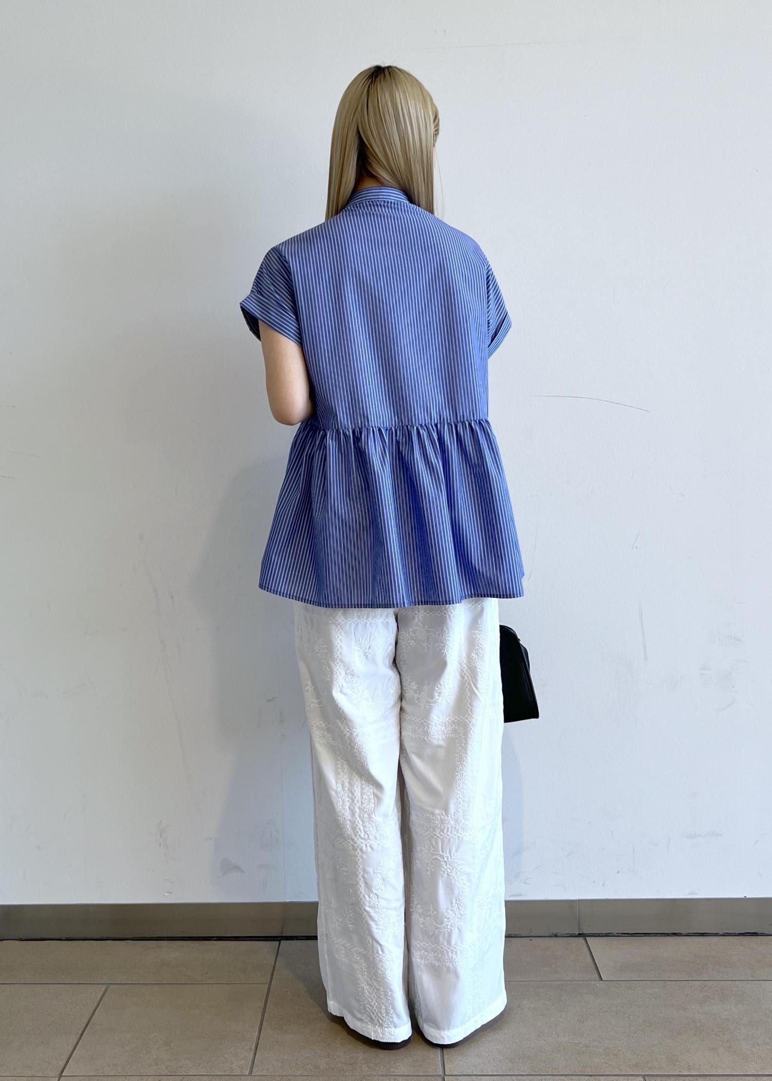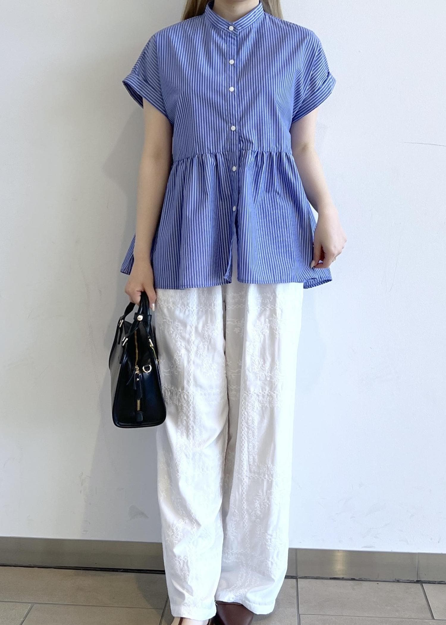 ブルーのブラウスを主役にした爽やかな夏コーデです◎