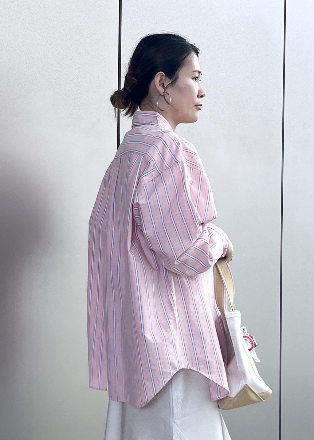サーモンピンクのようなオレンジ色がかわいいシャツコーデのご紹介です。