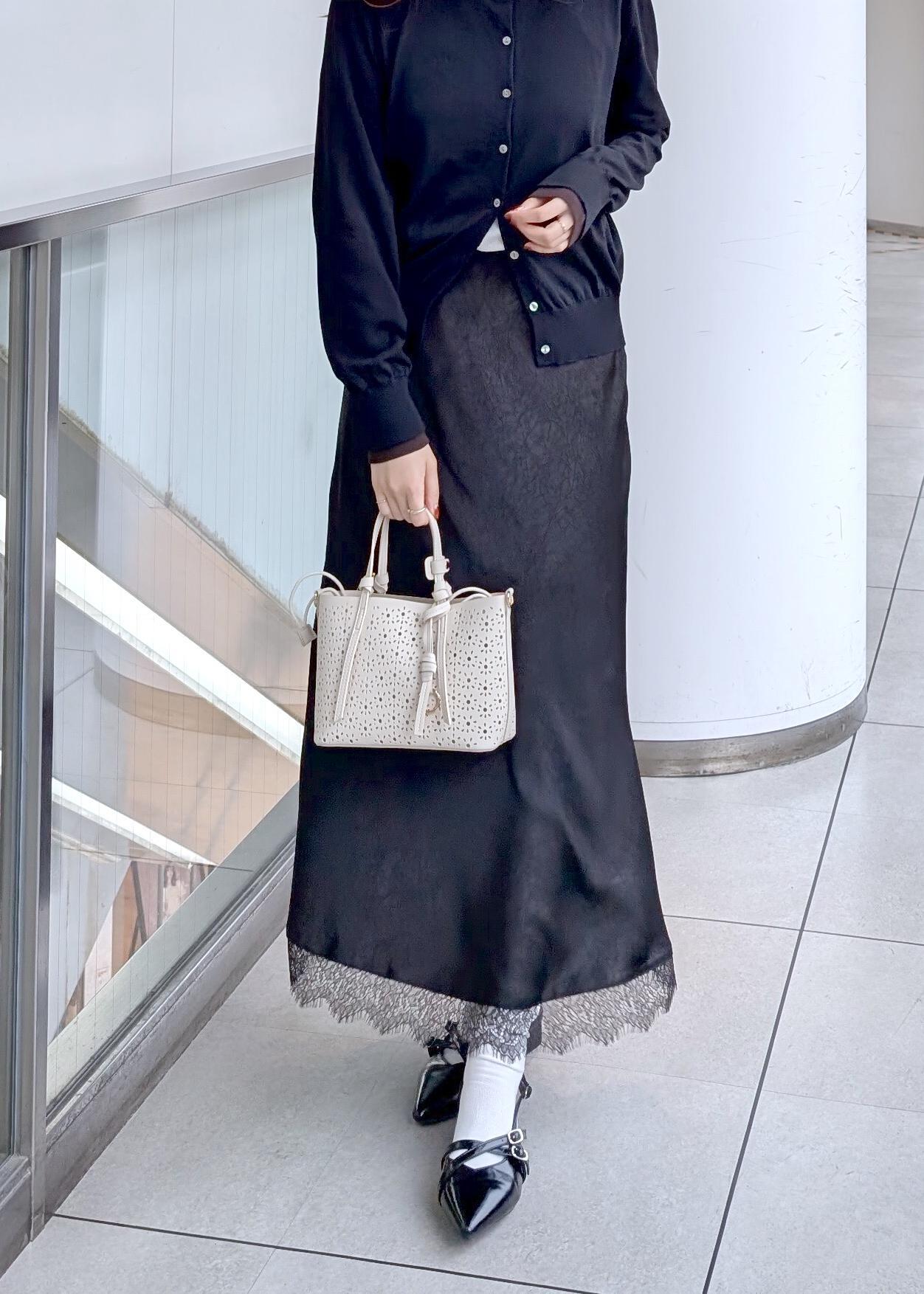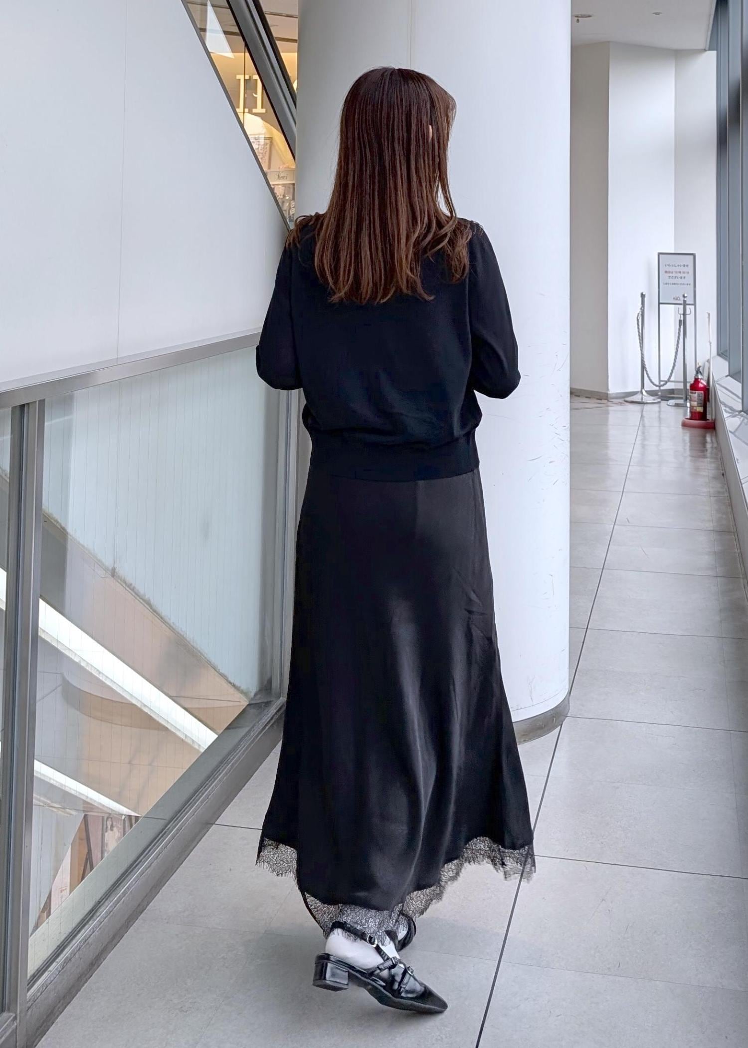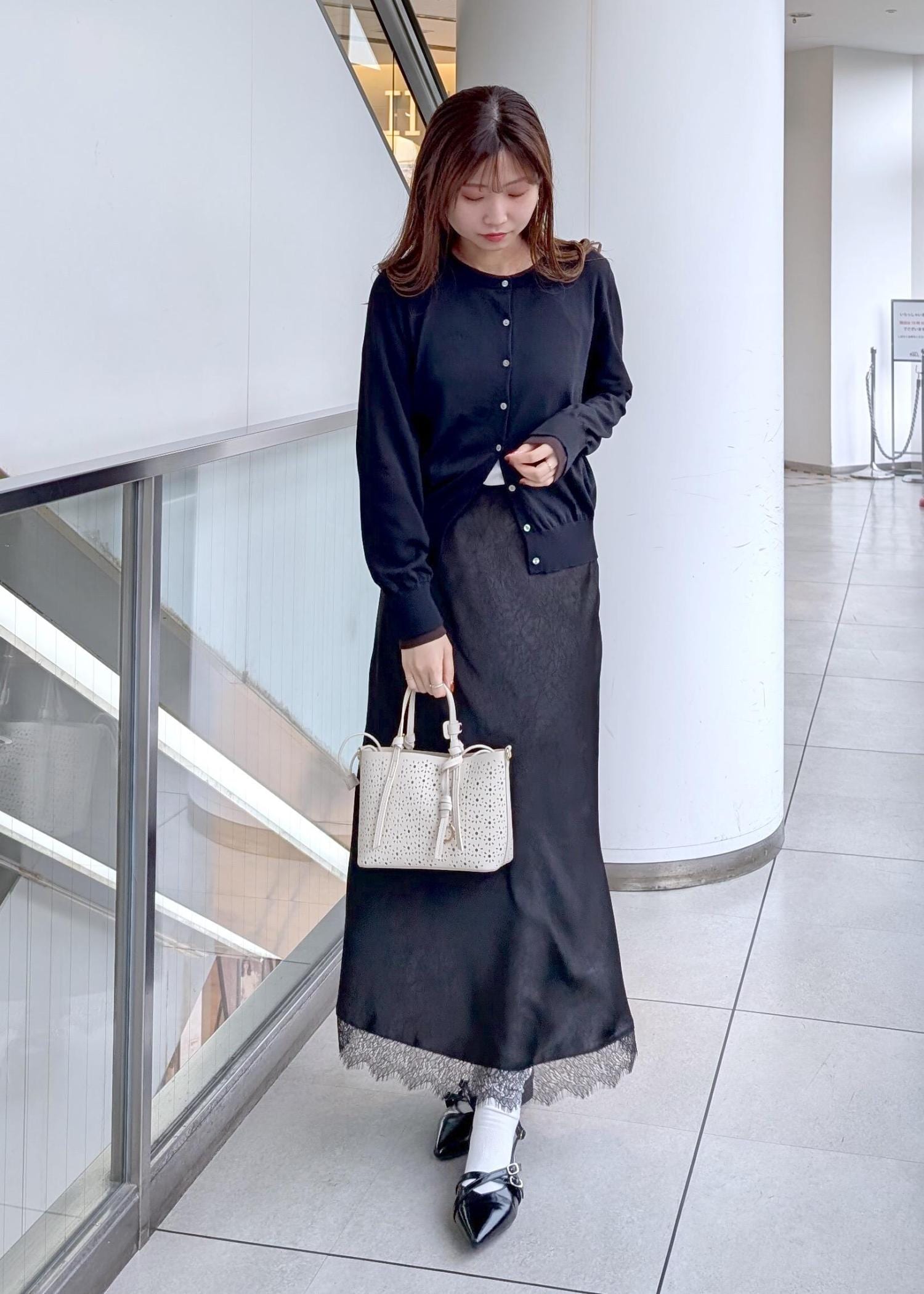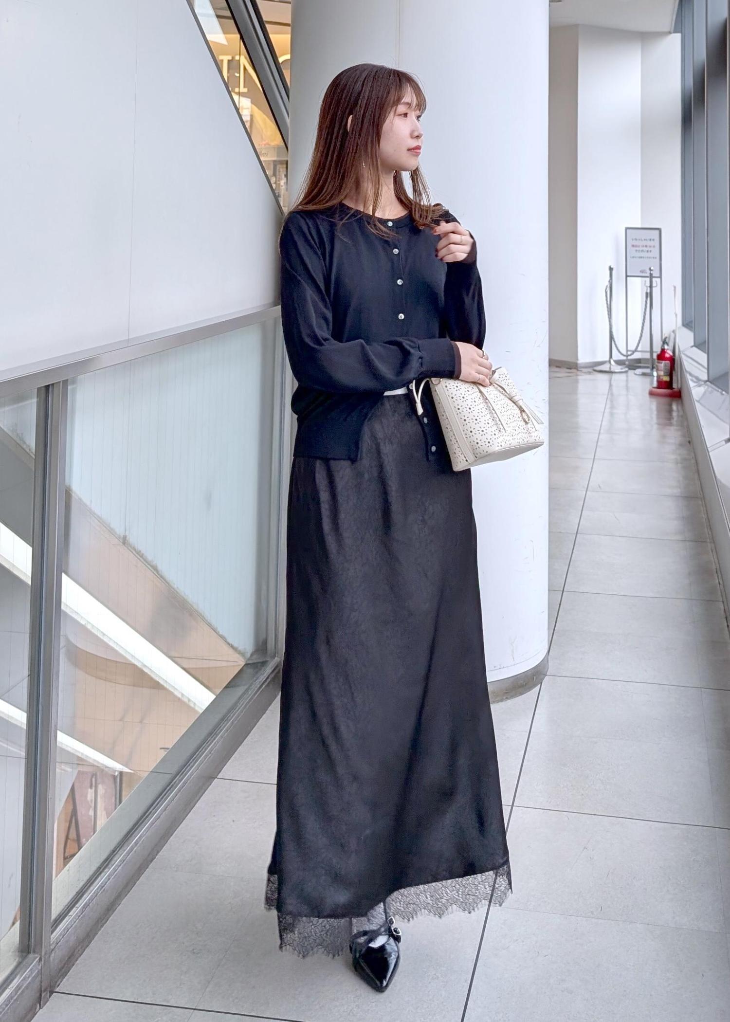 配色カーディガンと裾レースのスカートを合わせたブラックコーデ。