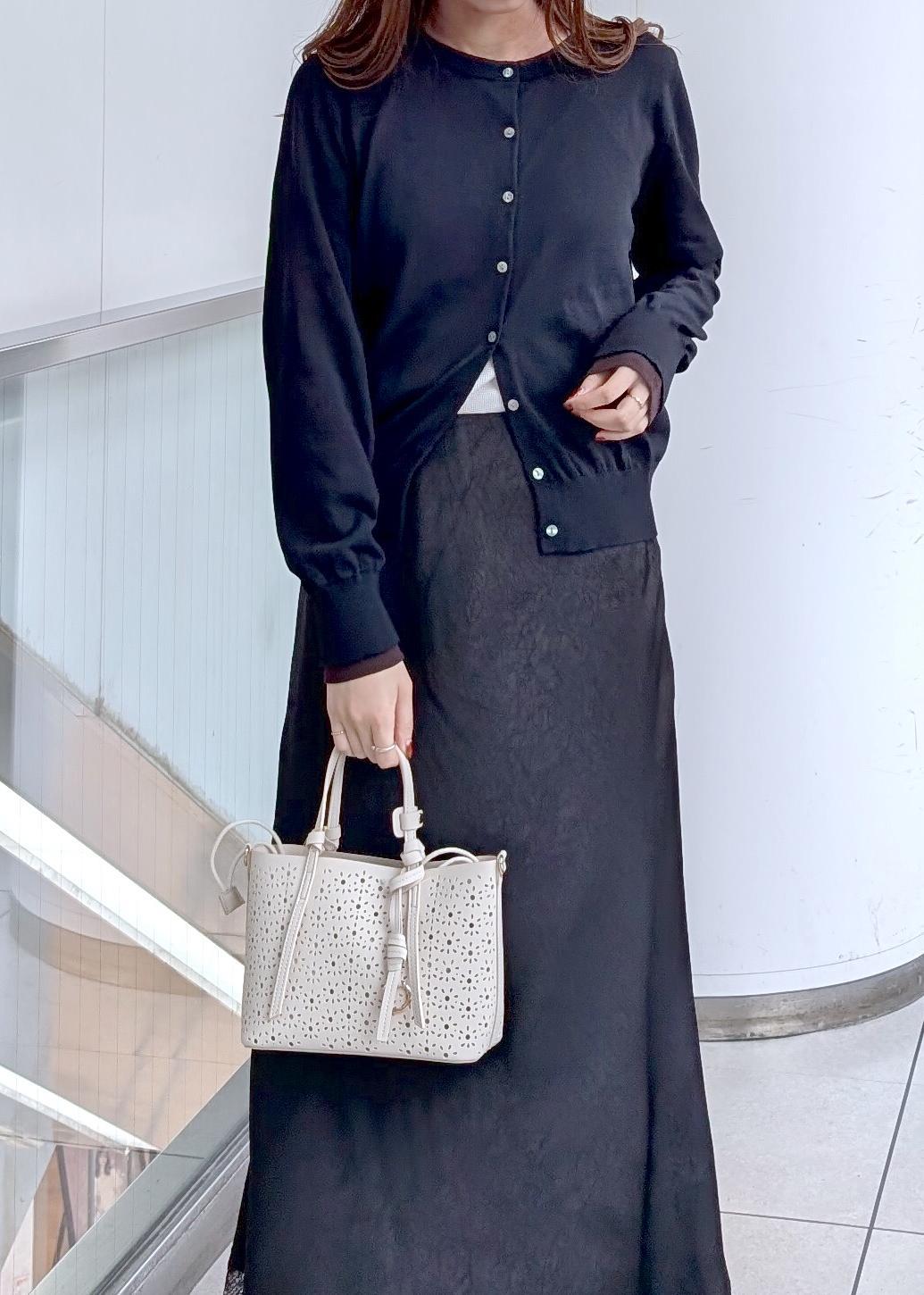 カーディガンは機能性が高く夏まで使いやすい一枚で、今回は春らしくトップス使いに。