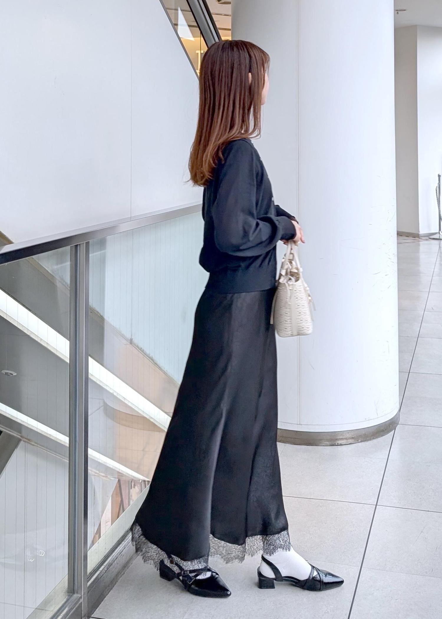 ROPÉ PICNIC裾レースロングスカートブラック / F¥6,490レビュー光沢感と裾のレースが上品で、お出掛けシーンにもぴったり。ウエストはゴムでゆとりあり、着丈は足首がしっかり見えるくらいの丈感です。軽い着心地でストレスフリーで着用できています。