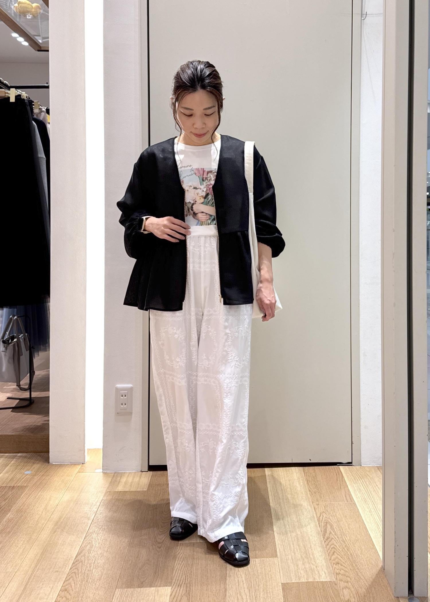 ラフなTシャツやウエストゴムのパンツで楽ちんながら、プリントやレースディテールでおしゃれに見えるコーディネートを意識してみました!