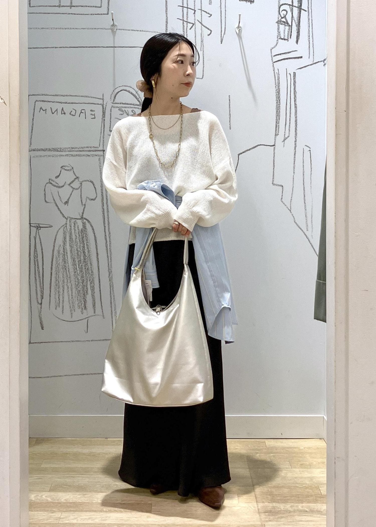 サテン素材のスカートを合わせて
