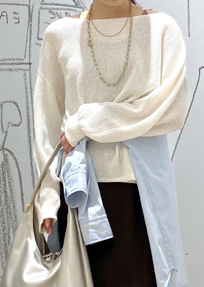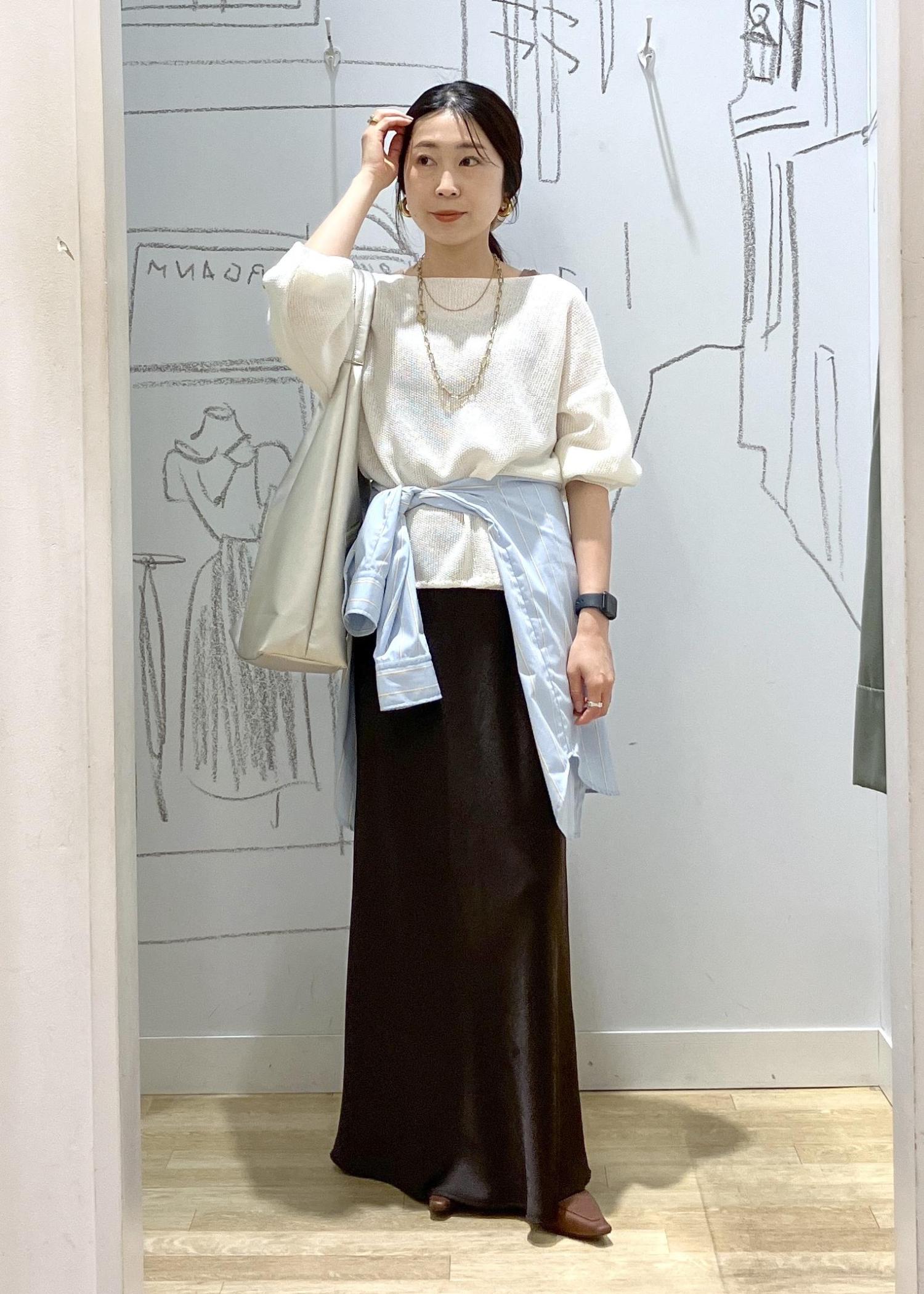 メッシュニットのスカート合わせスタイル。