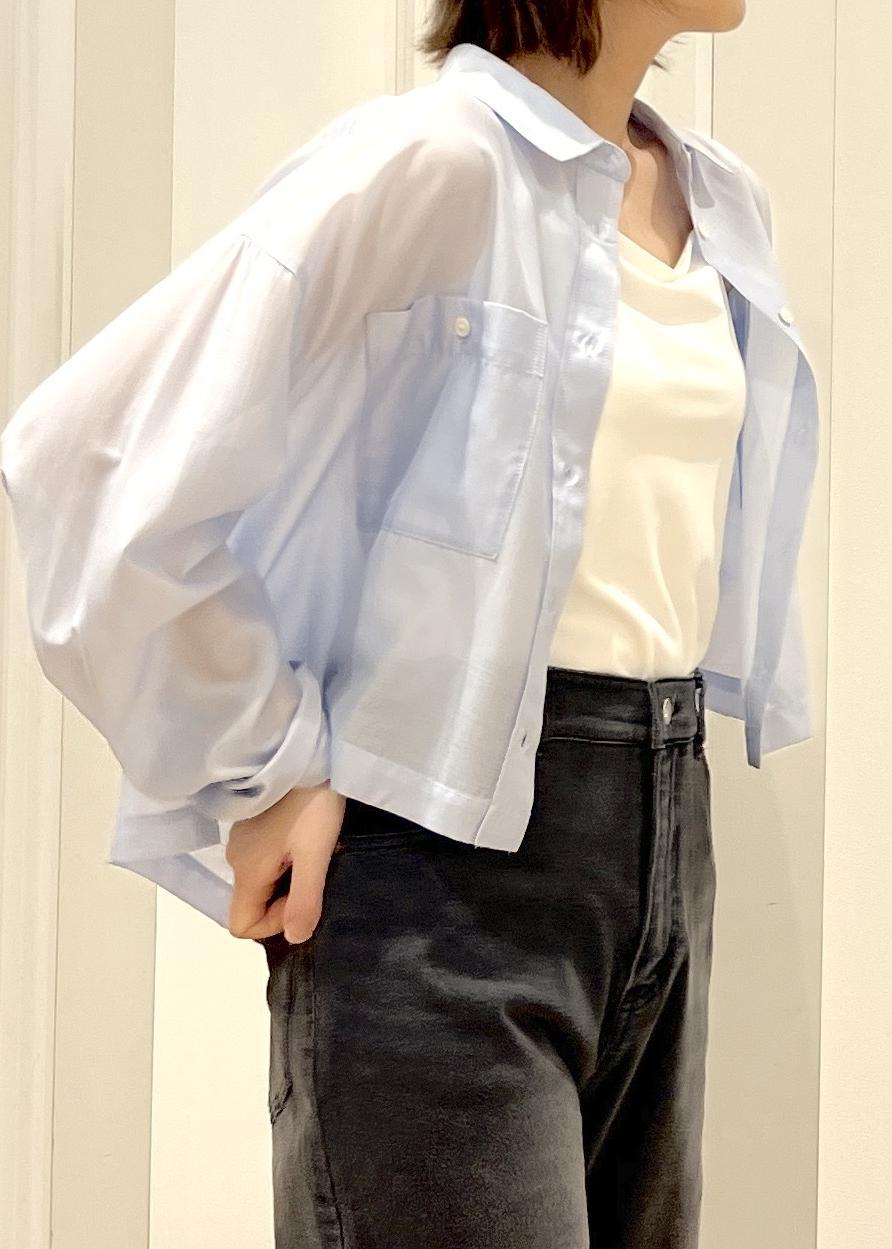 カジュアルすぎないように、シアー素材のシャツで女性らしく。