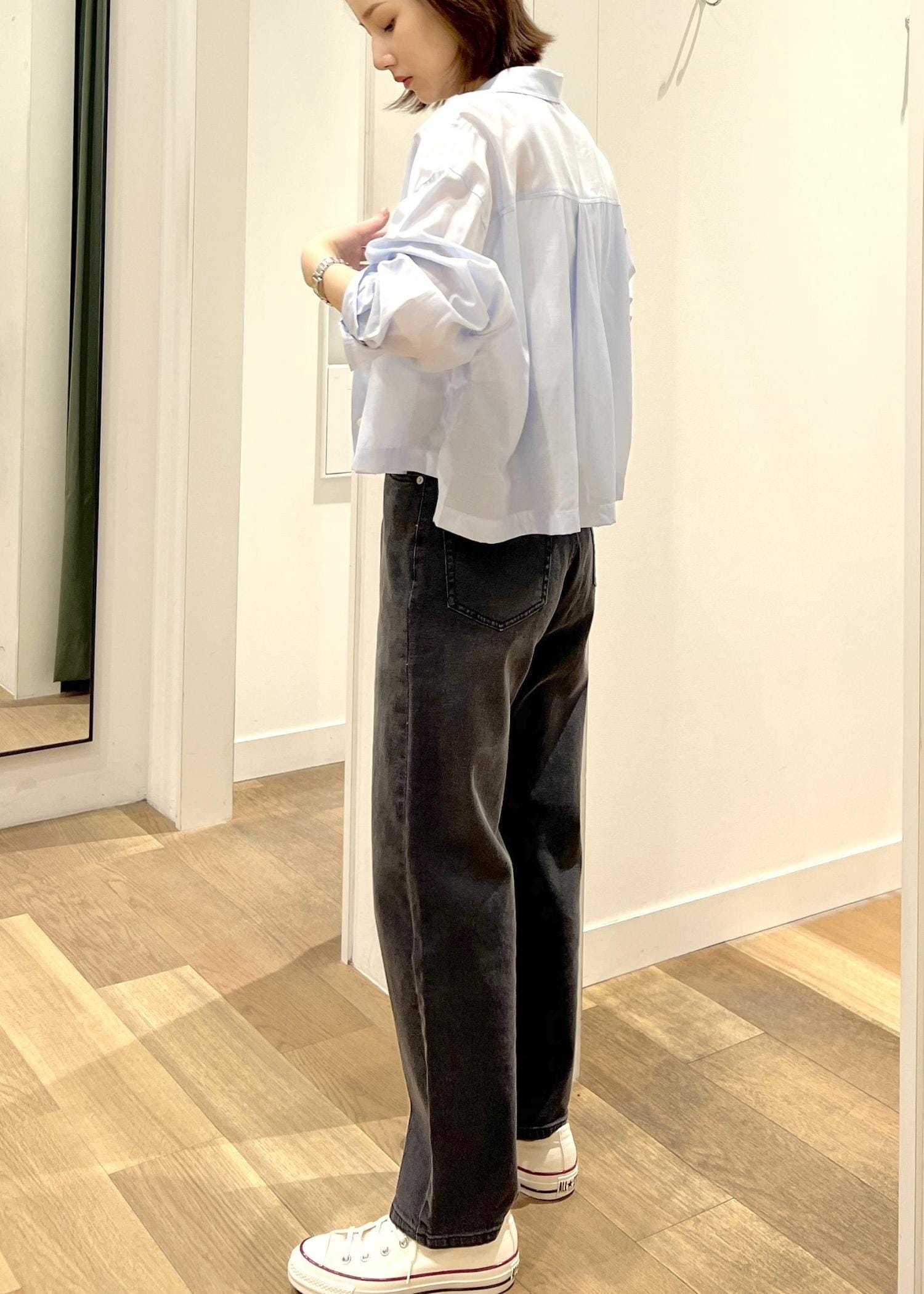 コンパクトな丈感なのでボトムも選ばず、すっきりしたスタイルに。