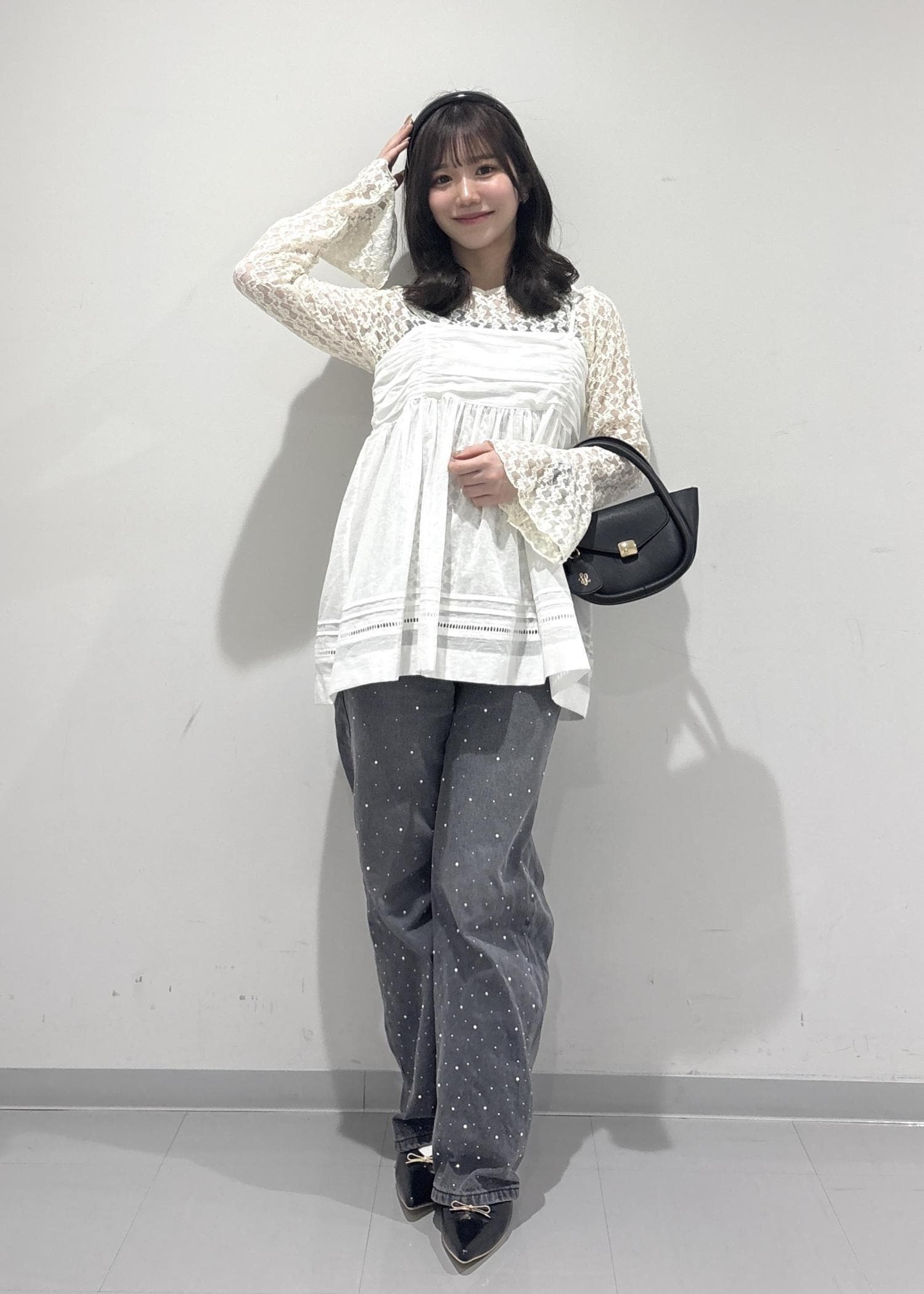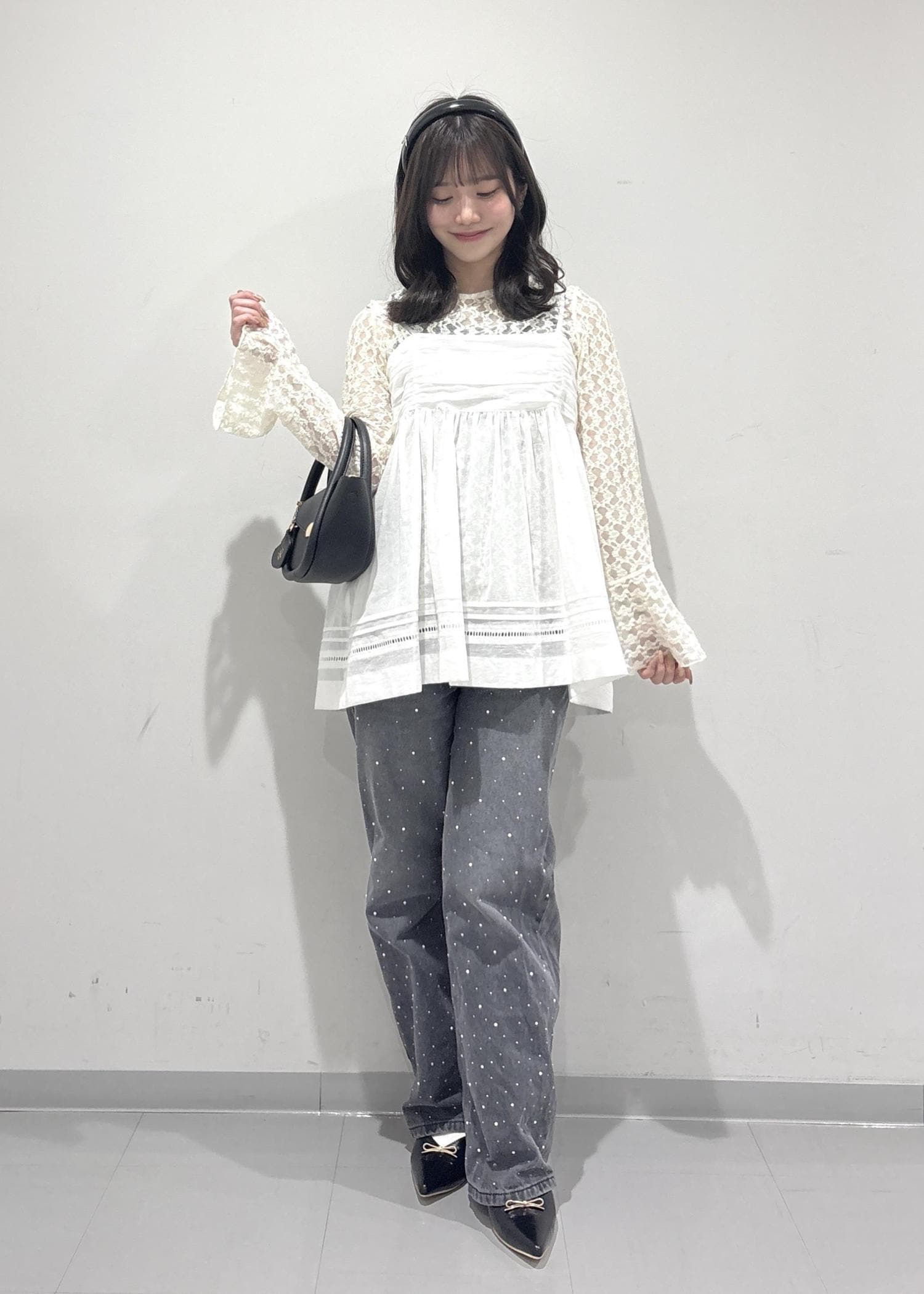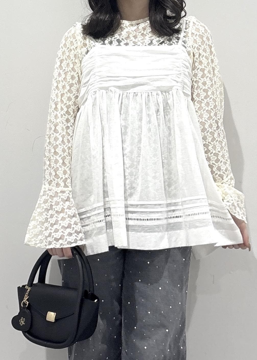こちらのコーデのポイントは、レースのビスチェで可愛さやゆるっと感を出して、ビジューのデニムでカジュアルっぽく抜け感を出してみました!黒バッグとパンプスは黒で統一感を出し、少し大人っぽく引き締めて全体的に甘すぎずカジュアル感も取り入れた甘辛コーデを組んで見ました!