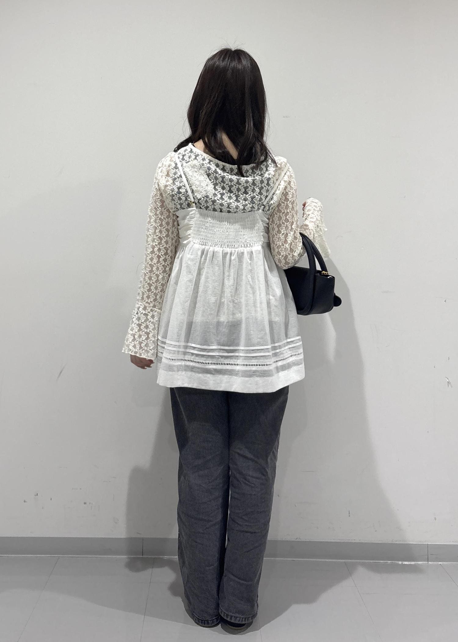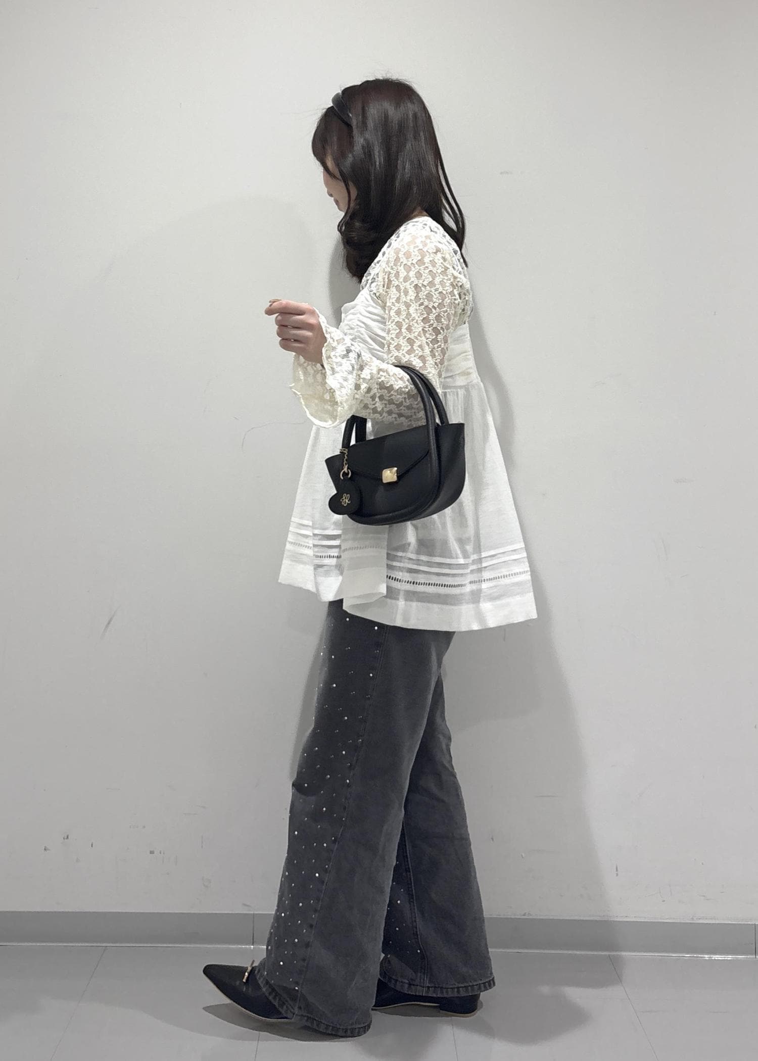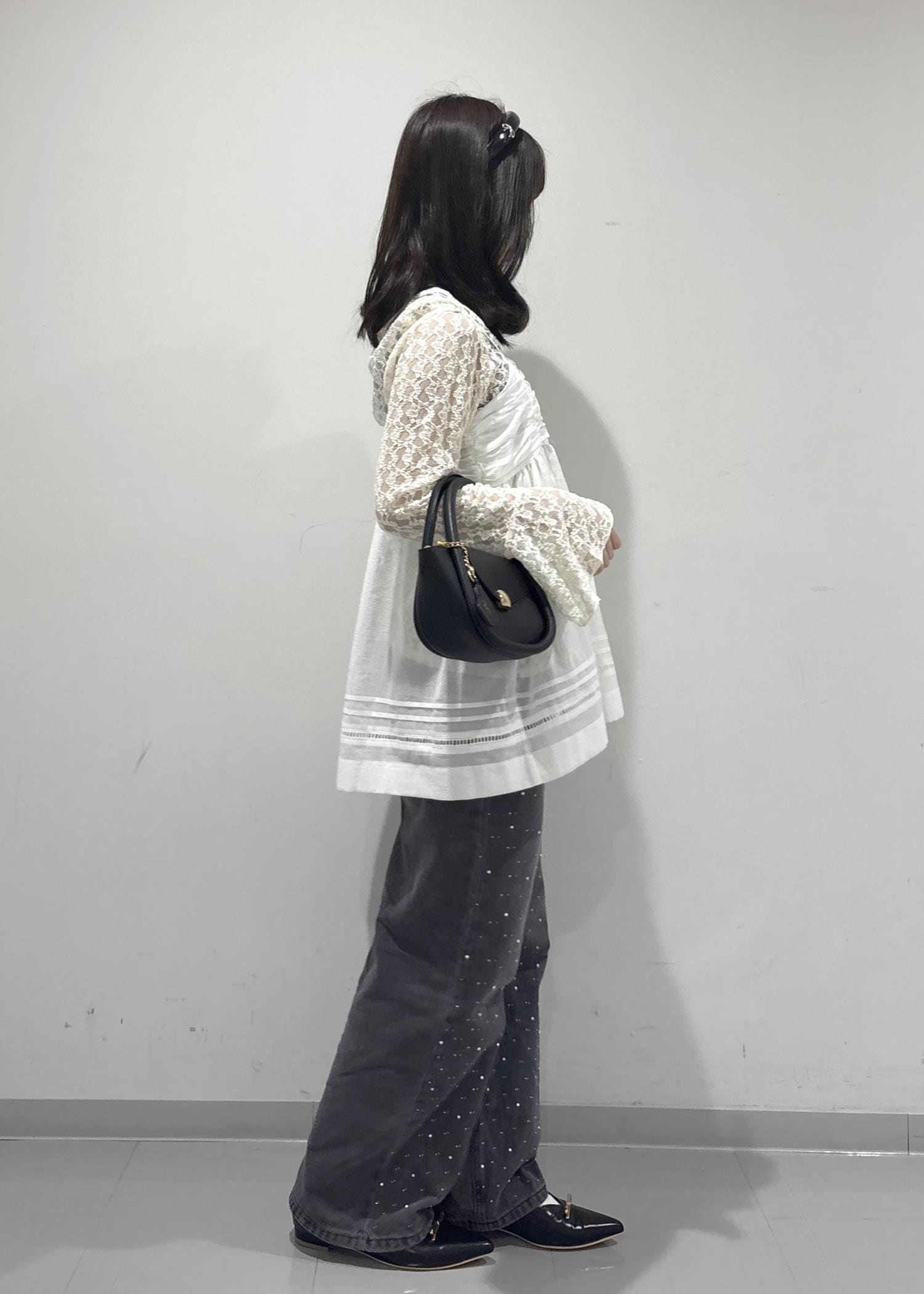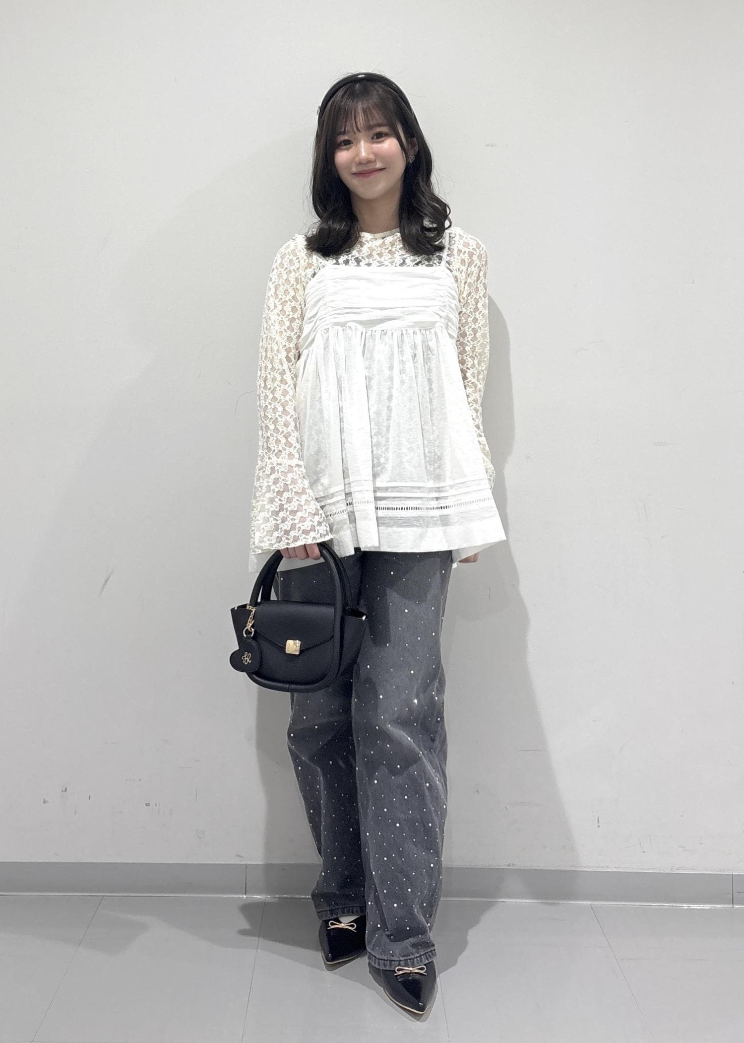 こちらのコーデのポイントは、レースのビスチェで可愛さやゆるっと感を出して、ビジューのデニムでカジュアルっぽく抜け感を出してみました!黒バッグとパンプスは黒で統一感を出し、少し大人っぽく引き締めて全体的に甘すぎずカジュアル感も取り入れた甘辛コーデを組んで見ました!