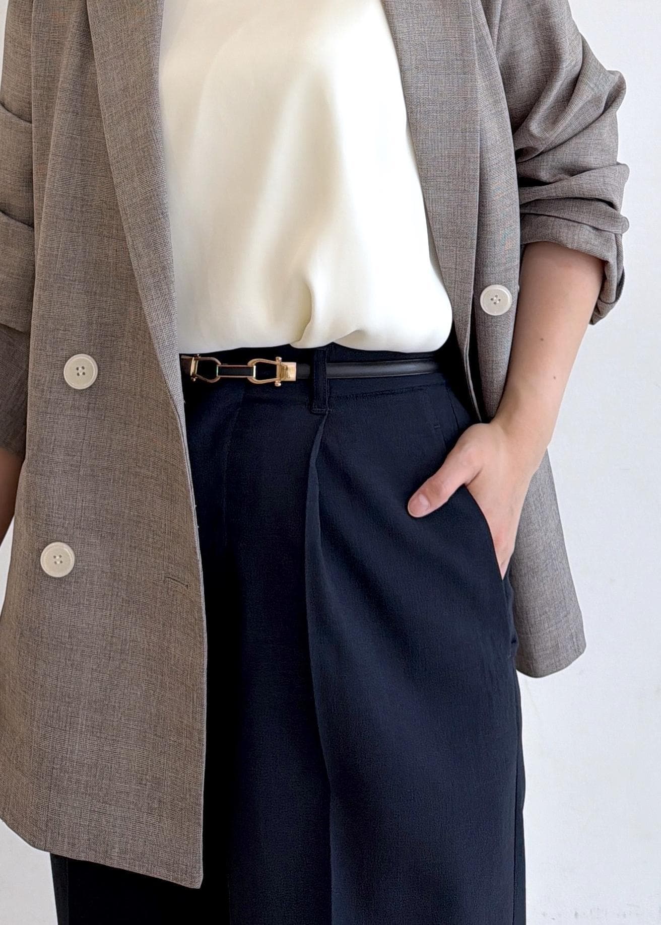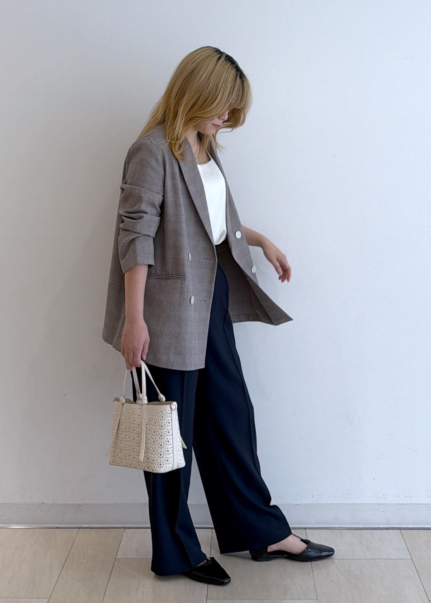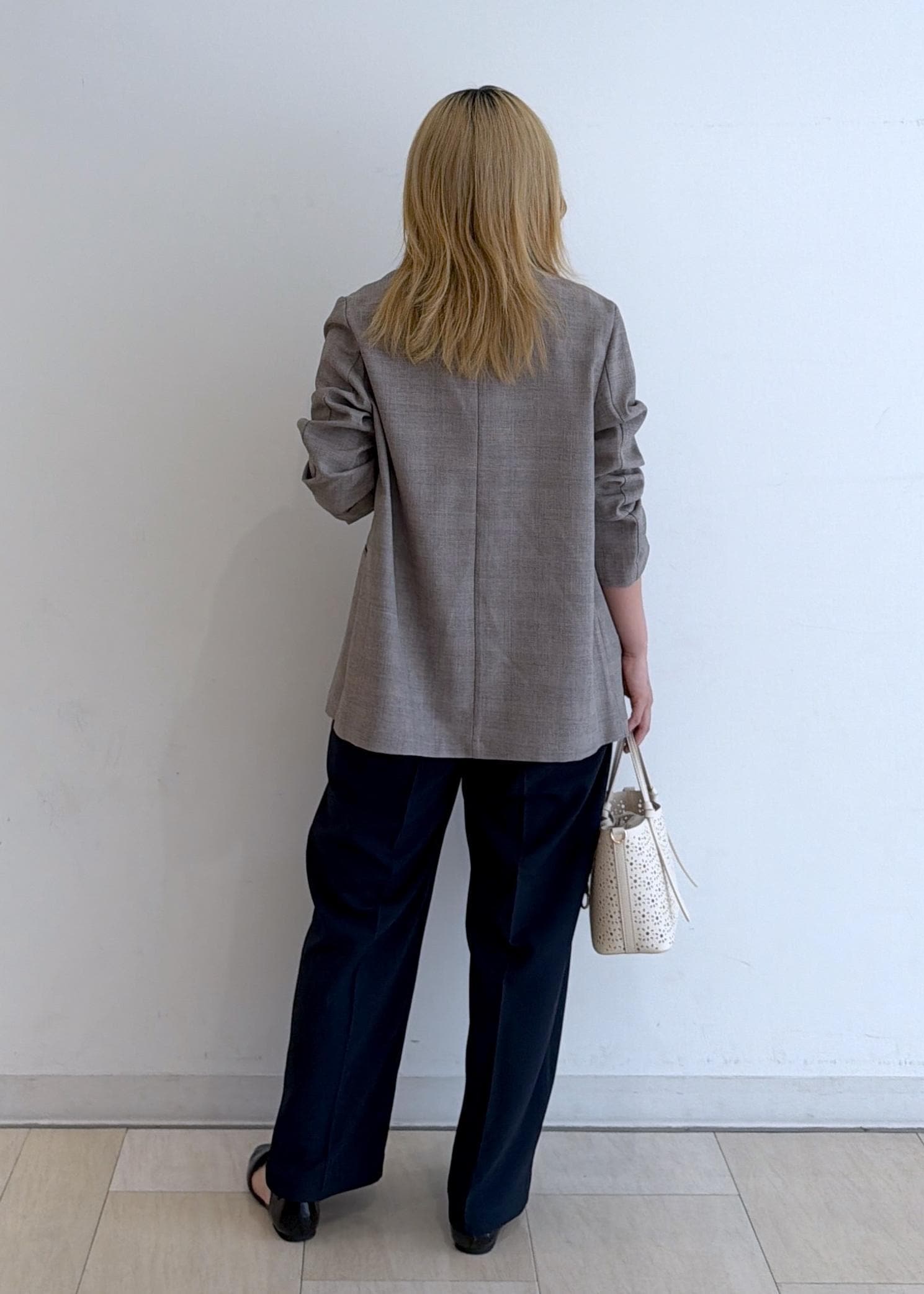 オーバーサイズのジャケットなので、ハイウエストバンツと合わせてウエストマークしました!