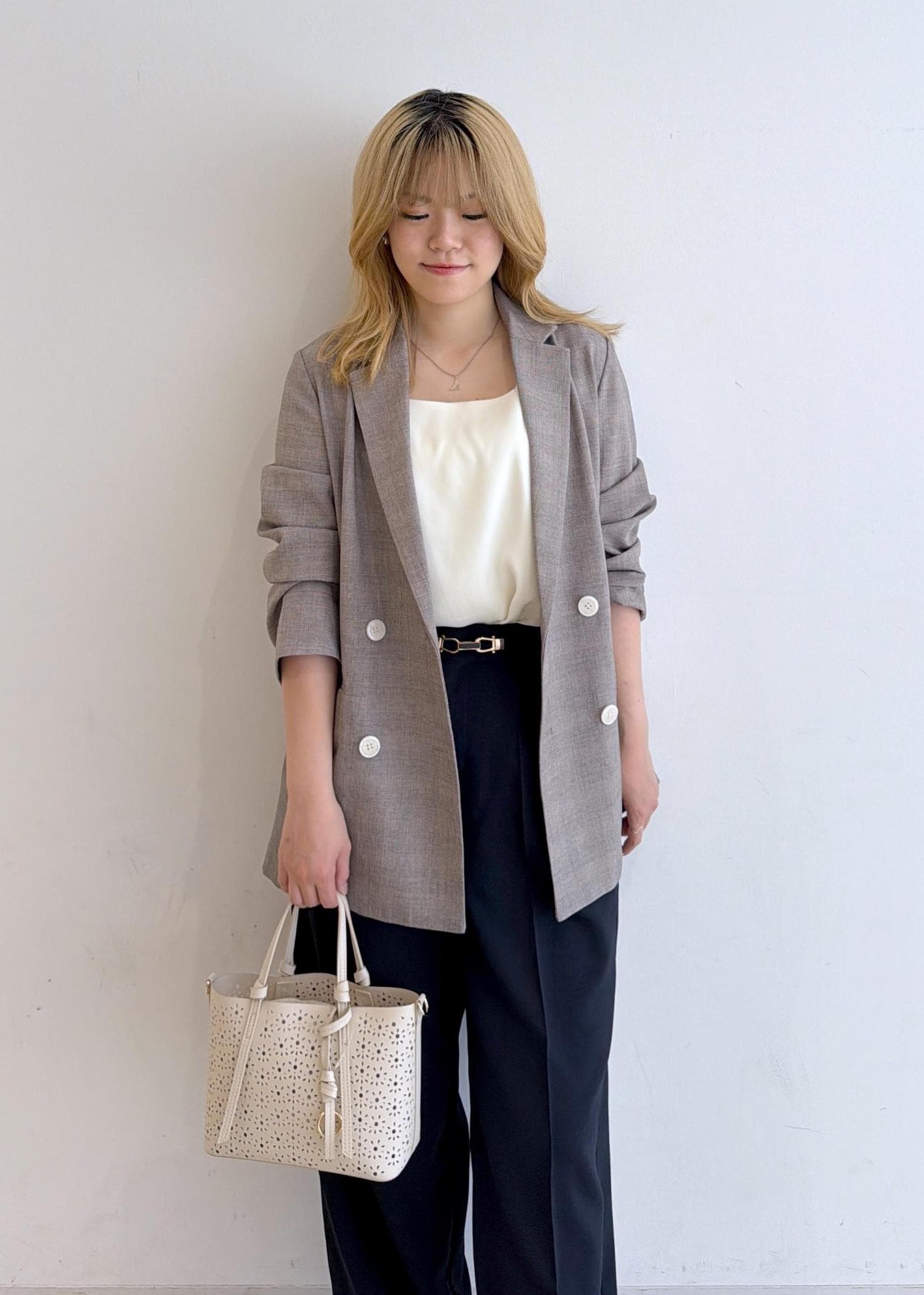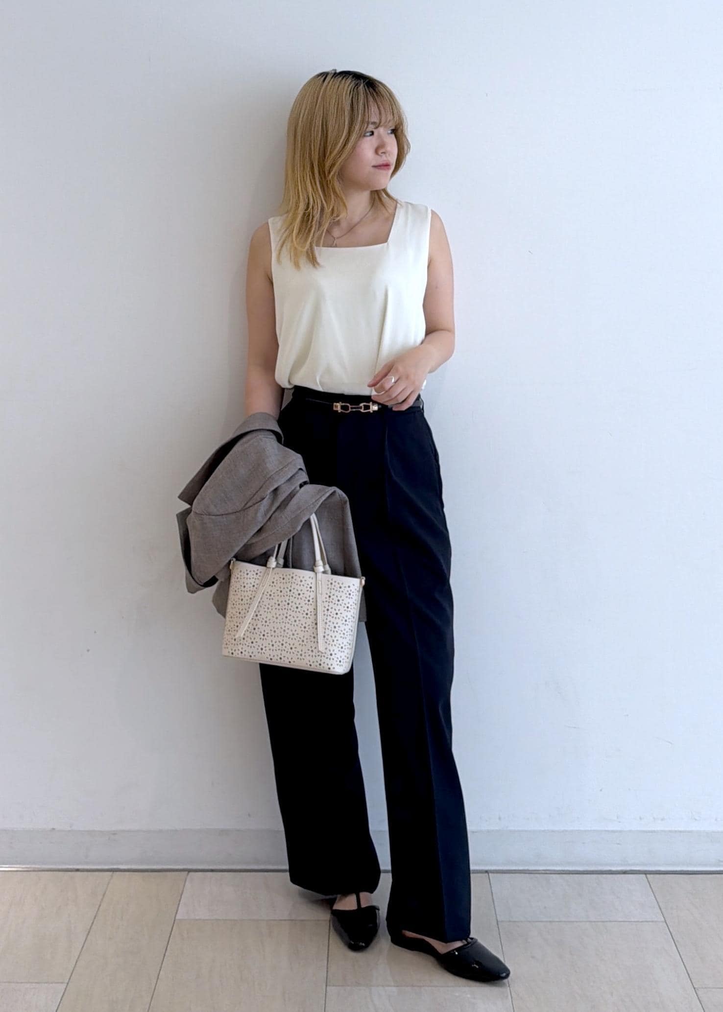 小物を変えてオフィスカジュアルでも使えます◎