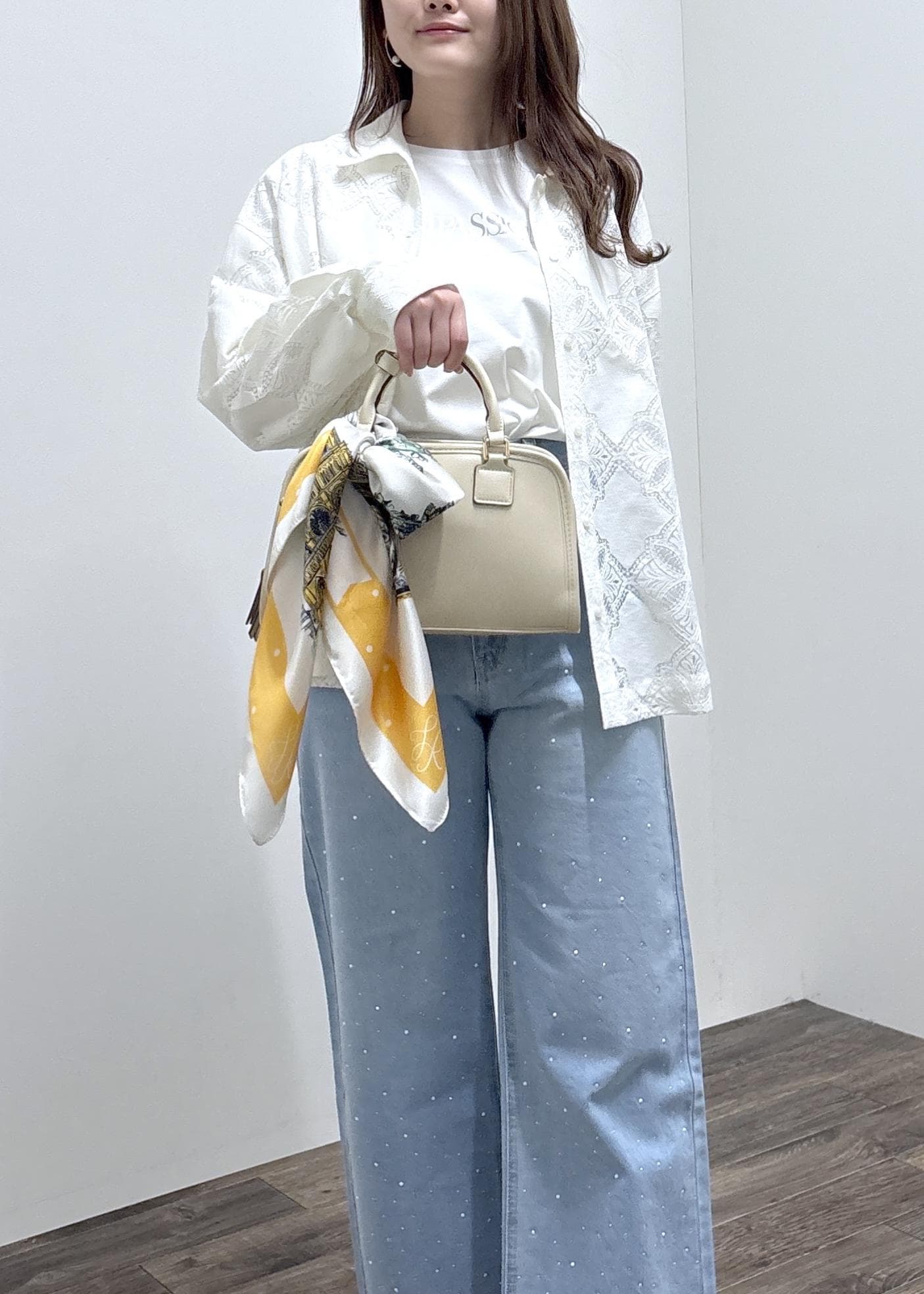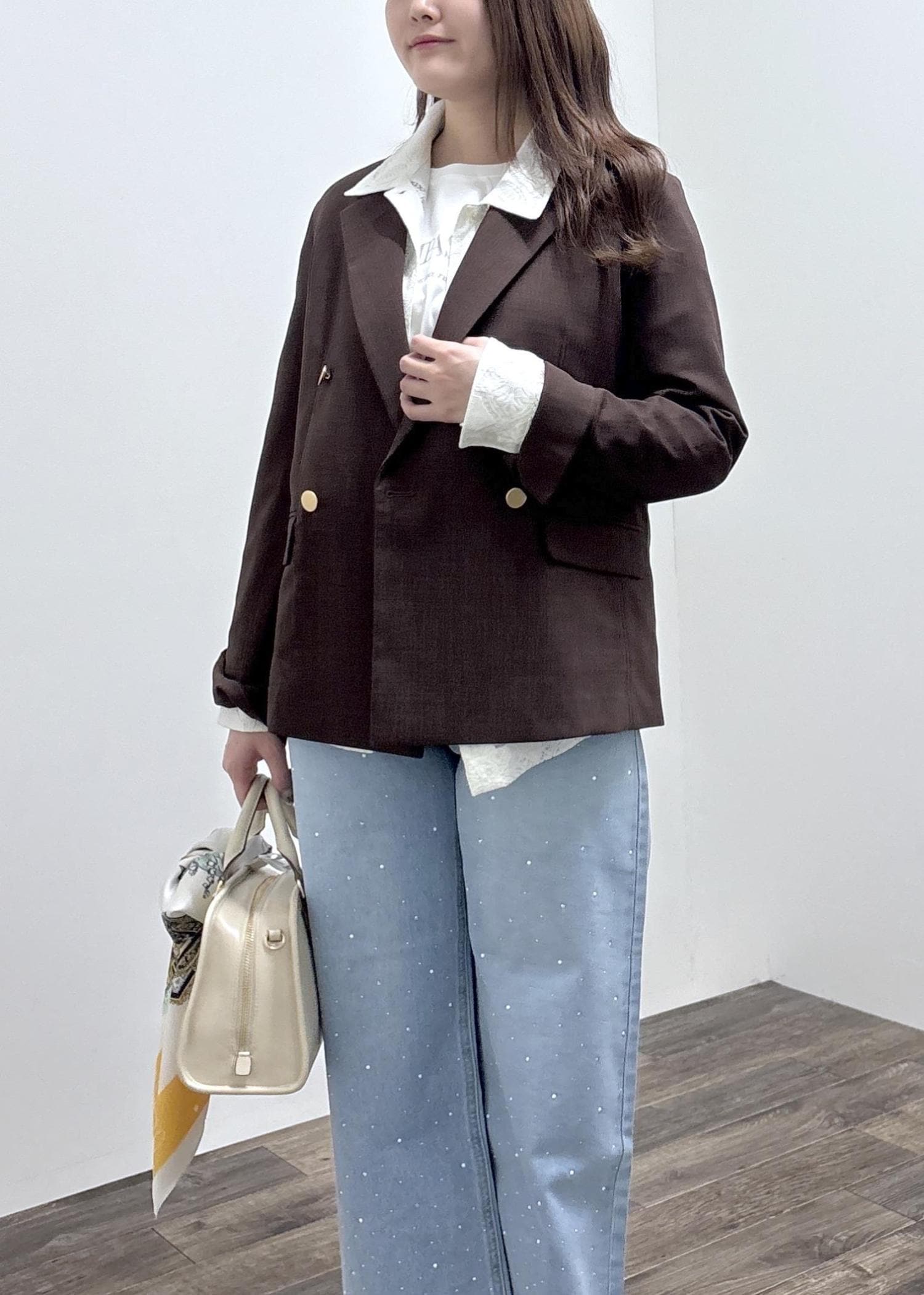 ジャケット×ロゴtee×デニムのシンプルスタイルですが今年トレンドのレースシャツを合わせることにより一気にオシャレに!