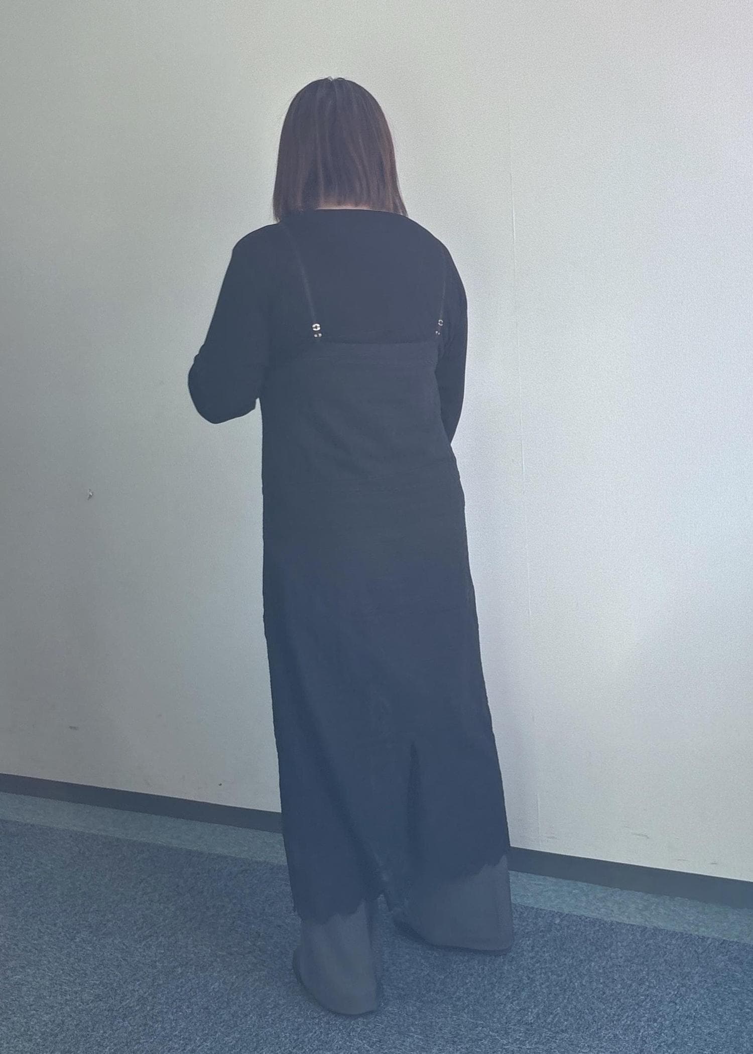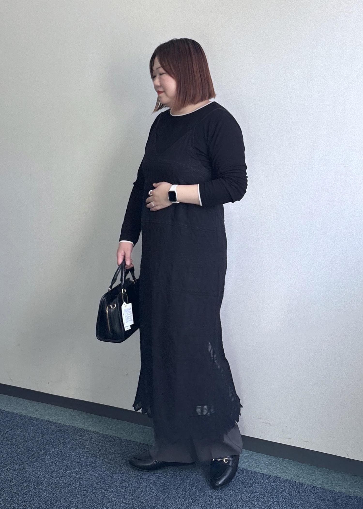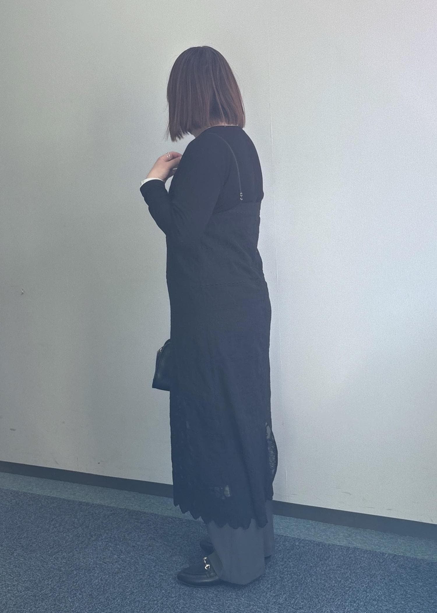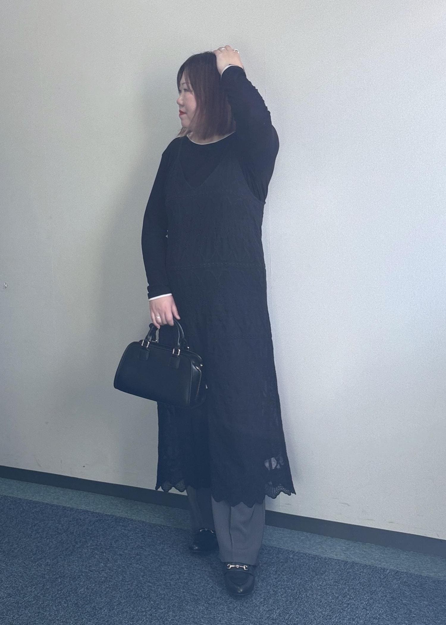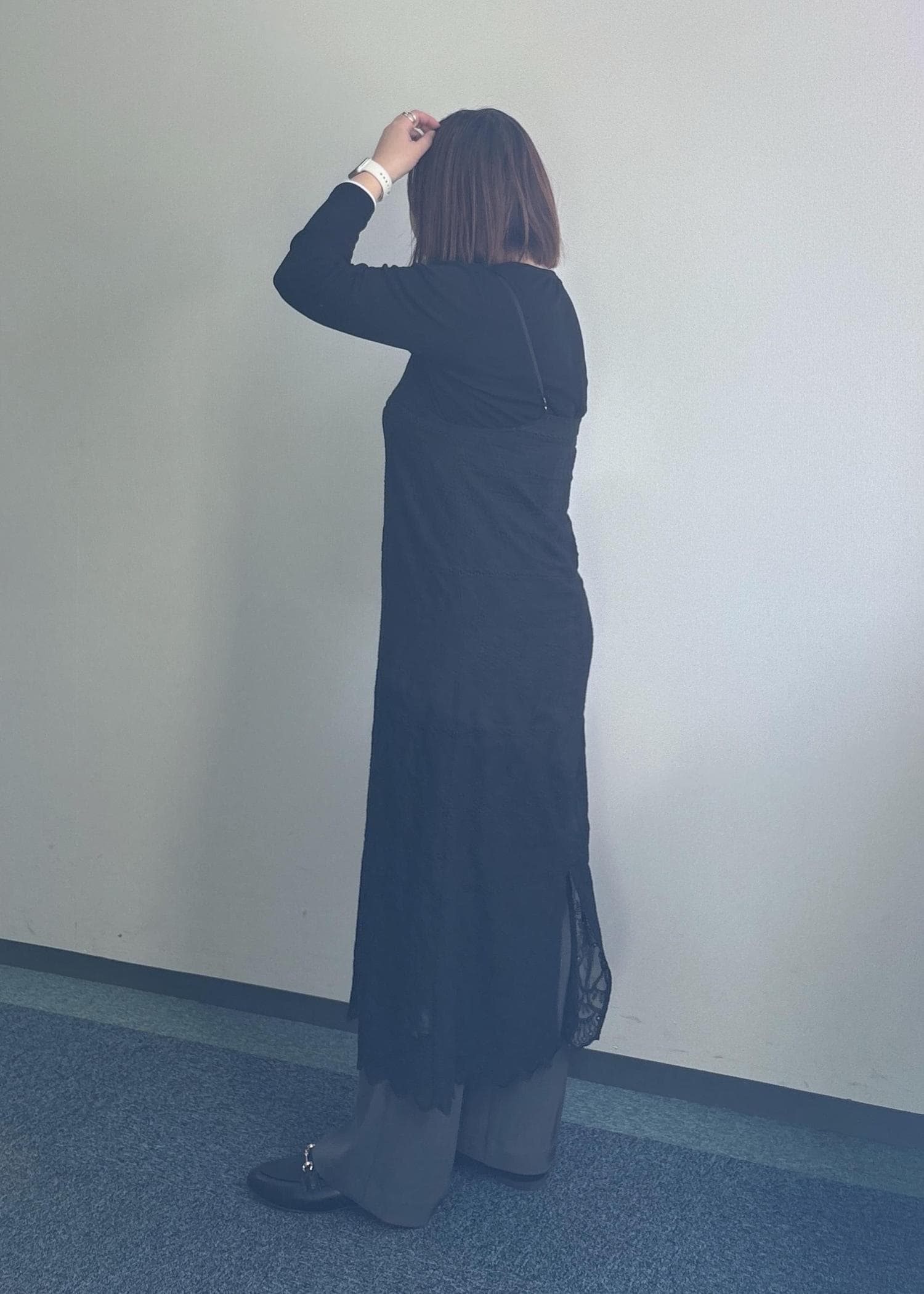 シアーのカットソーにレースキャミワンピースをレイヤードしたブラックコーデです。