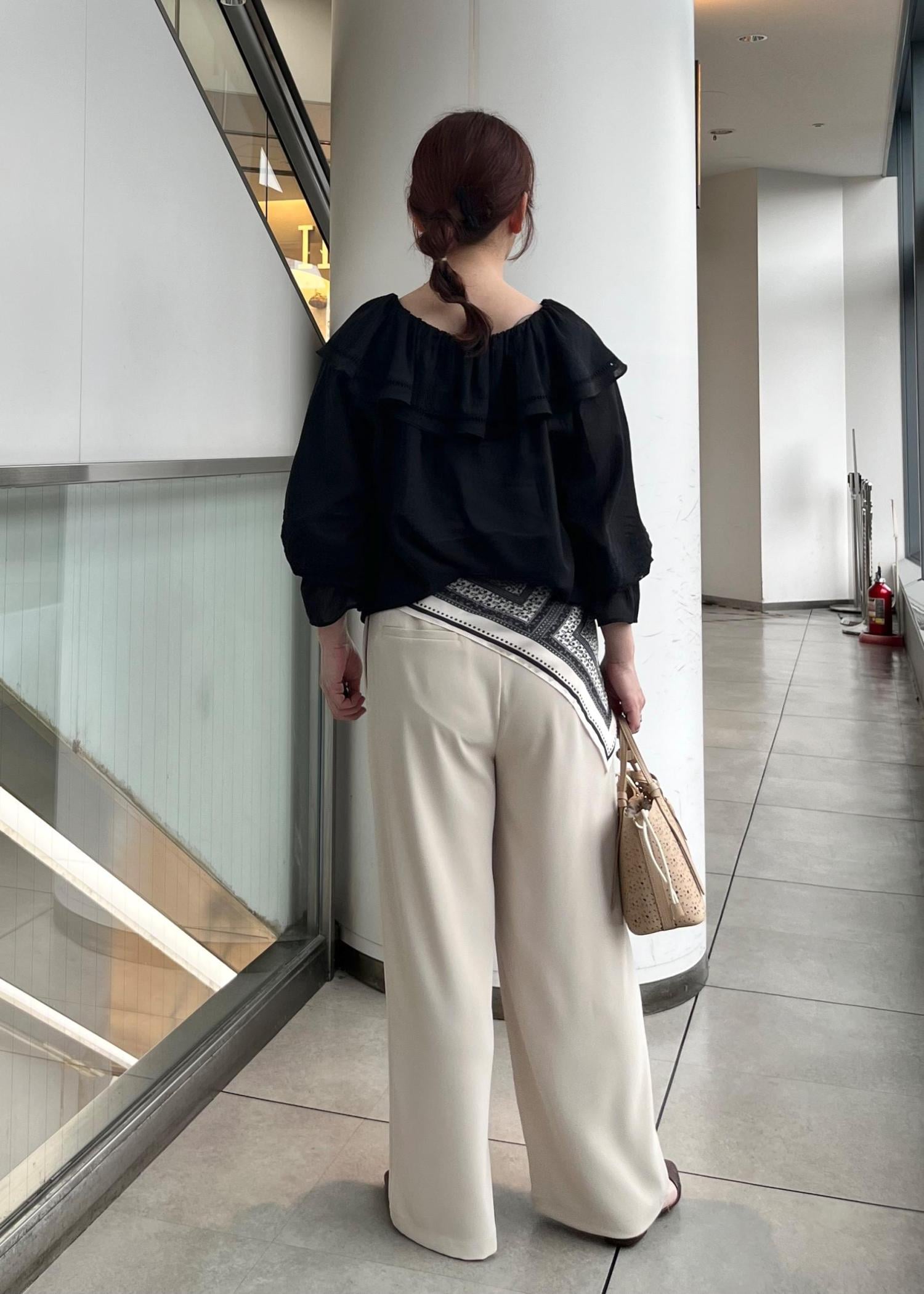 1枚で華やかなギャザーブラウスにベージュのワイドパンツを合わせた大人カジュアルなスタイルです。