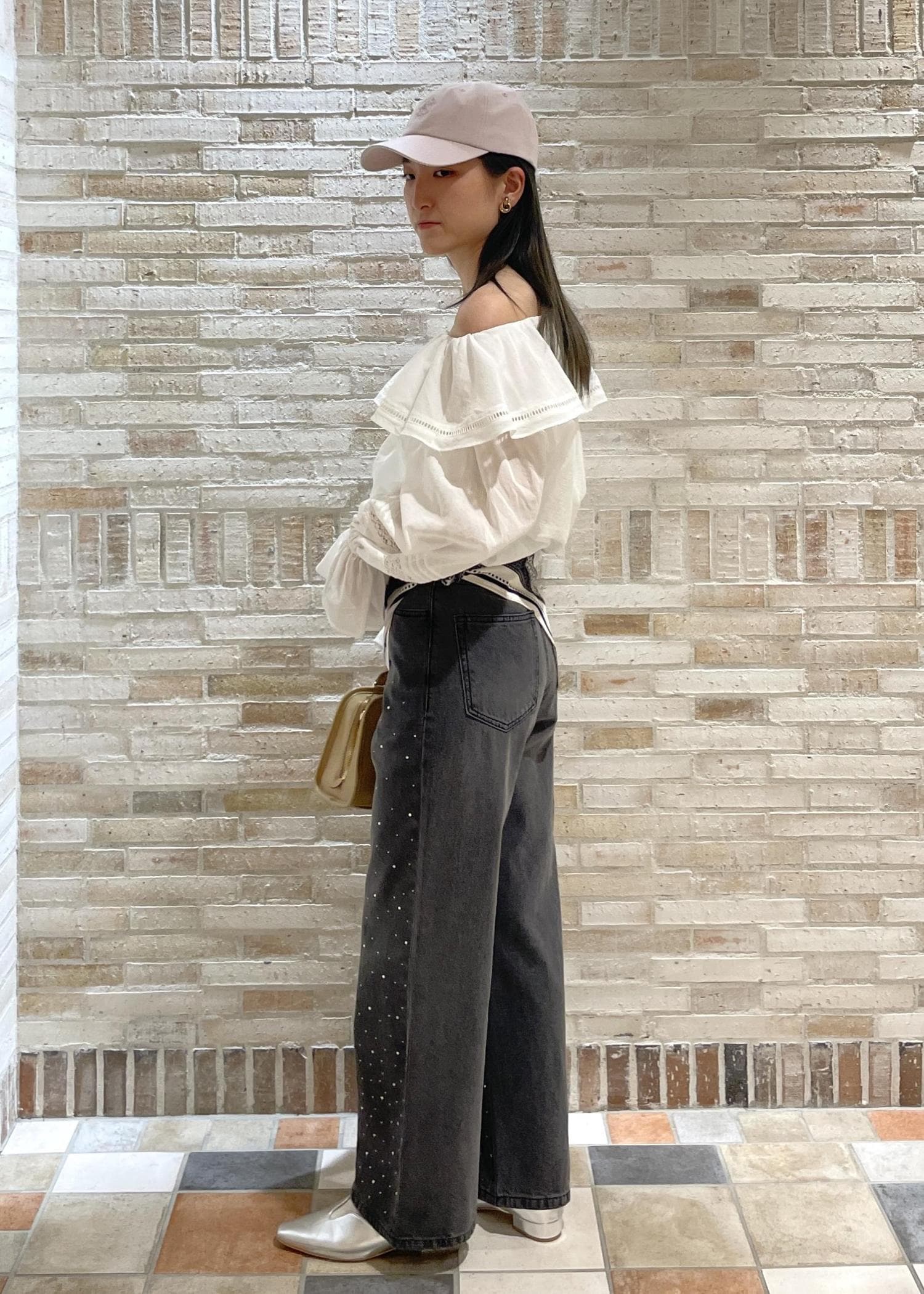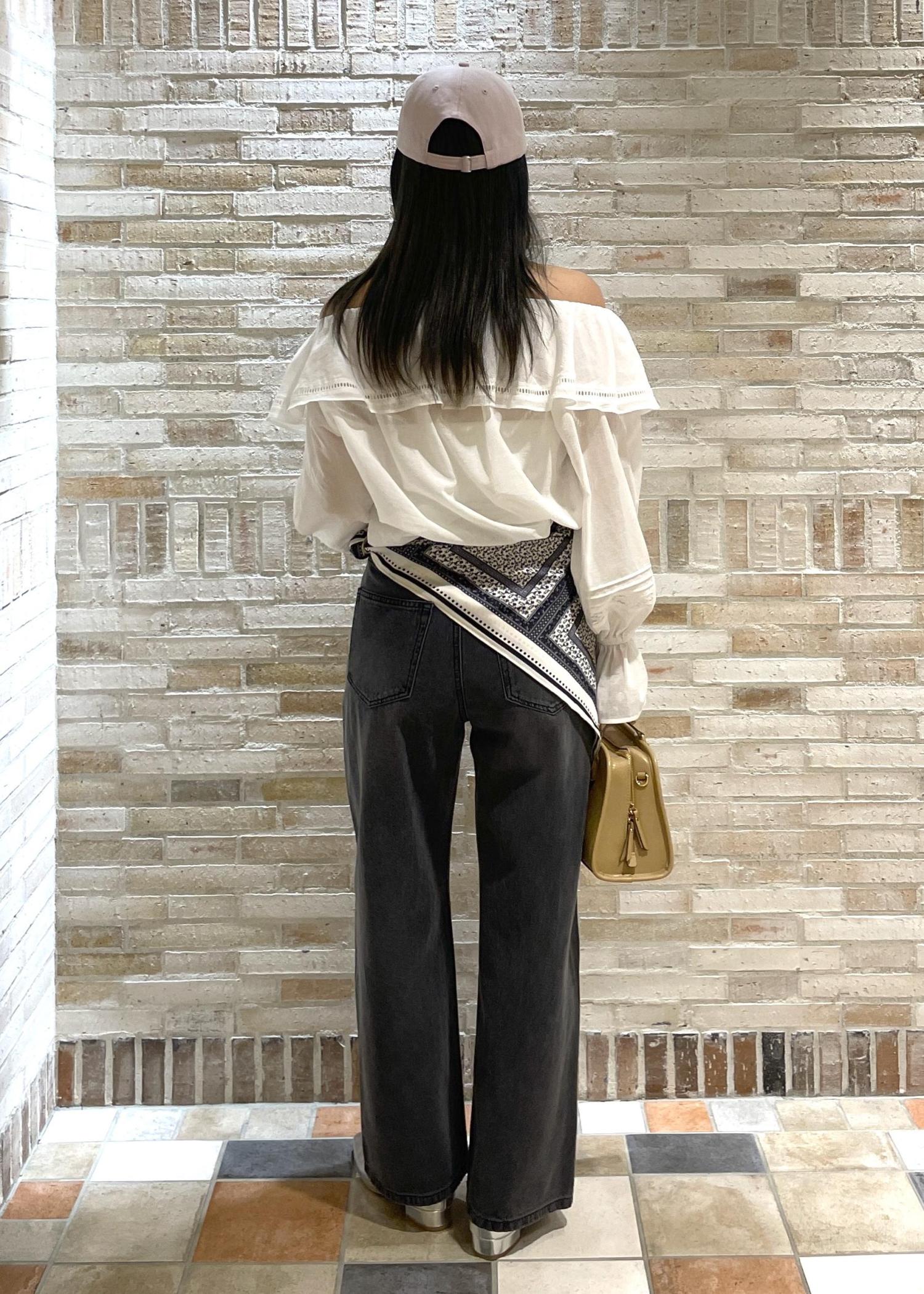 女性らしいオフショルダーのブラウスを主役にしたコーディネートです!甘くなりすぎないようデニムとキャップを合わせました♫