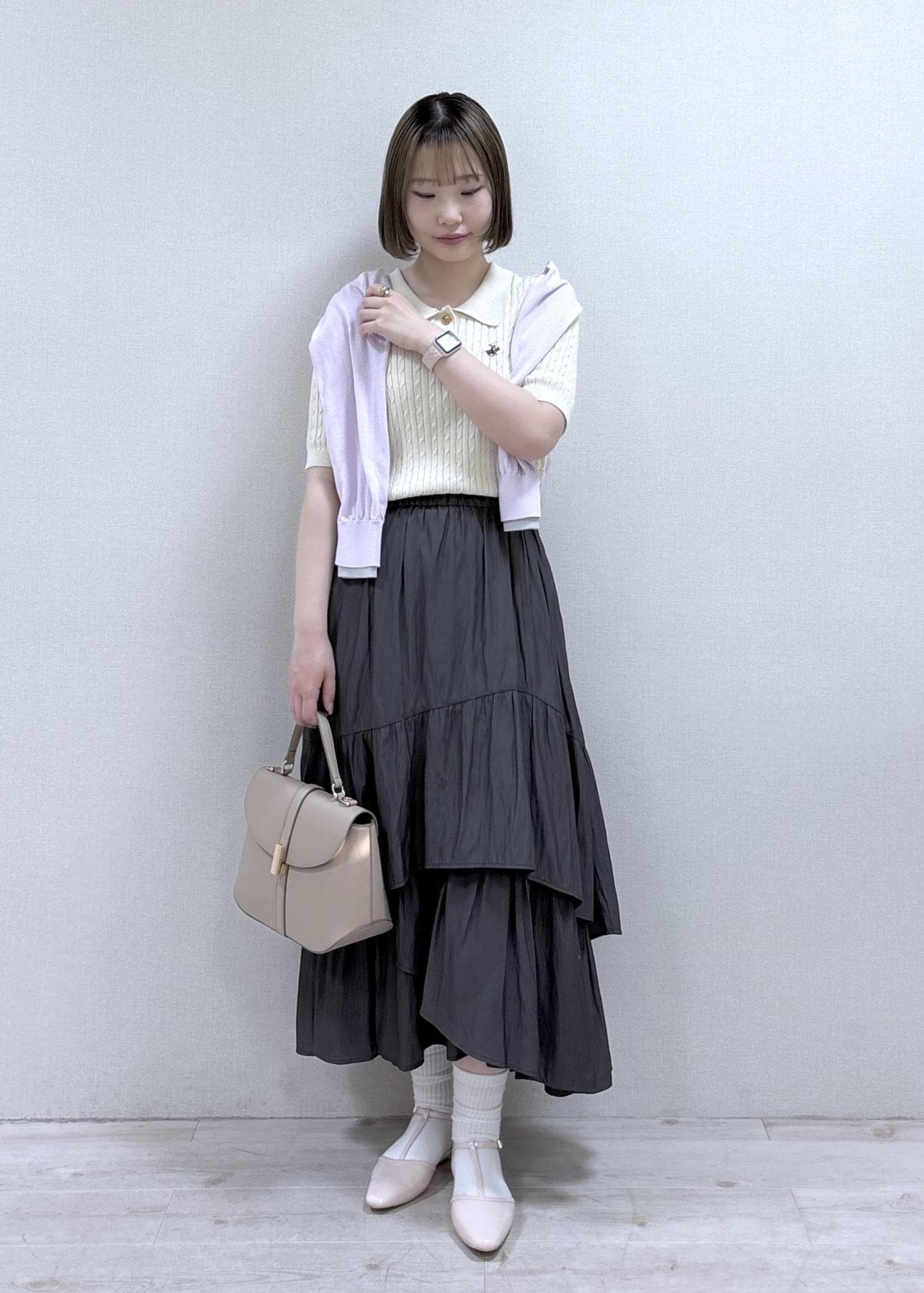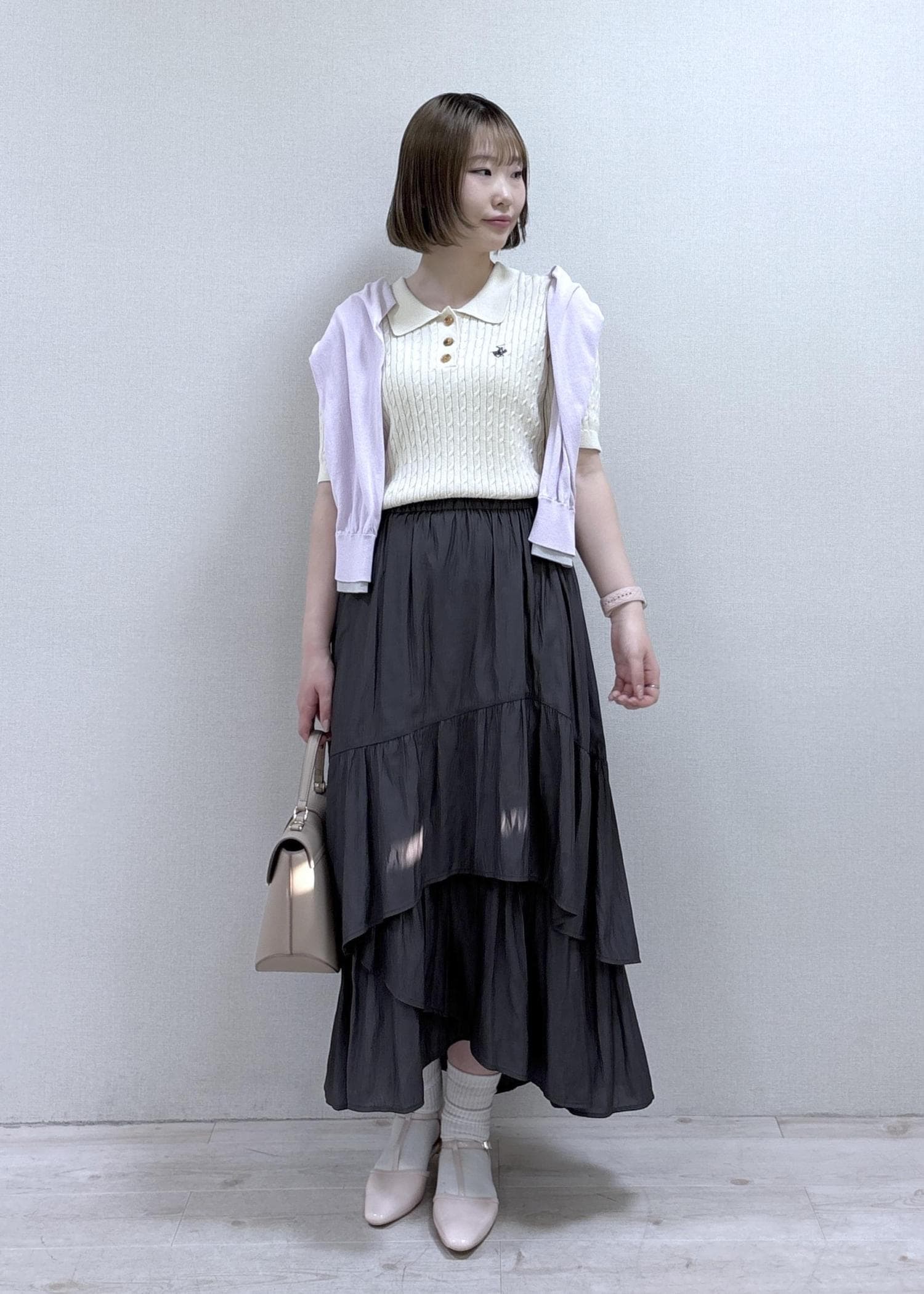 ポロニットとティアードスカートを合わせたカジュアル×フェミニンスタイルです。