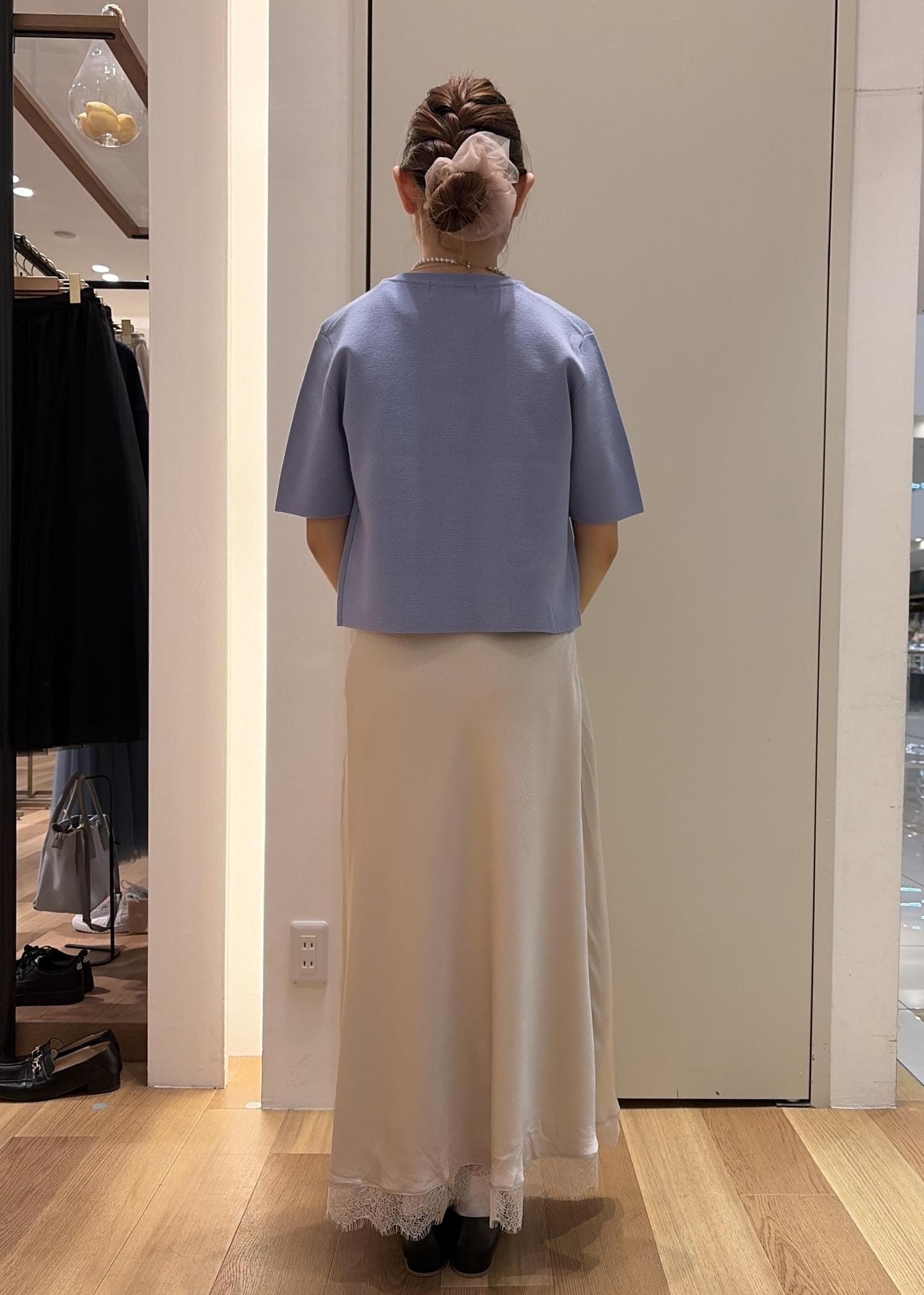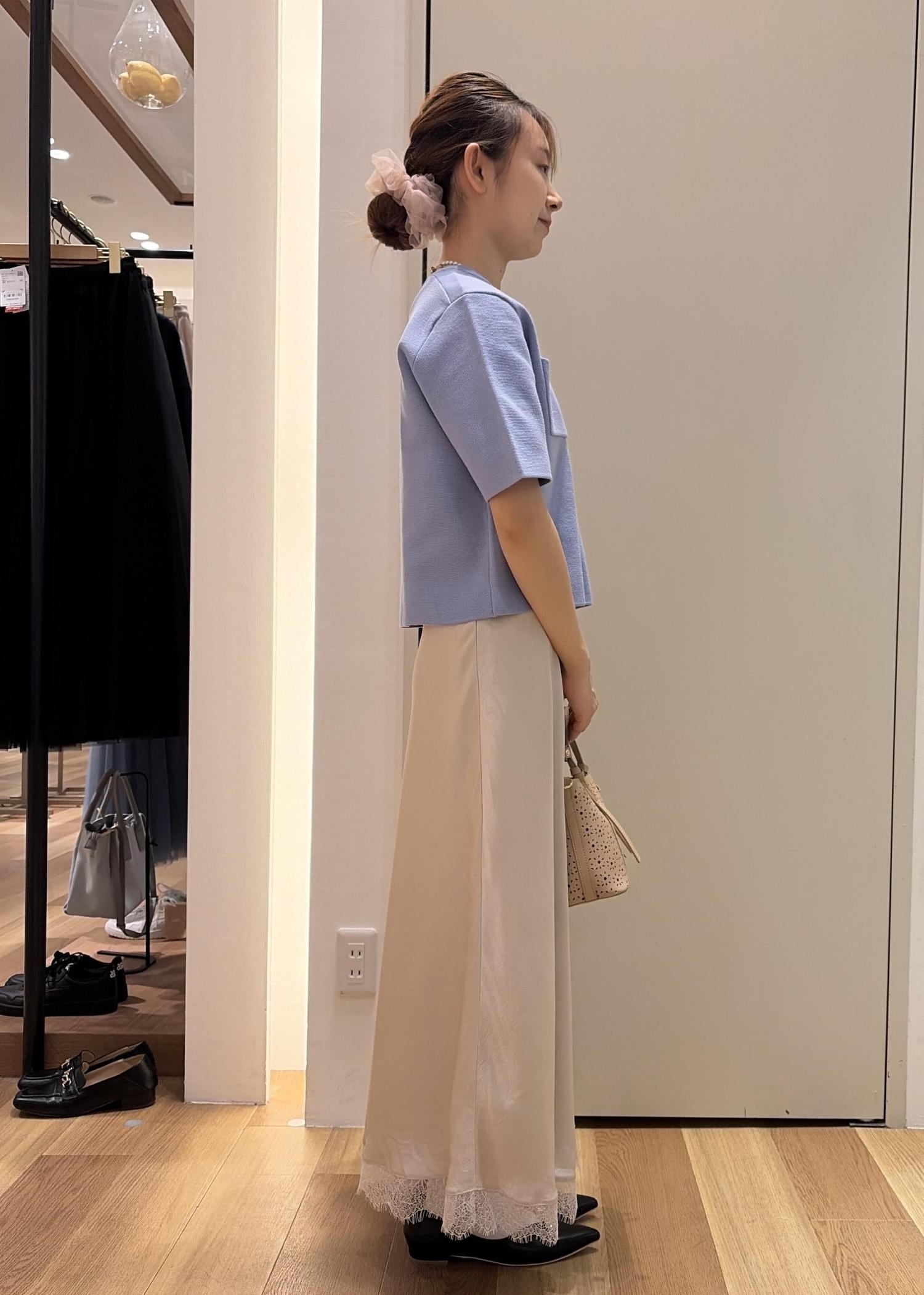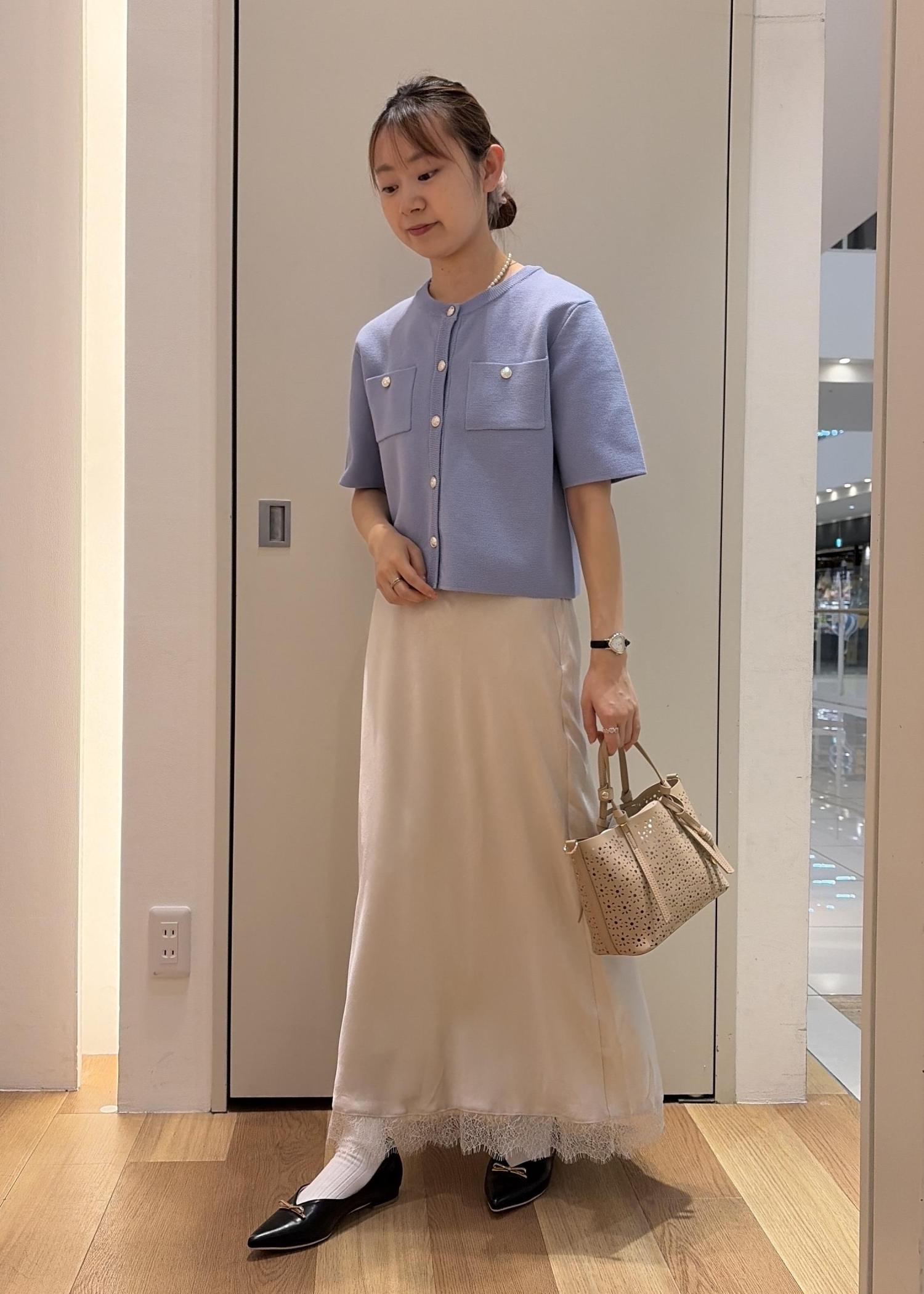 水色のカーディガンにアイボリーのスカートを合わせ全体的に明るく春らしいカラーリングでまとめ上品なスタイルにしました。