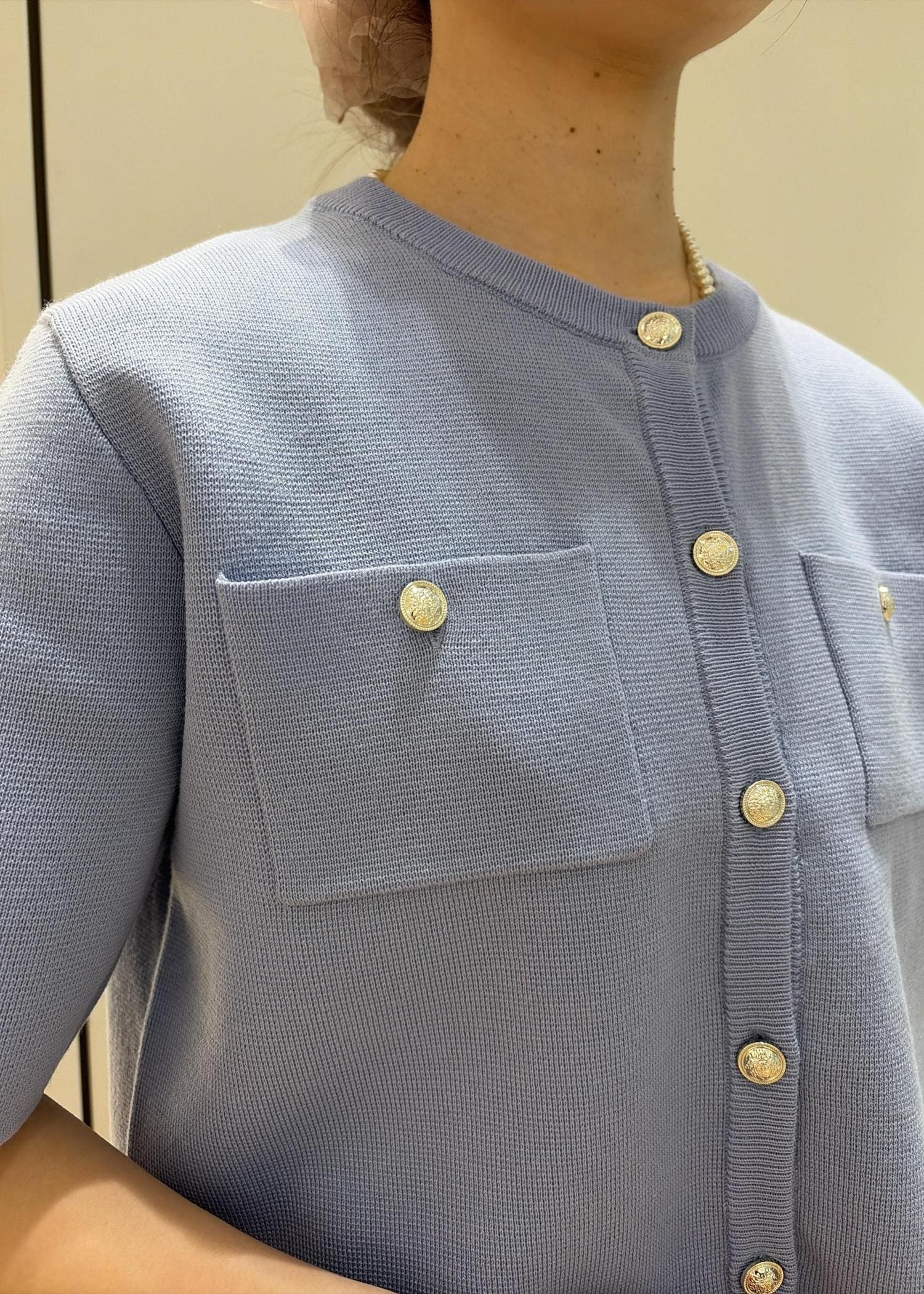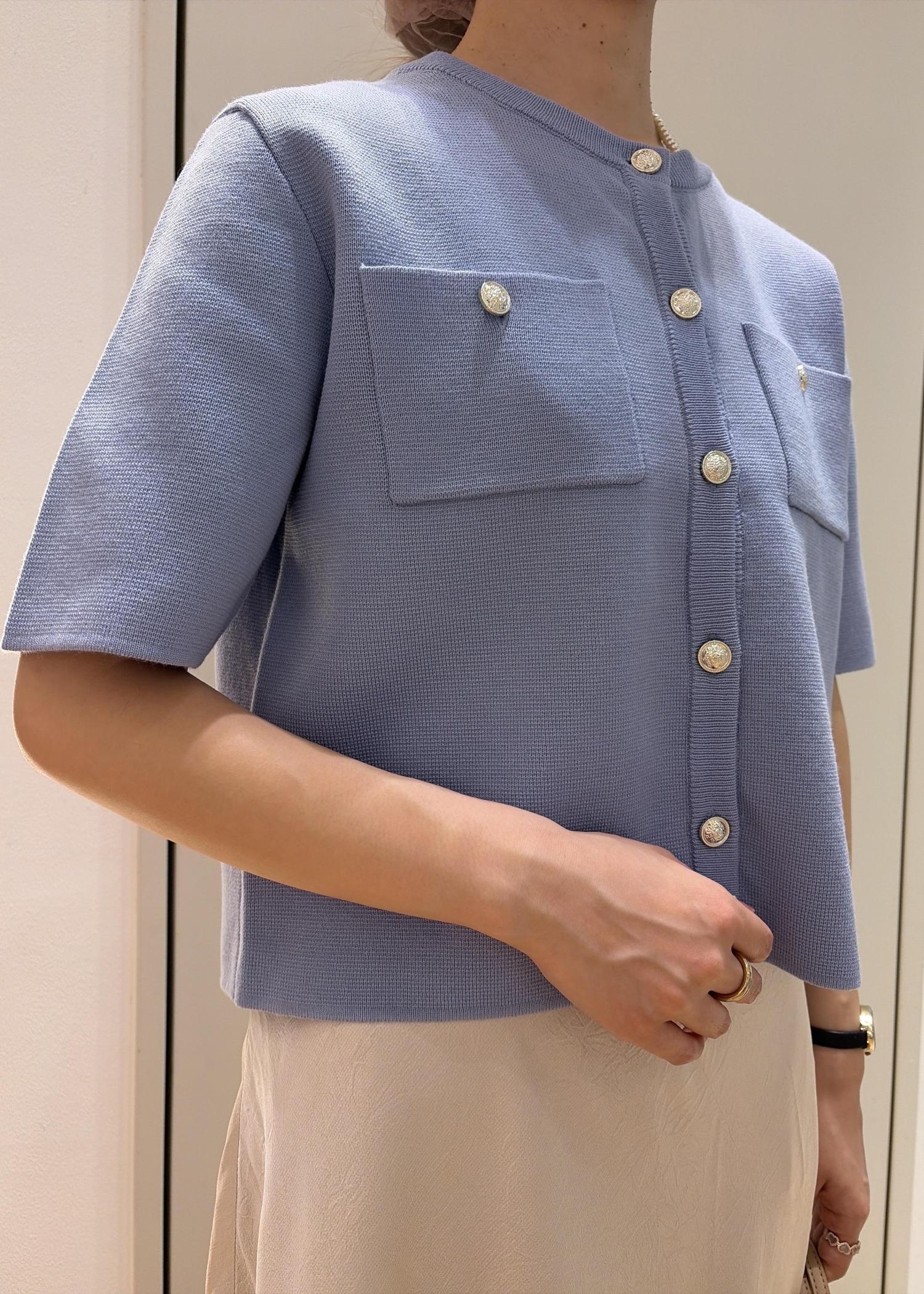 ROPÉ PICNICミラノリブ金ボタン半袖カーディガンサックス / F¥5,489レビュー程よい丈感でバランスが取りやすく、金ボタンが上品なカーディガンです。