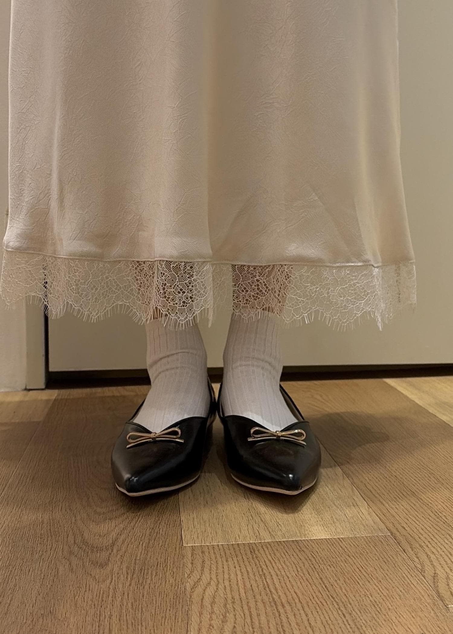 パンプスは黒で締めました。