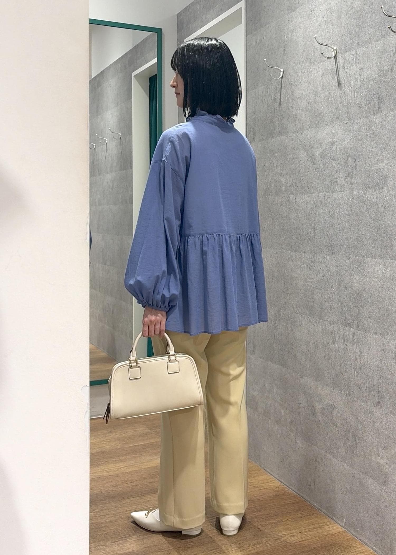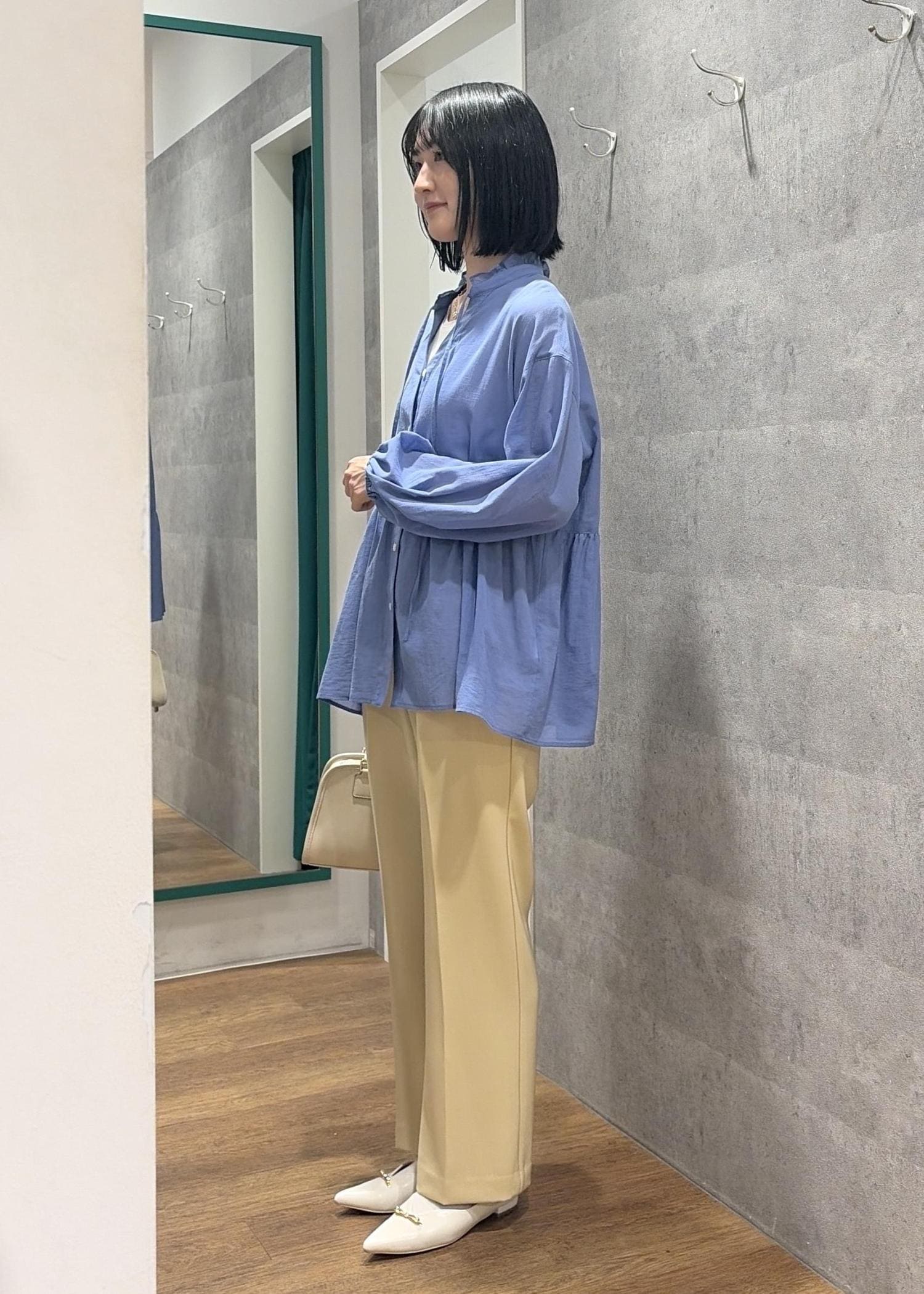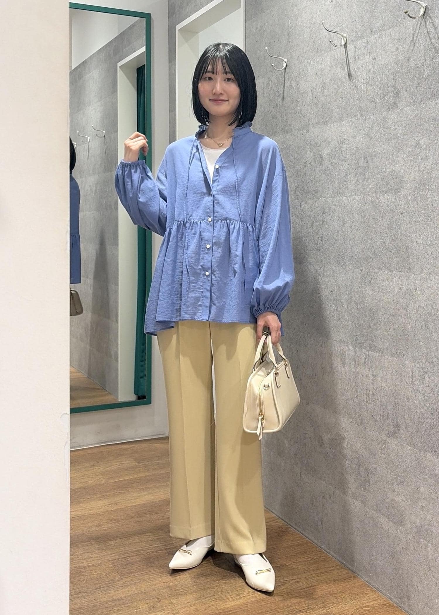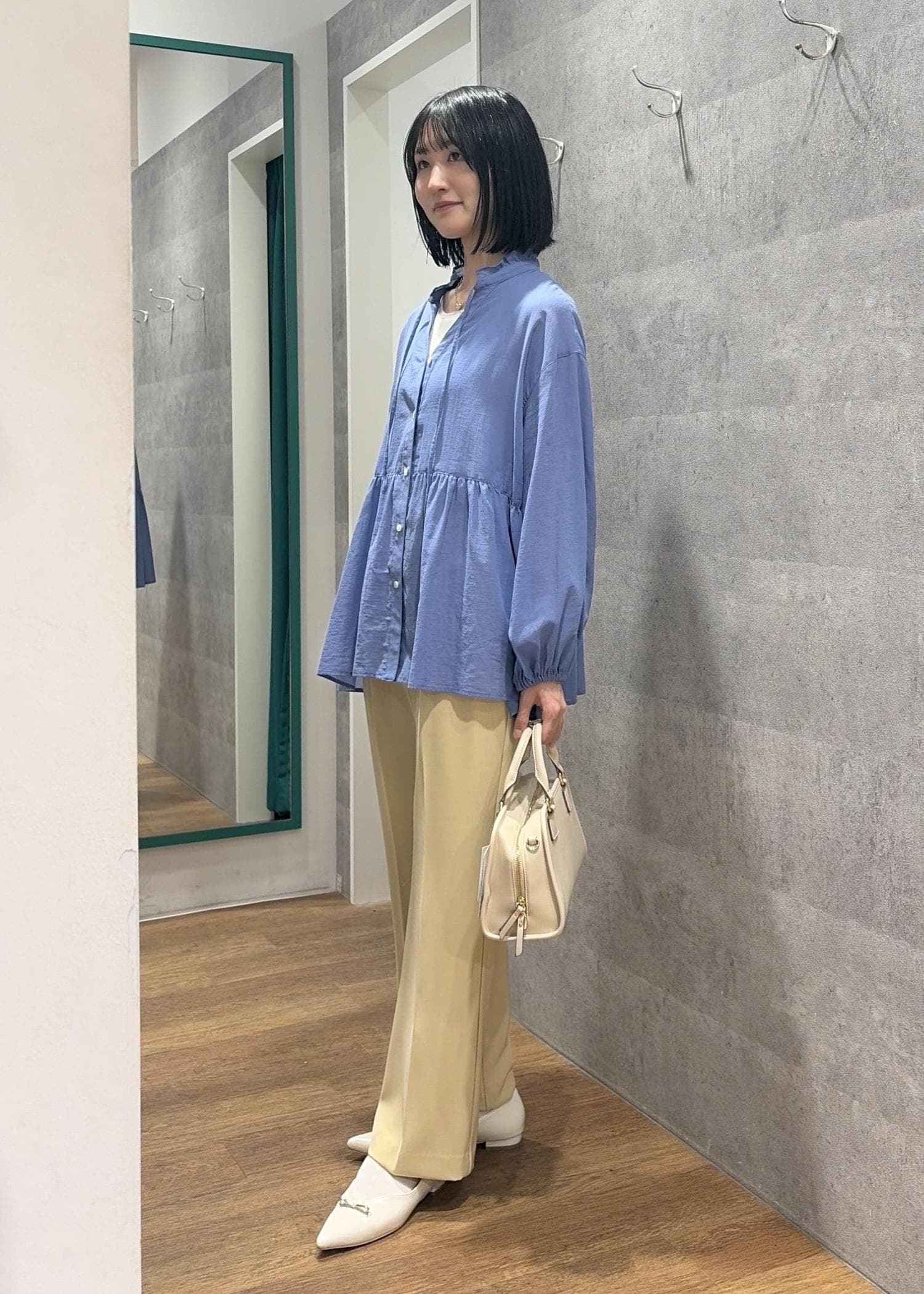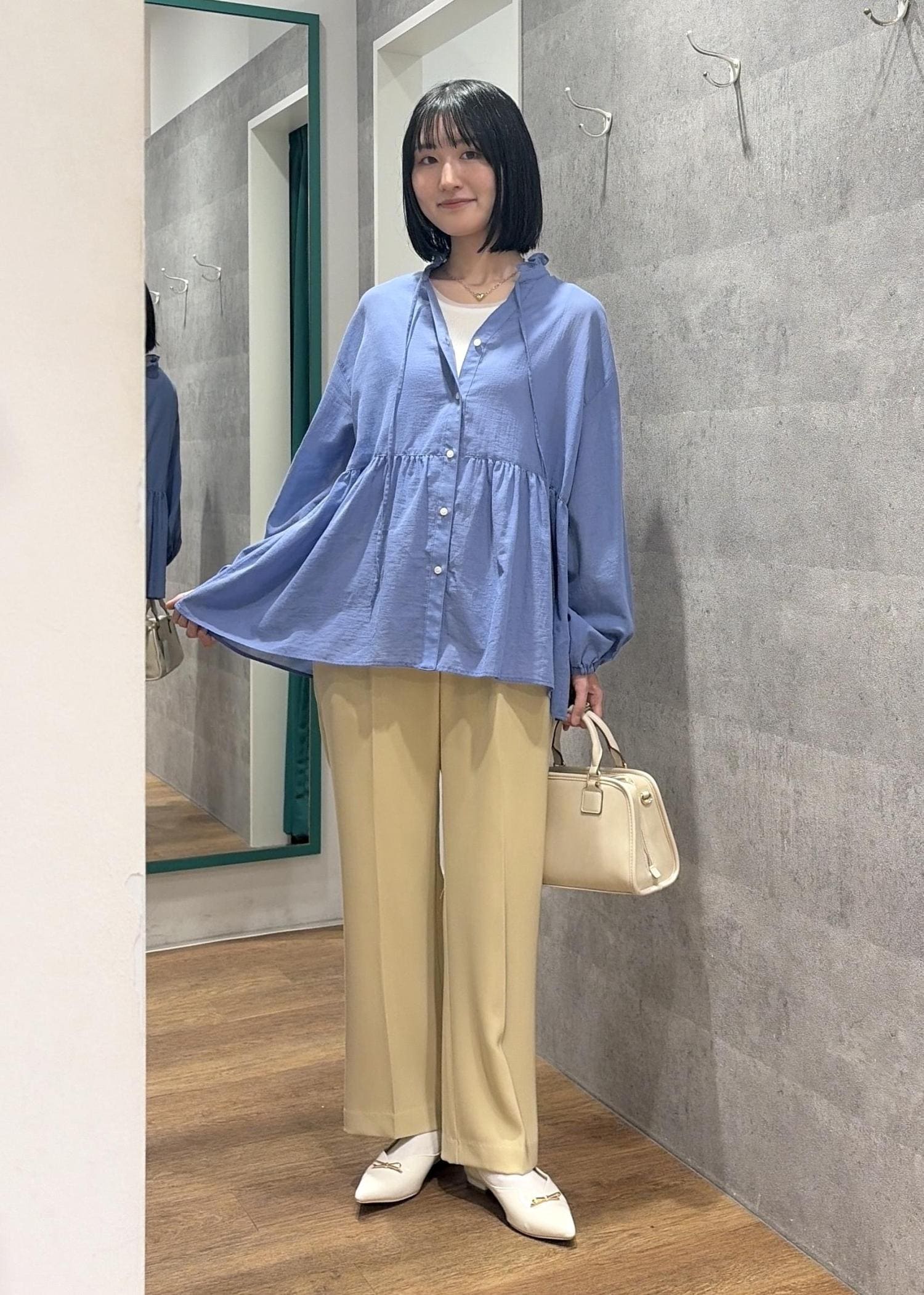 ブルーにイエローを合わせて爽やかな印象のきれいめコーデ。