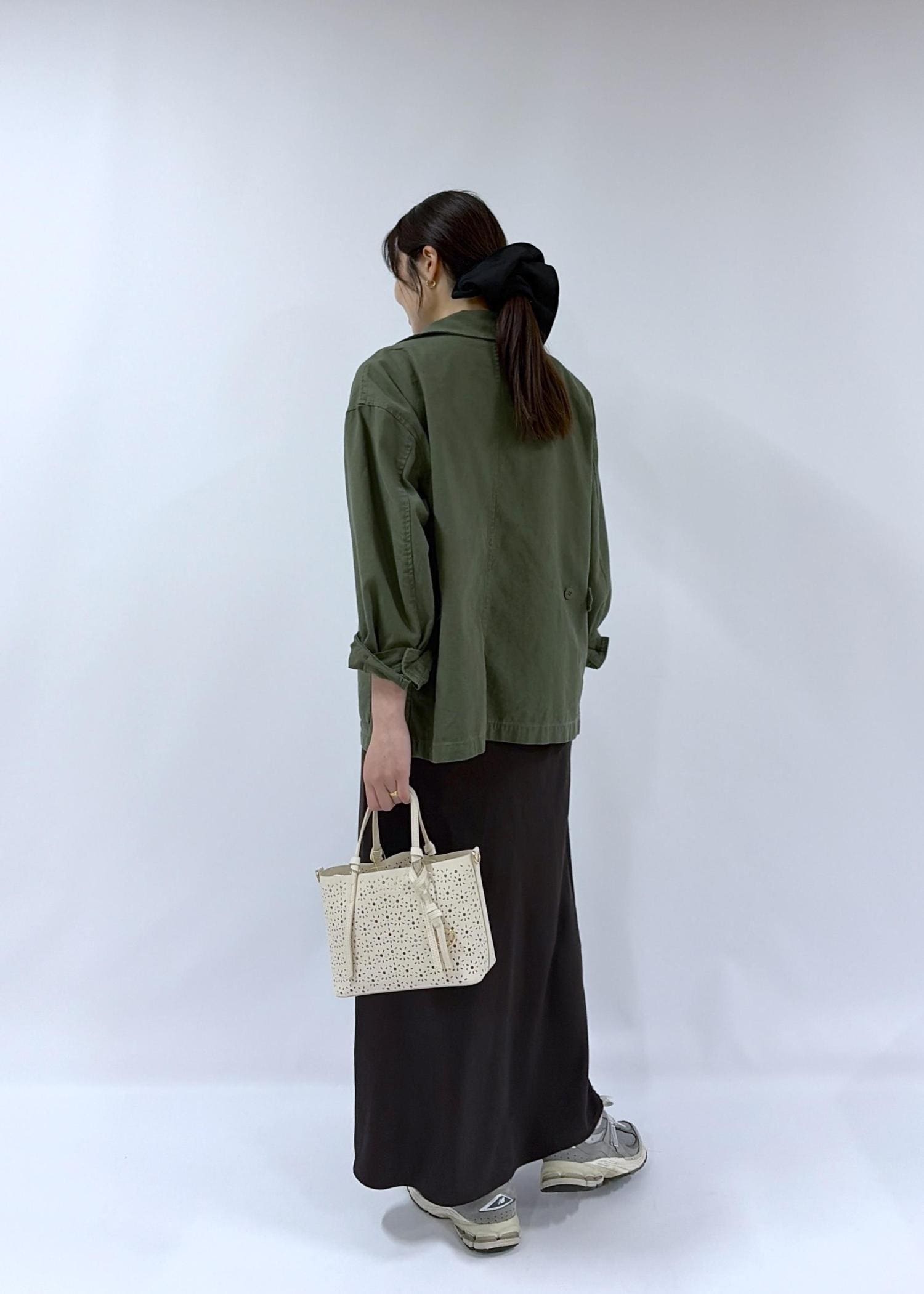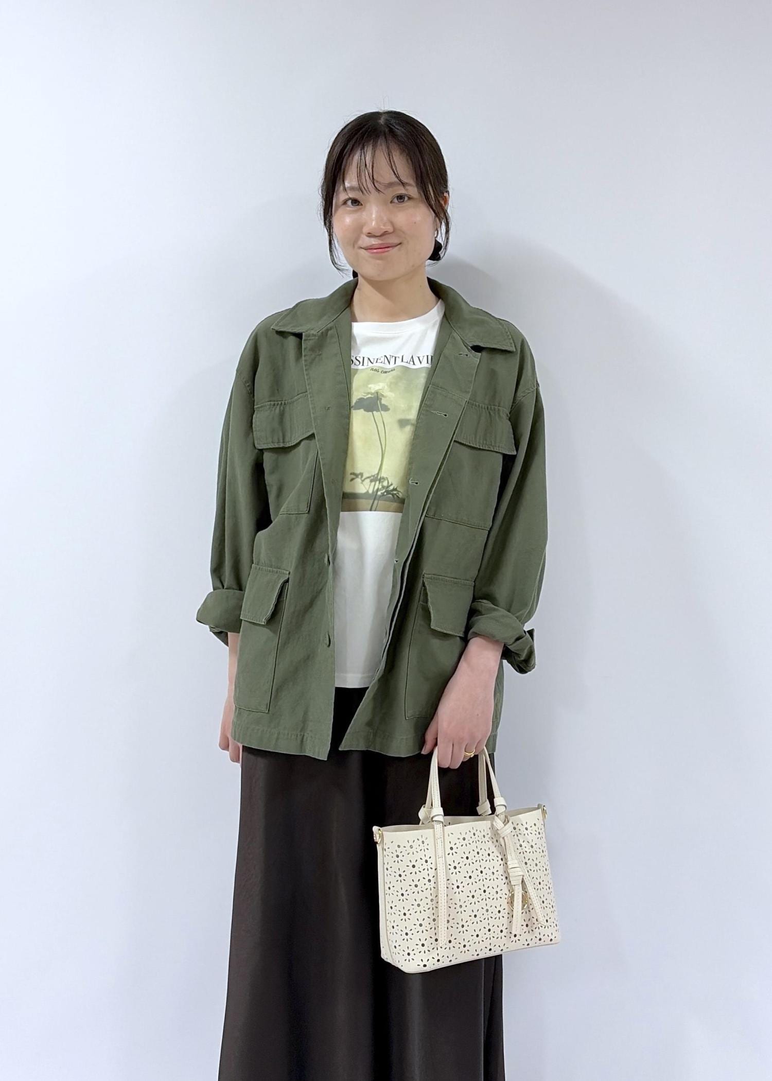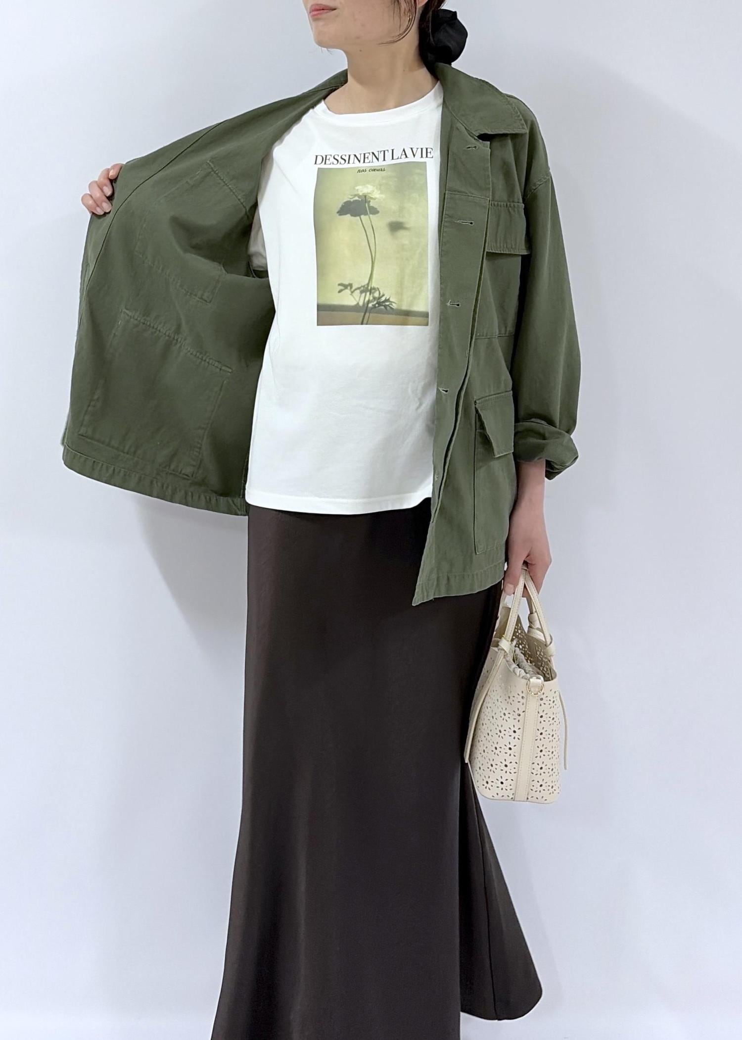 ミリタリーブルゾンやスニーカーのカジュアルスタイルの中に、サテン調のスカートで女性らしさを。羽織を脱いでもTシャツなので寒暖差のある春におすすめのコーディネートです。