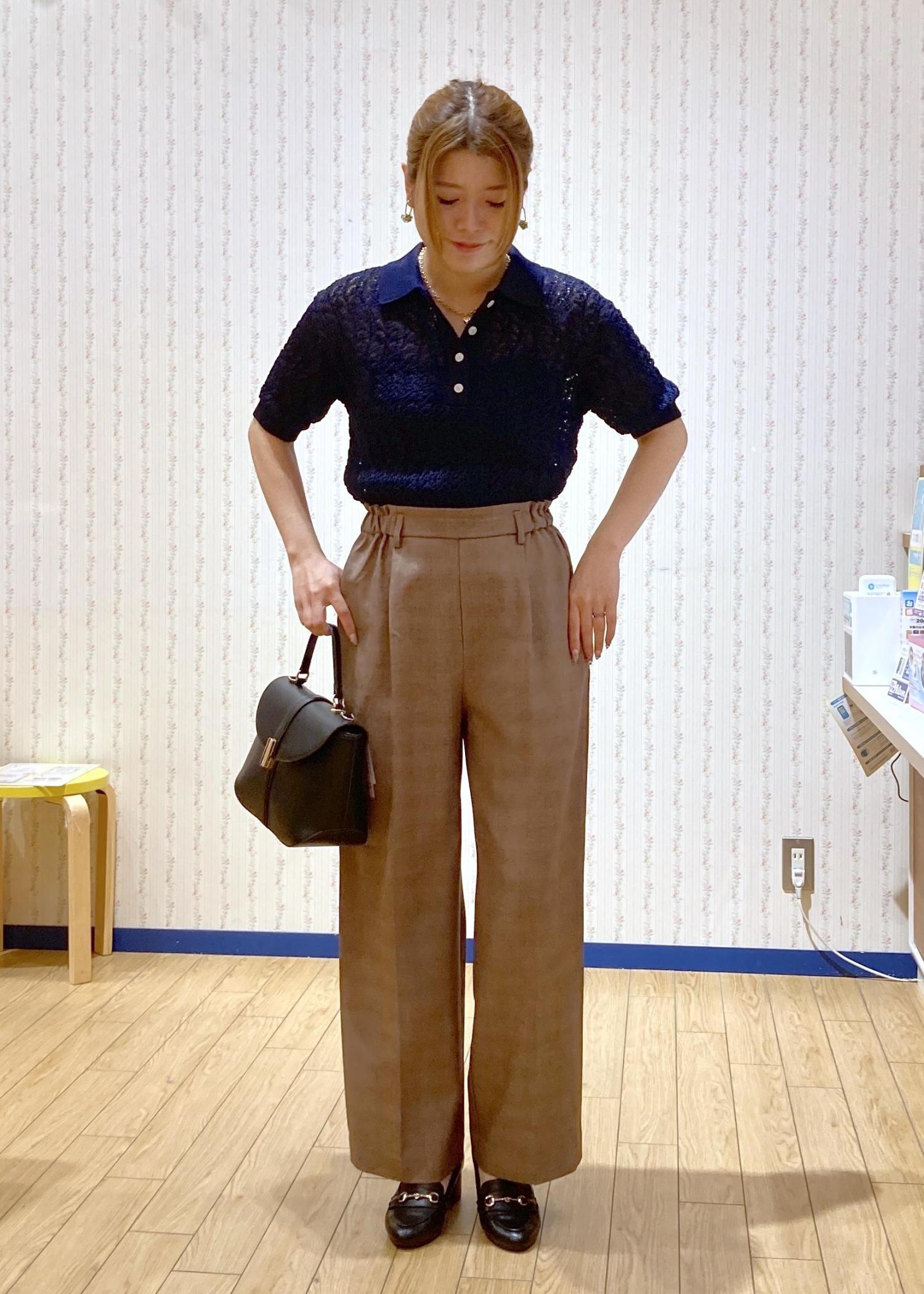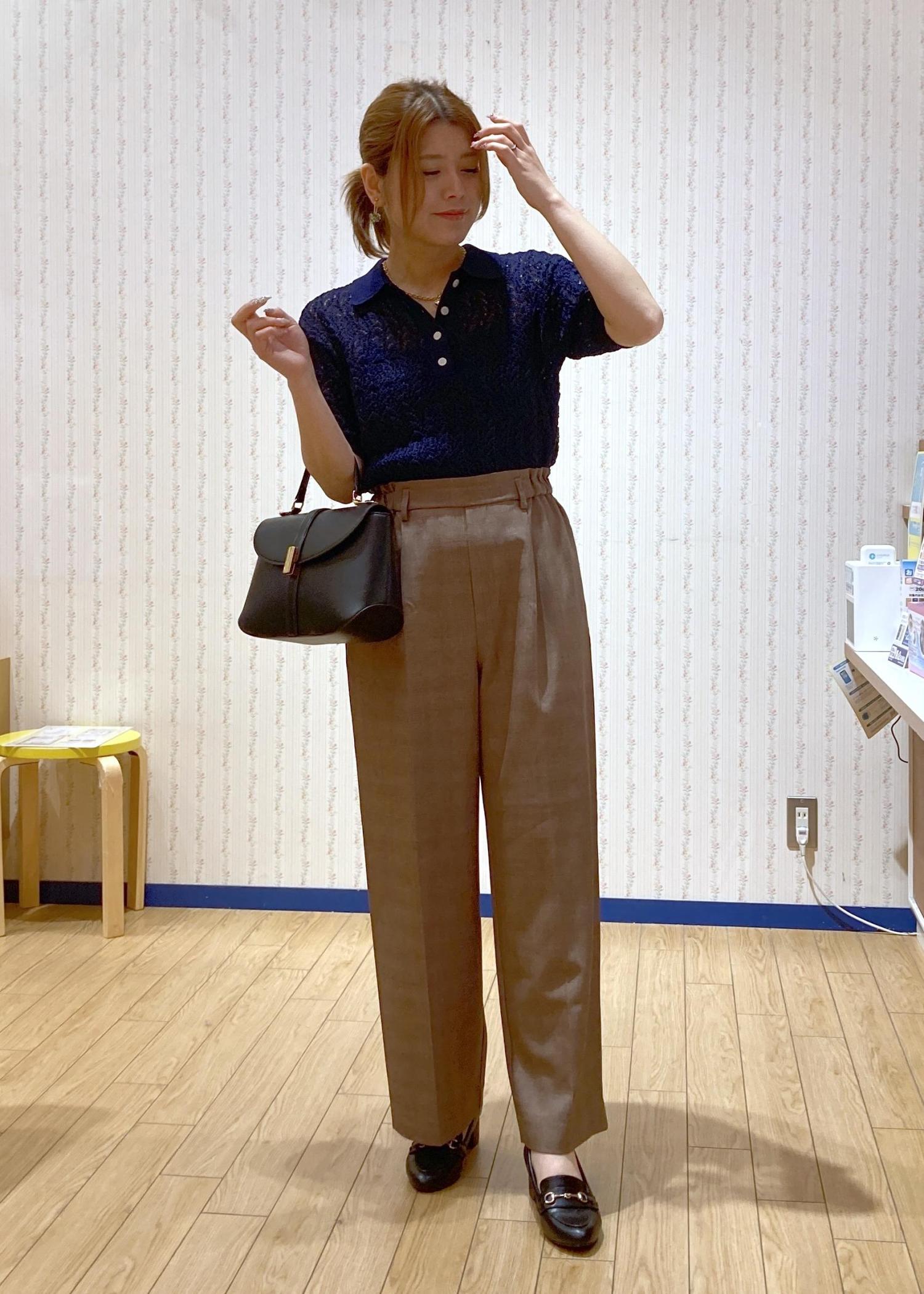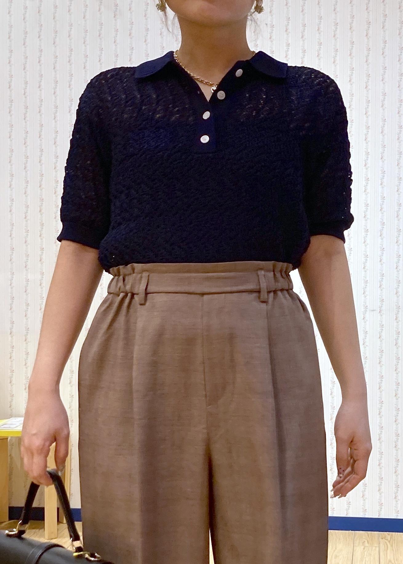 トレンド感のあるレースのポロニットにワイドパンツを合わせた綺麗めシンプルなコーディネートです。