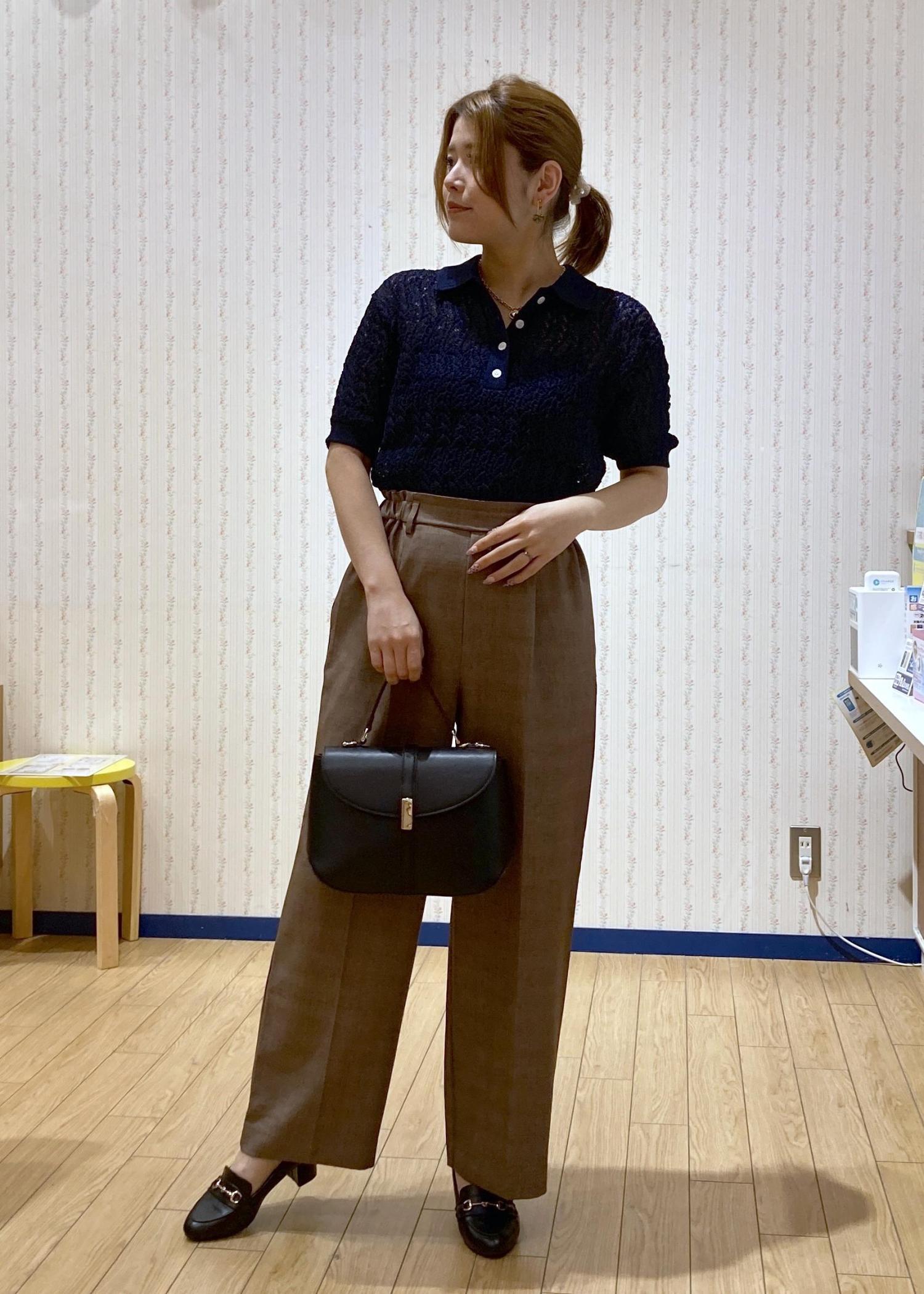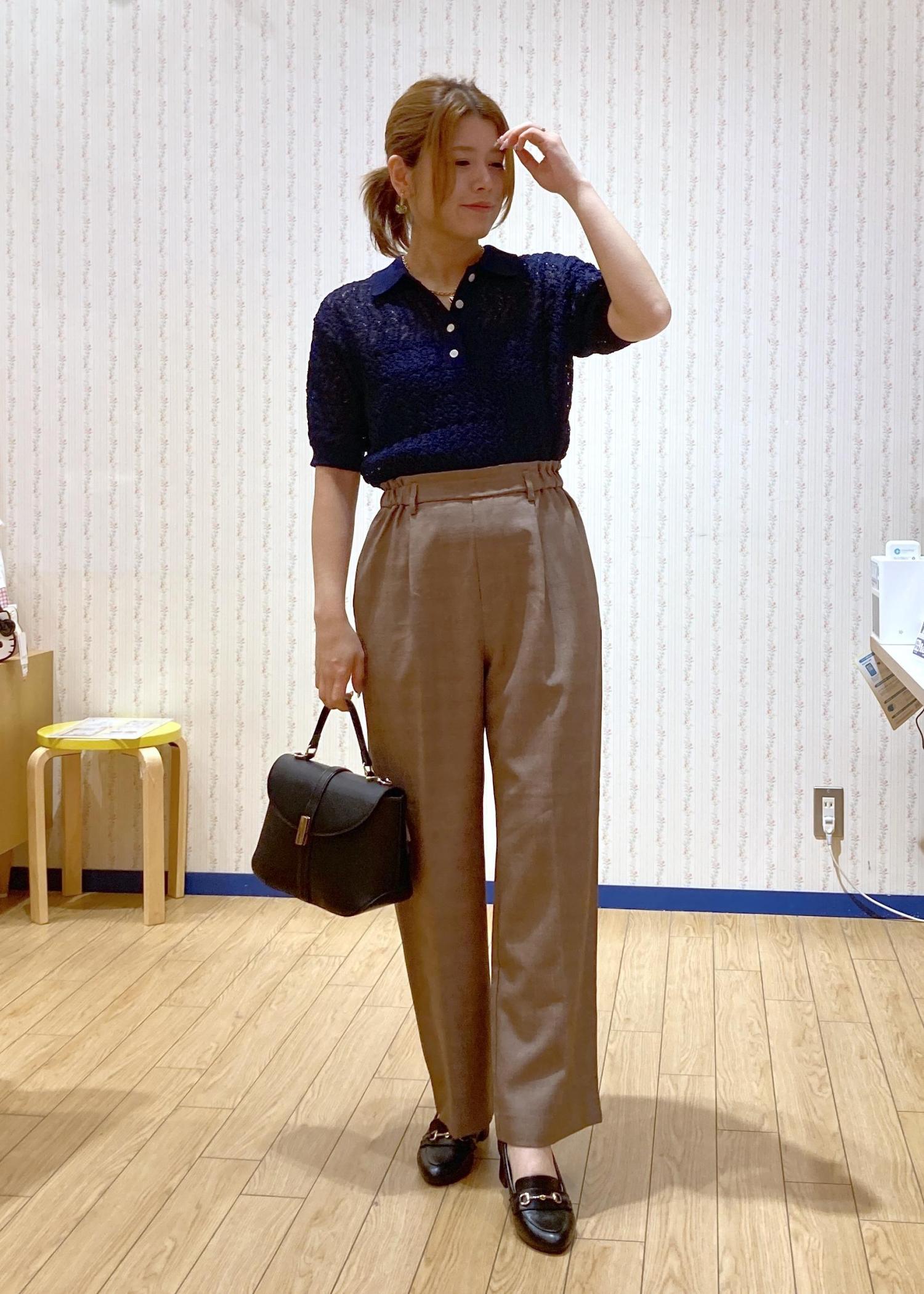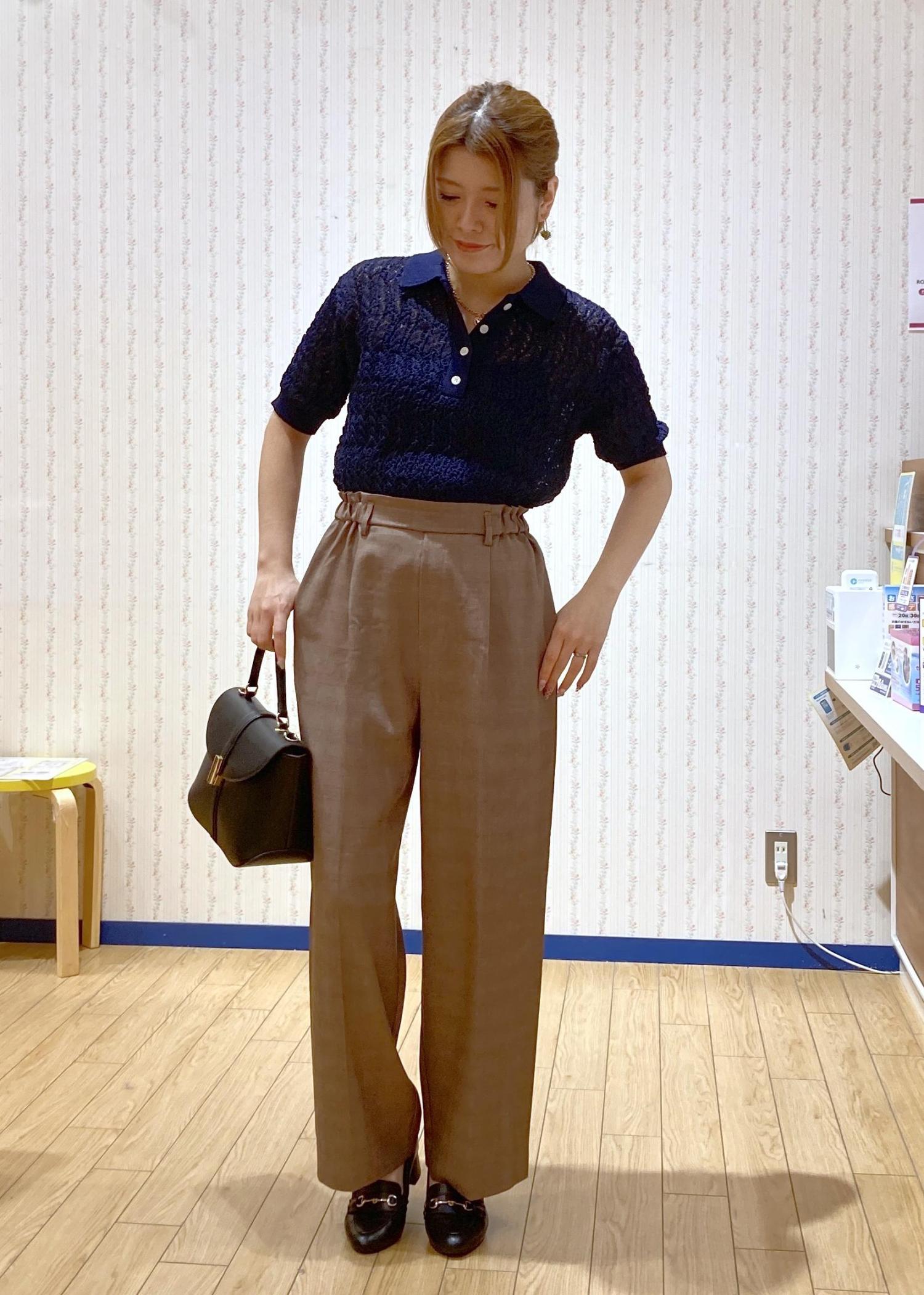 トレンド感のあるレースのポロニットにワイドパンツを合わせた綺麗めシンプルなコーディネートです。