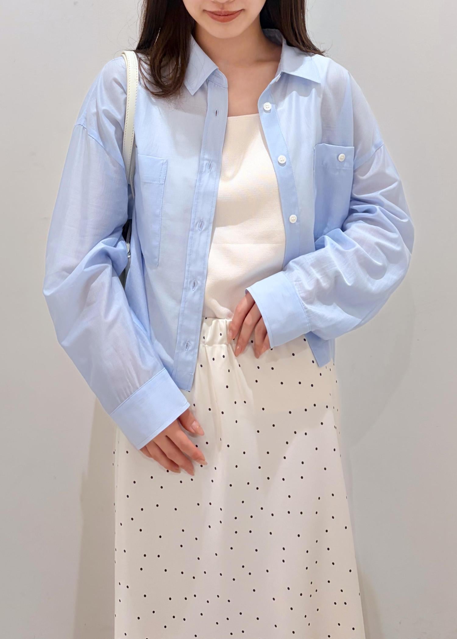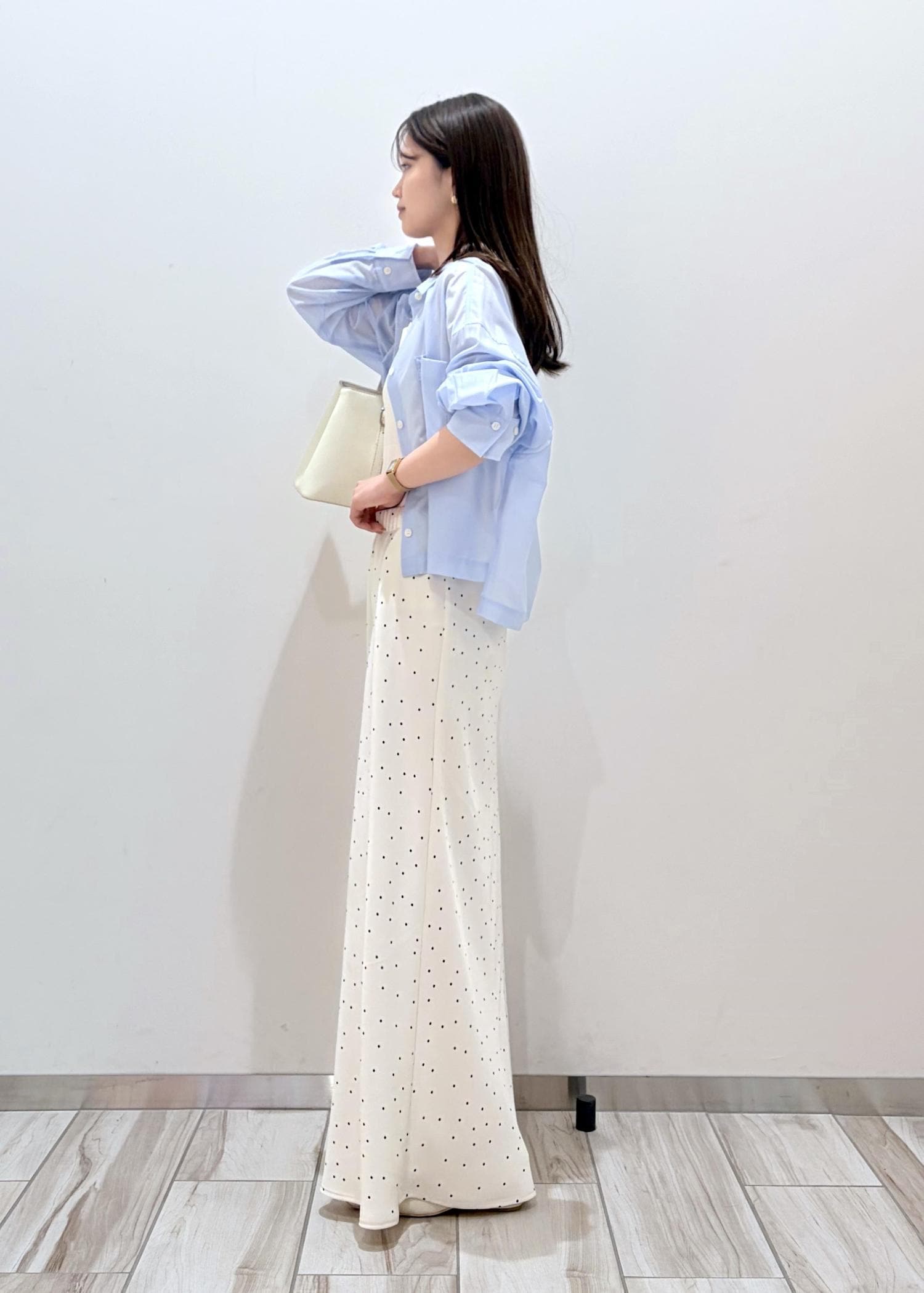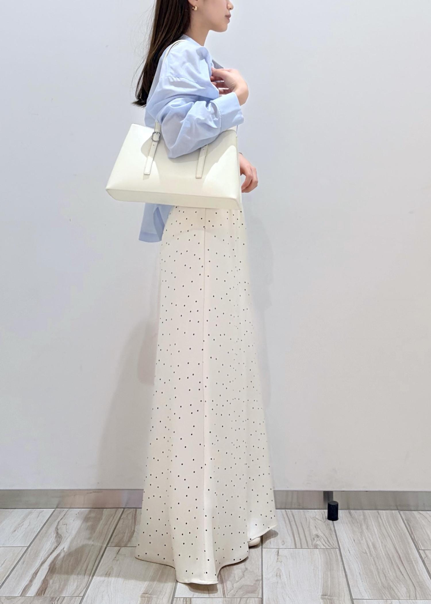 透け感のある爽やかなサックスと、サテン系のドットスカートを合わせる事で全体的に透明感と軽さのあるコーデにしてみました。ドットをプラスする事でシンプルすぎない程よい可愛らしさも出るので、大人な女性でも着やすいお勧めのコーデです。