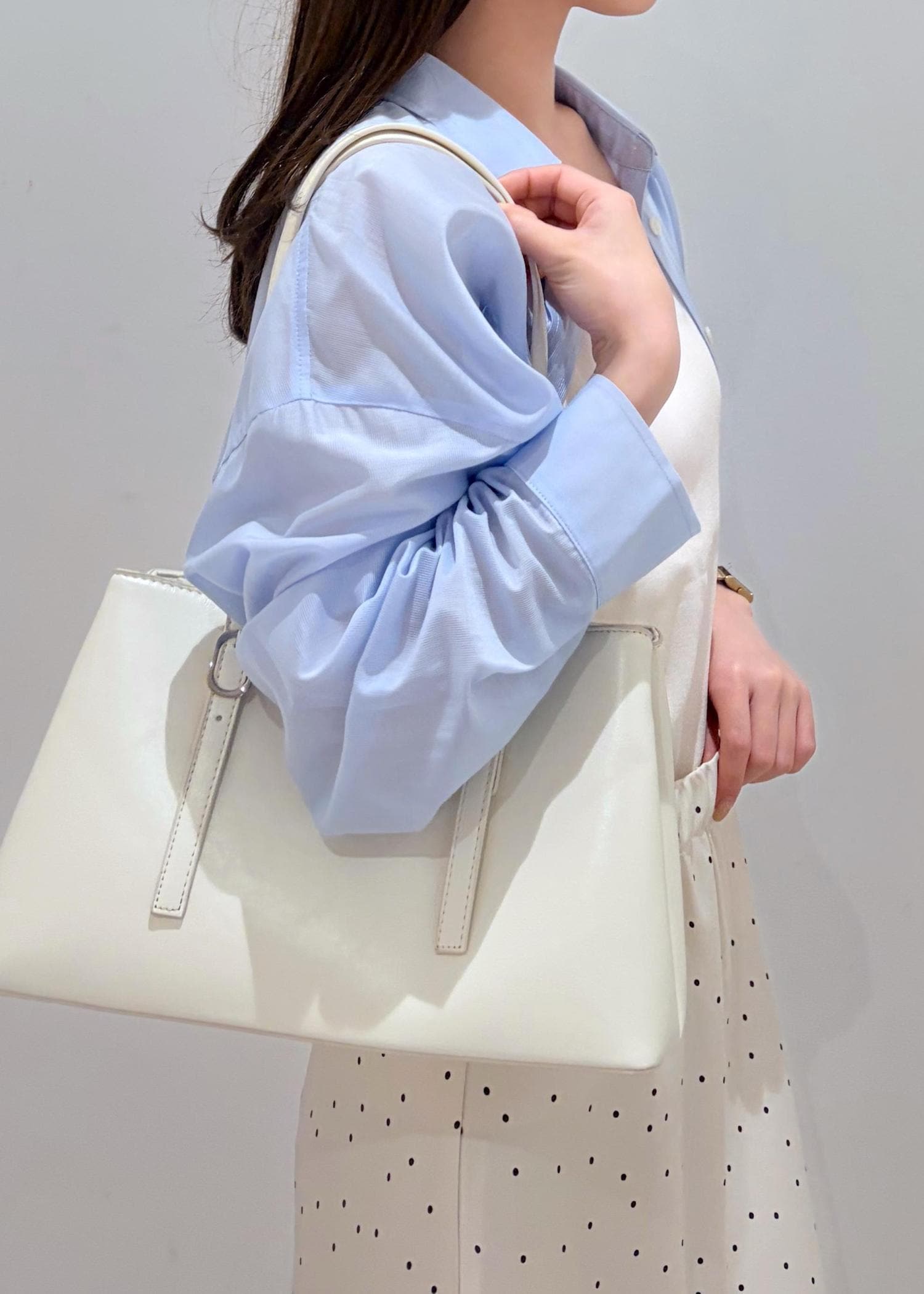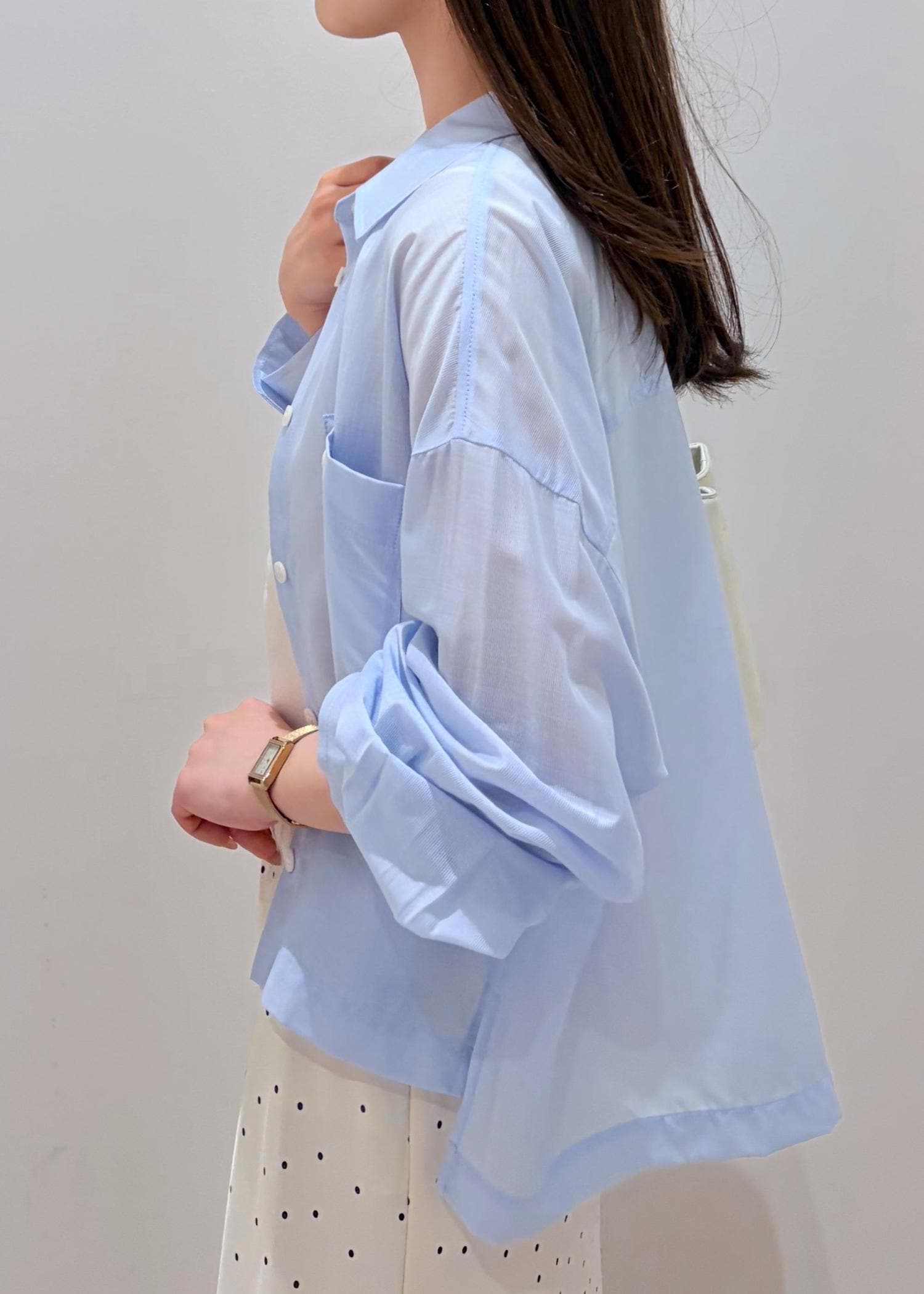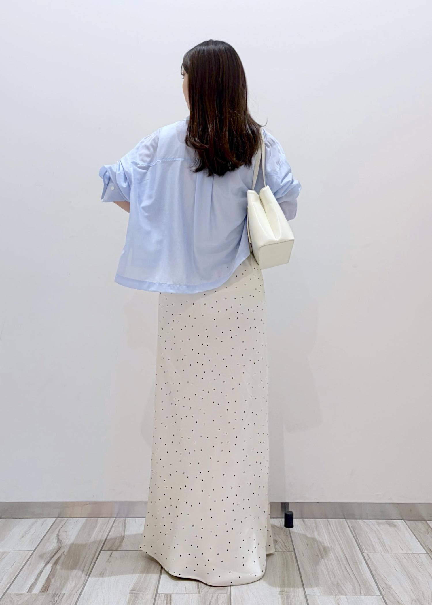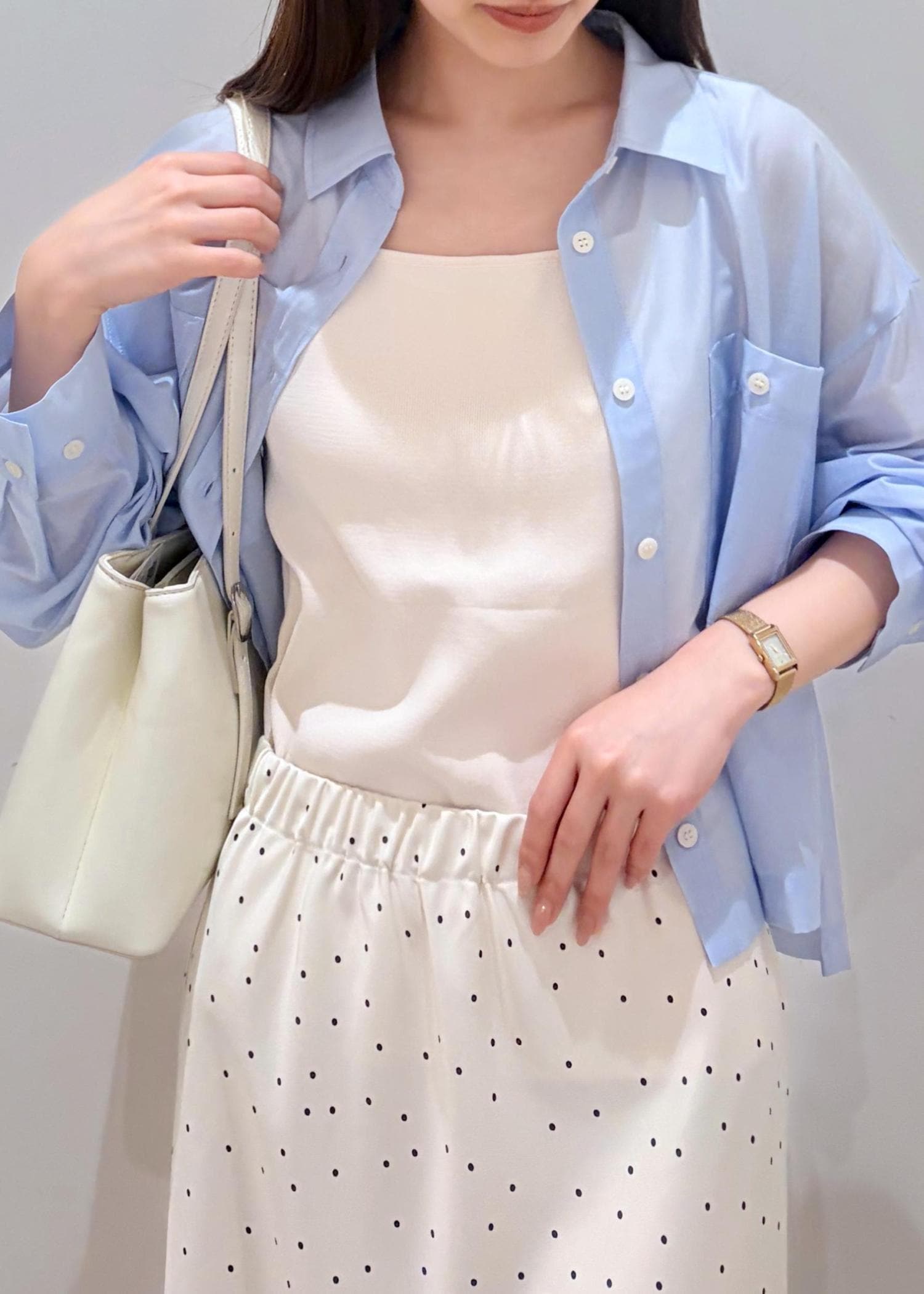 透け感のある爽やかなサックスと、サテン系のドットスカートを合わせる事で全体的に透明感と軽さのあるコーデにしてみました。ドットをプラスする事でシンプルすぎない程よい可愛らしさも出るので、大人な女性でも着やすいお勧めのコーデです。