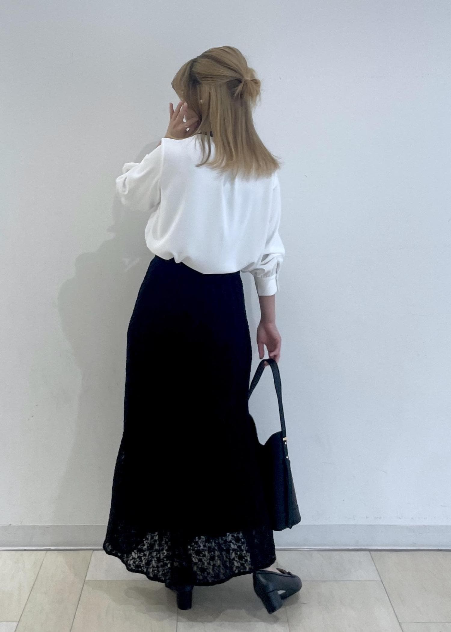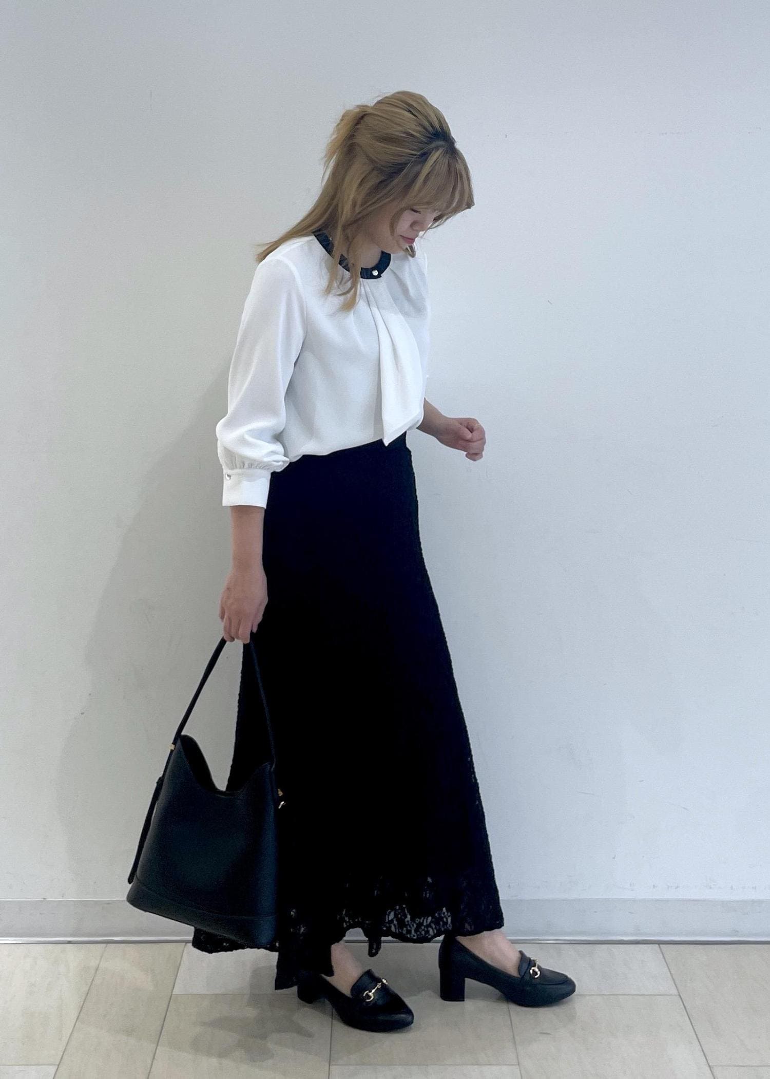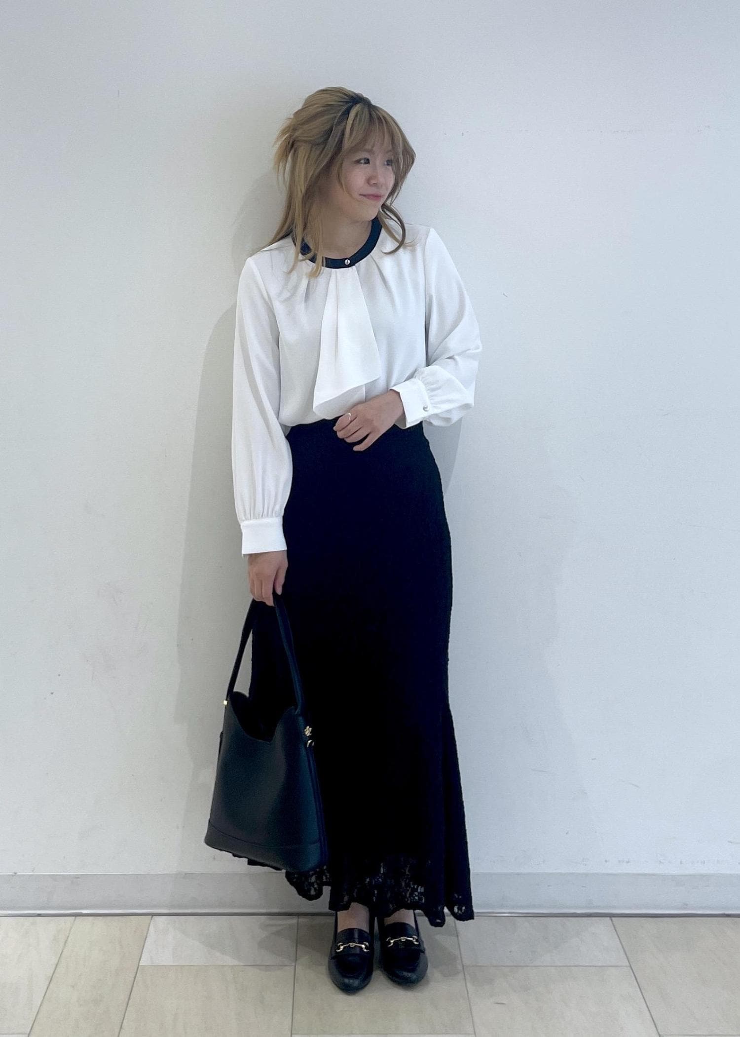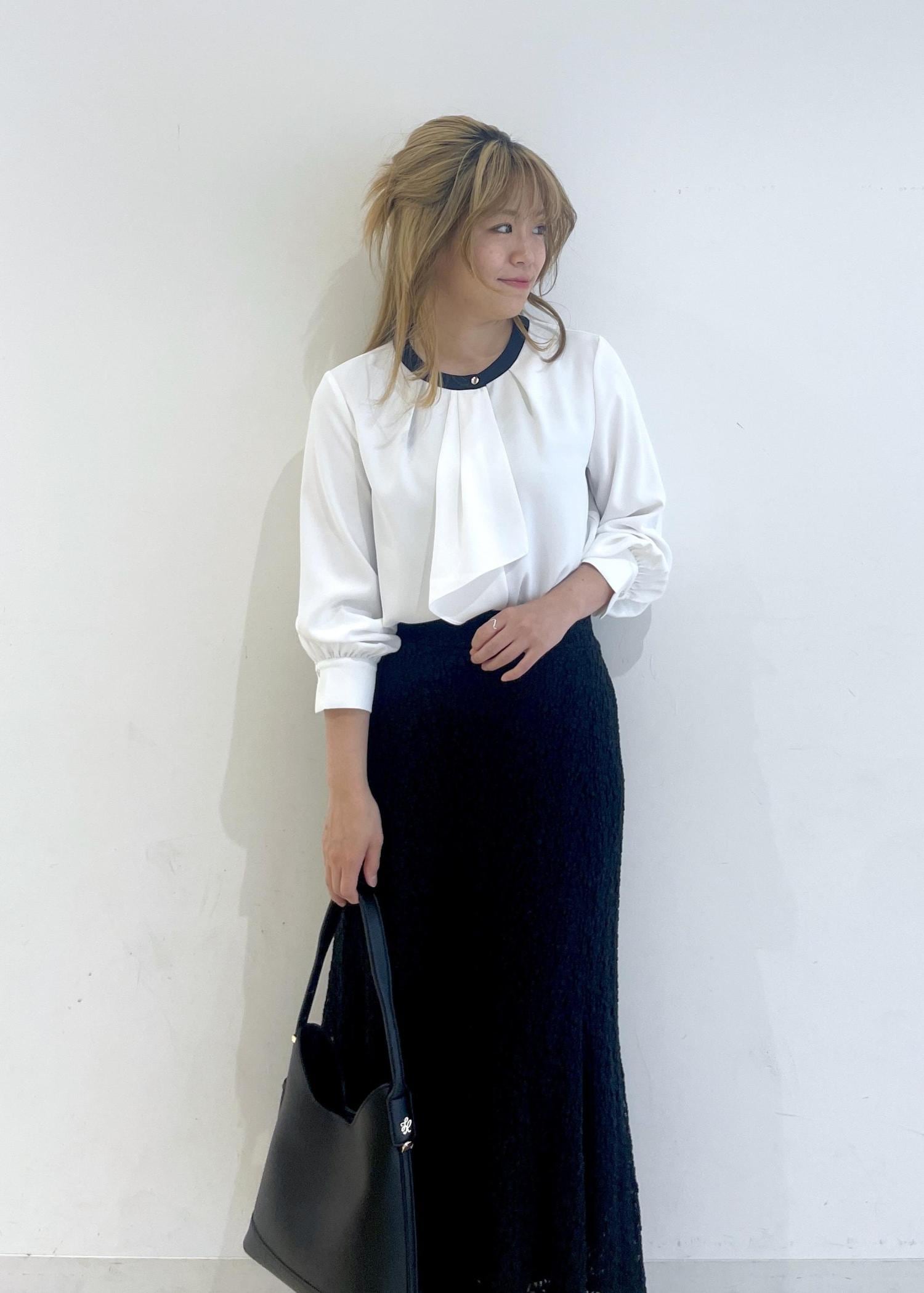 人気のボウタイブラウスに黒のマーメイドスカートを合わせたシンプルなコーディネートです!