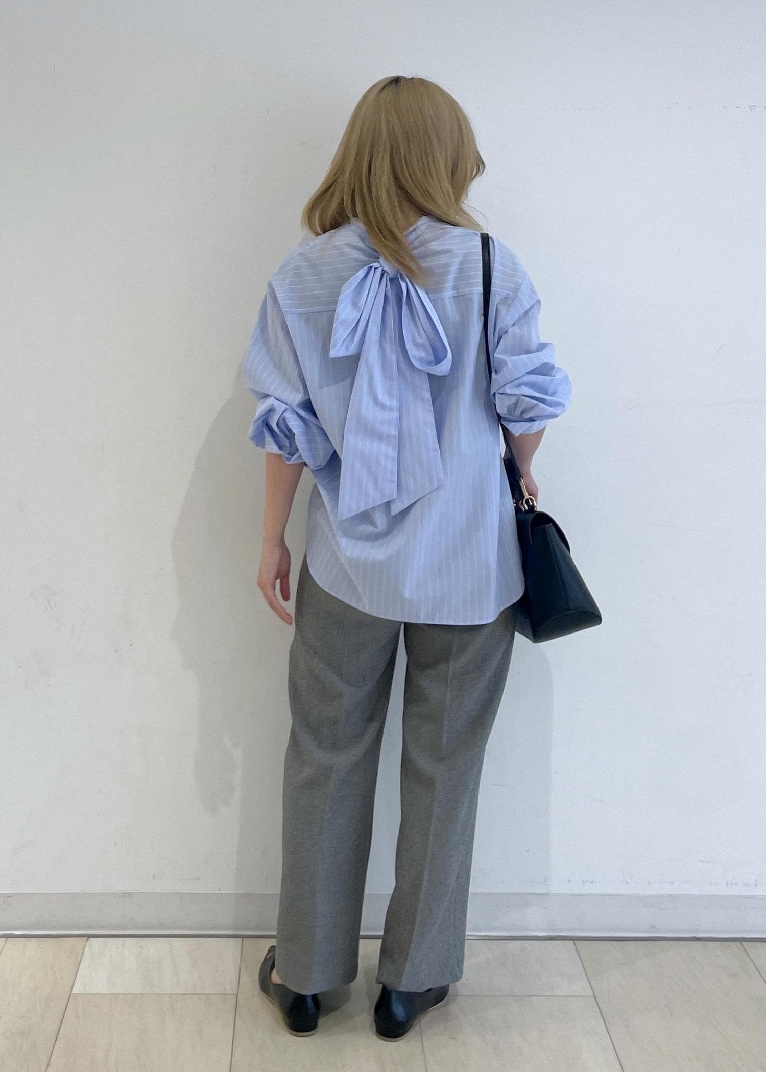 胸元にあるとかわいくなりすぎるリボンシャツですが、後ろで結ぶことで甘くならず華やかな印象で着れます◎