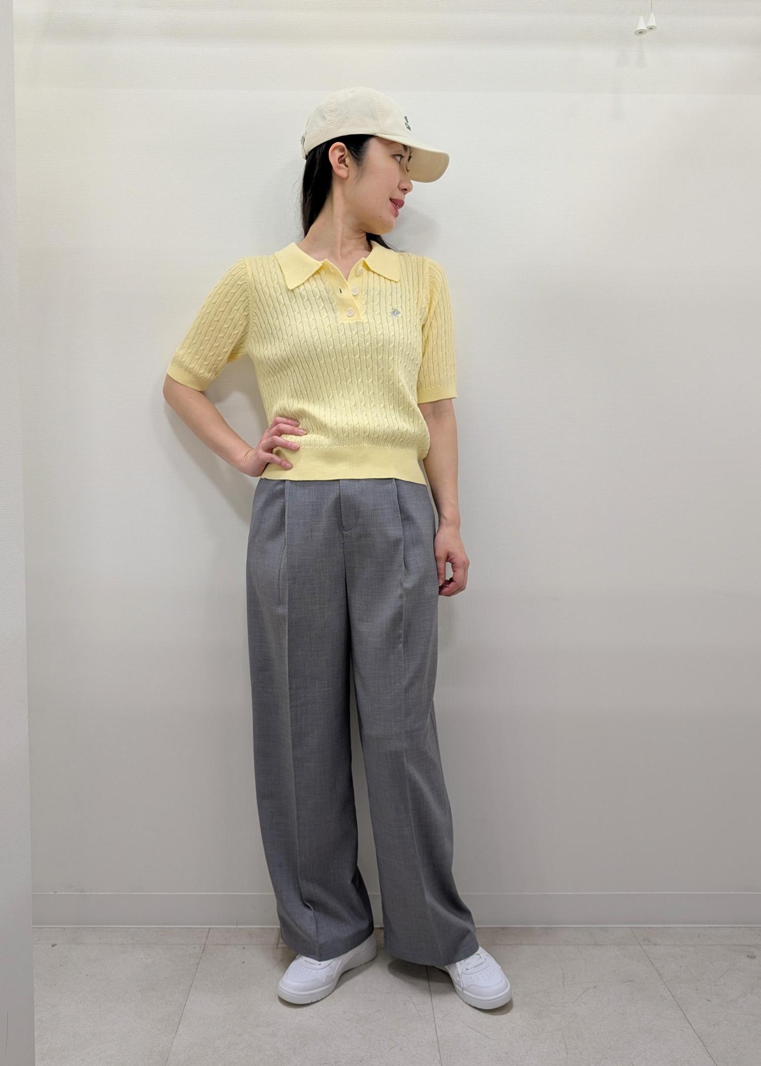 トレンドのケーブル×襟付きニットが主役のカジュアルコーデ。
