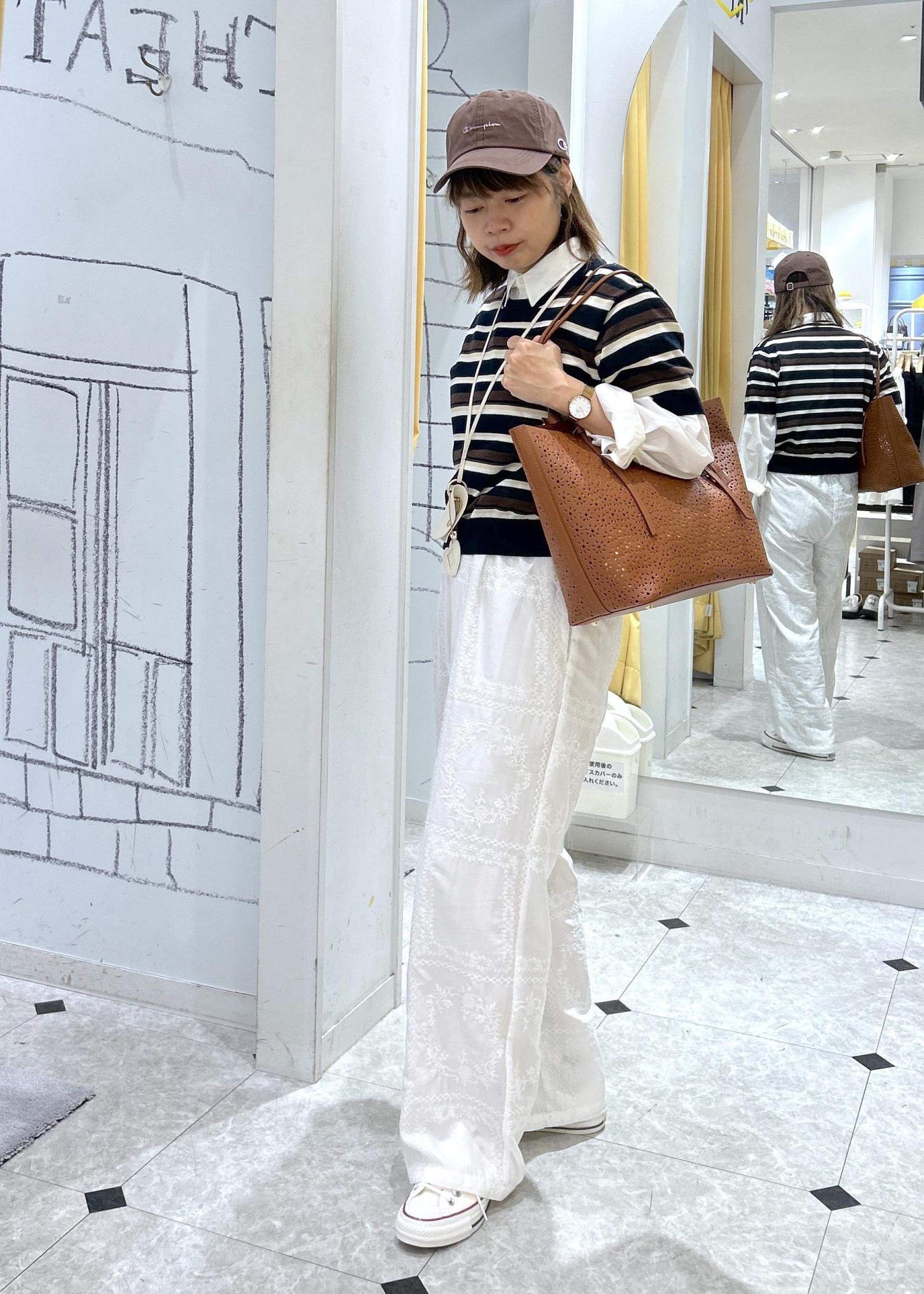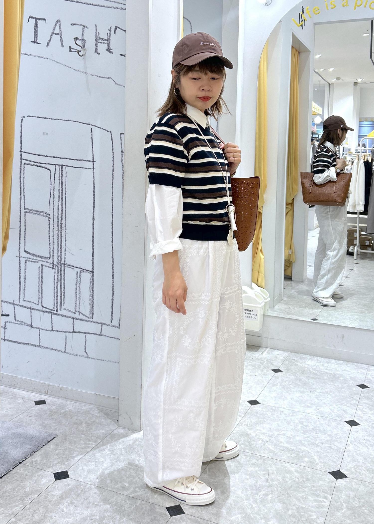 メンズライクなコーデだけれど、刺繍のパンツが女子らしさをプラスしてくれます◎