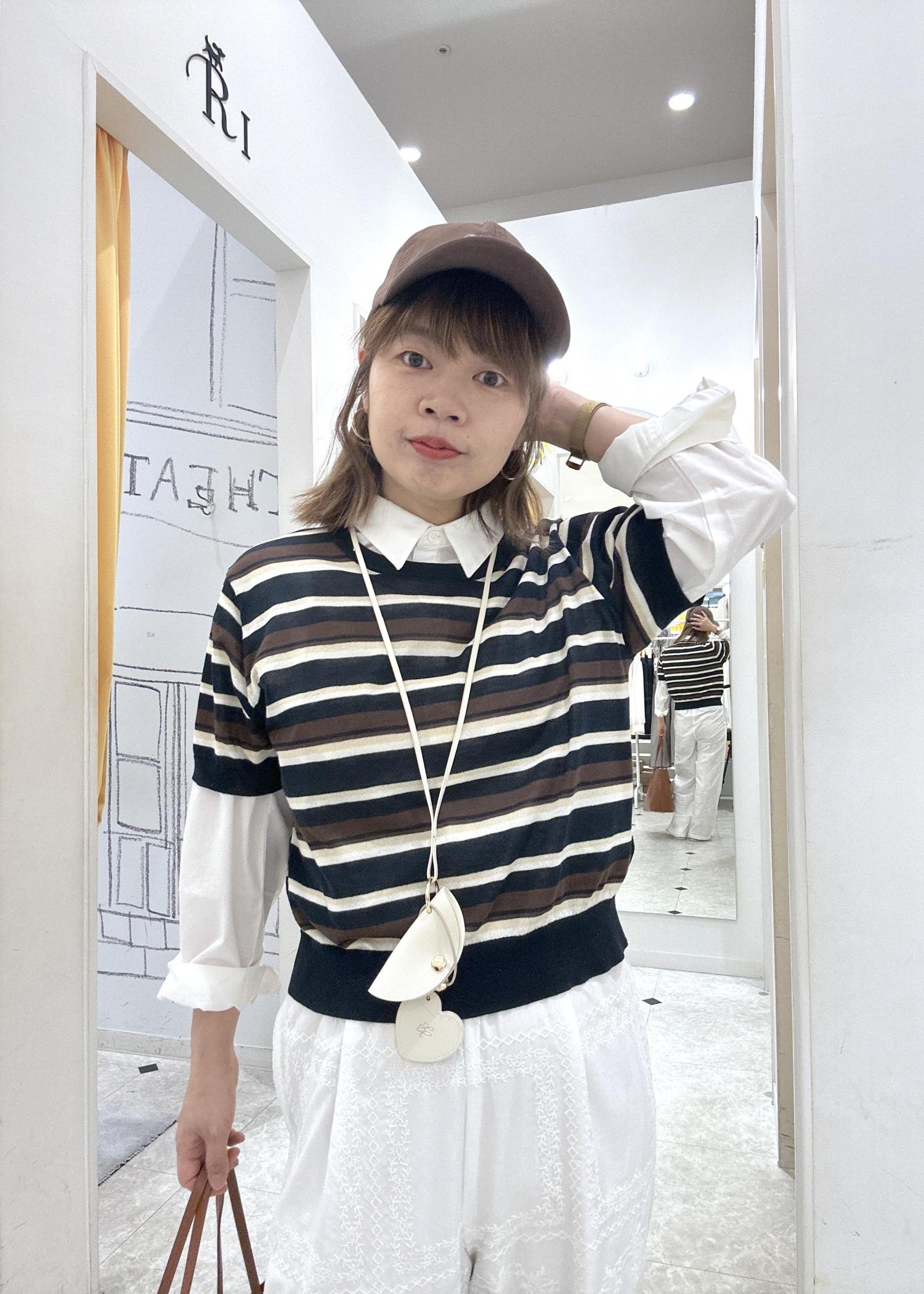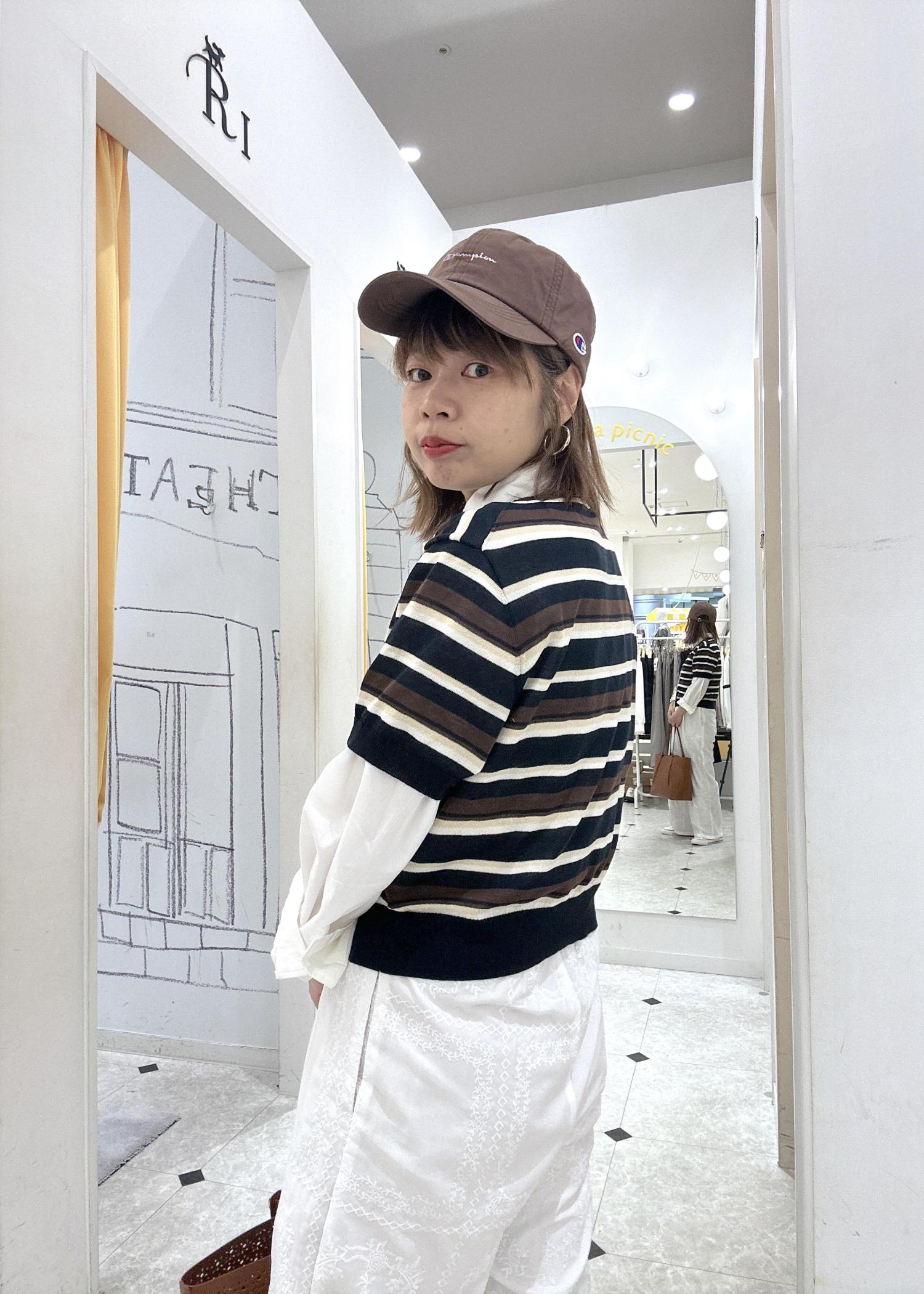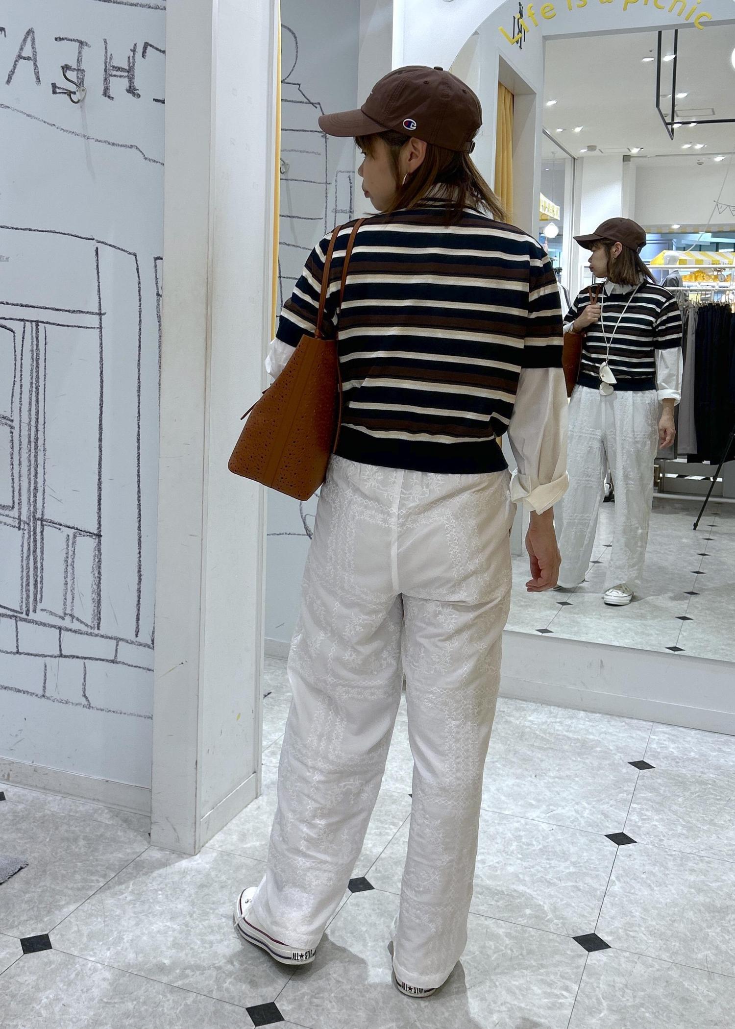 マルチボーダーのニット以外は全てホワイトで合わせて爽やかなスポーティースタイルに。