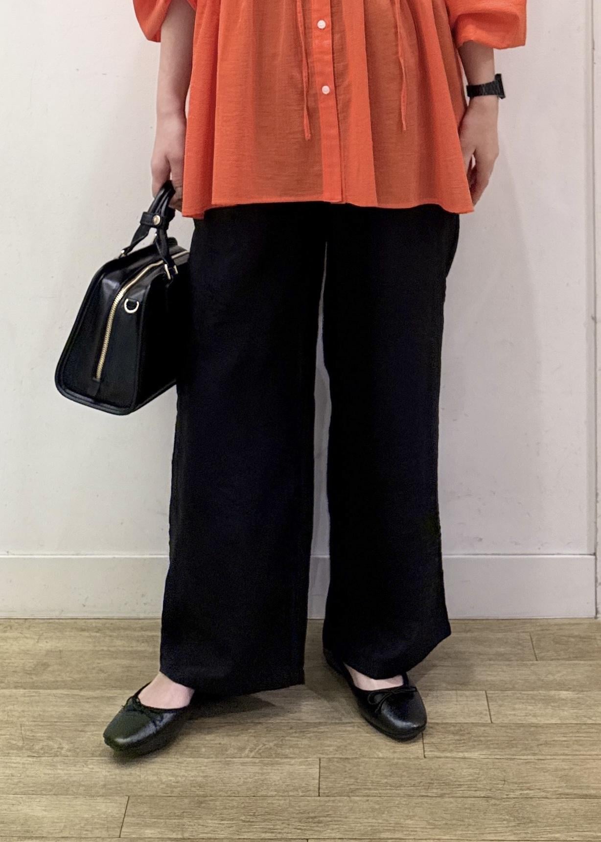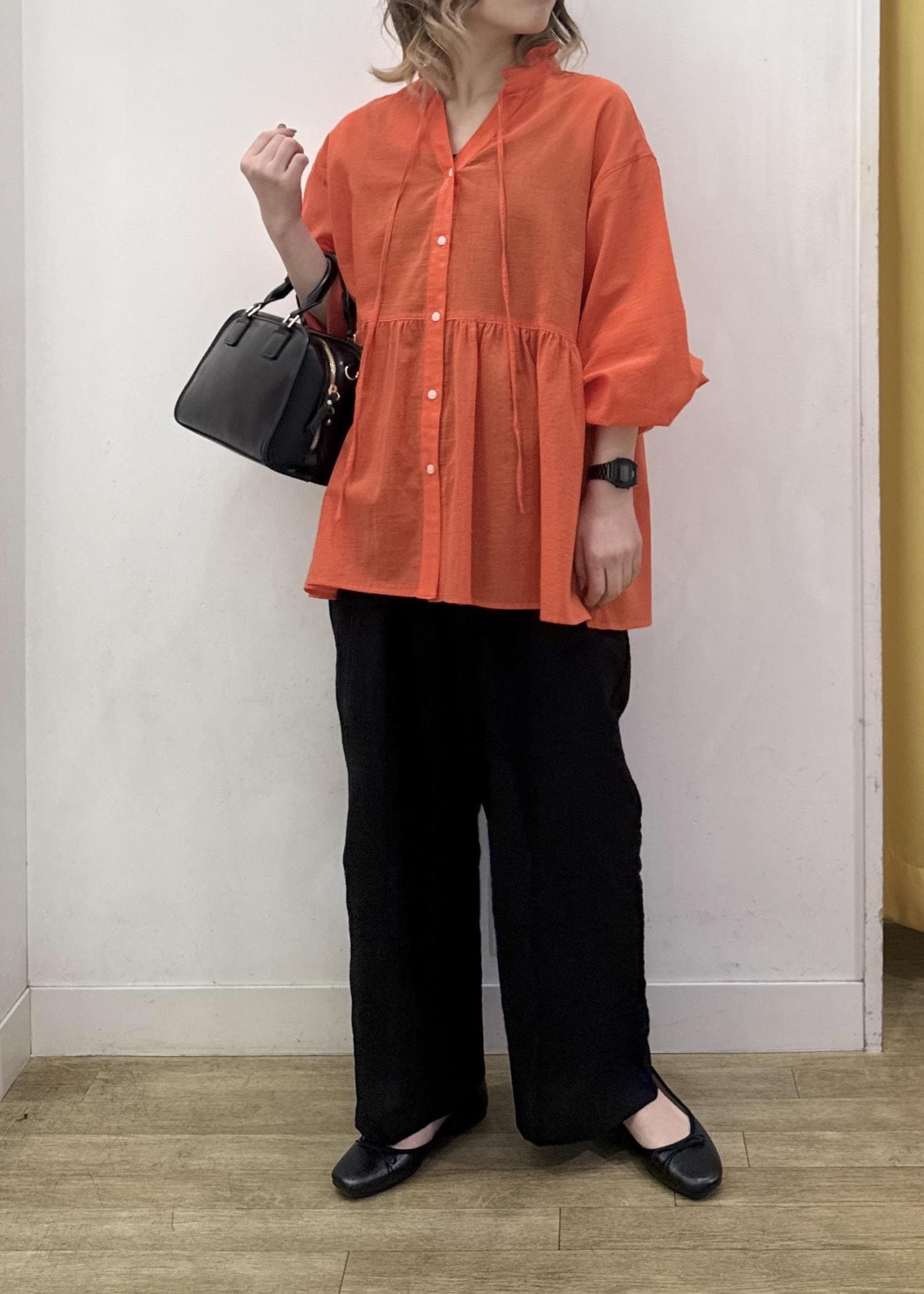 あざやかなオレンジカラーが主役になるように他アイテムはブラックでまとめるのがポイント♪