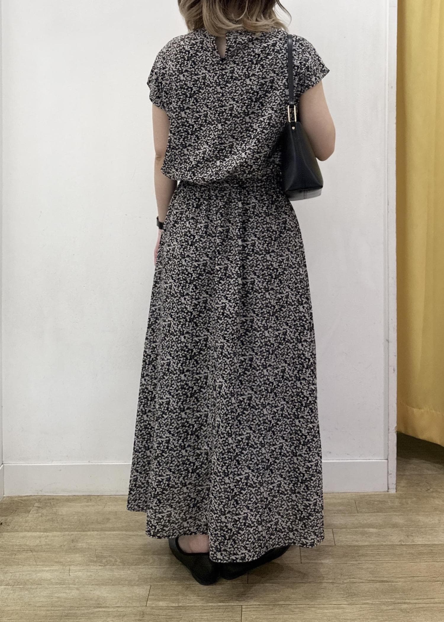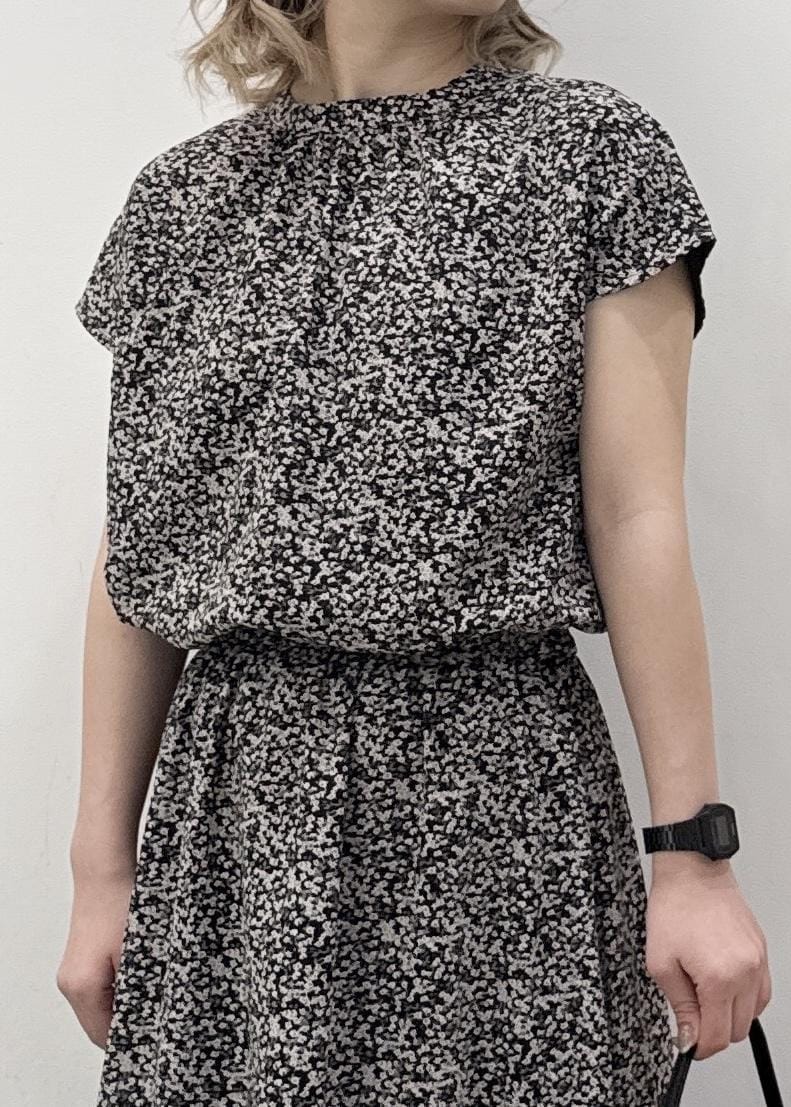 ウエストはゴムでスッキリとメリハリのあるシルエット、袖もフレンチスリーブで1枚でも着ていただきやすいワンピースです。