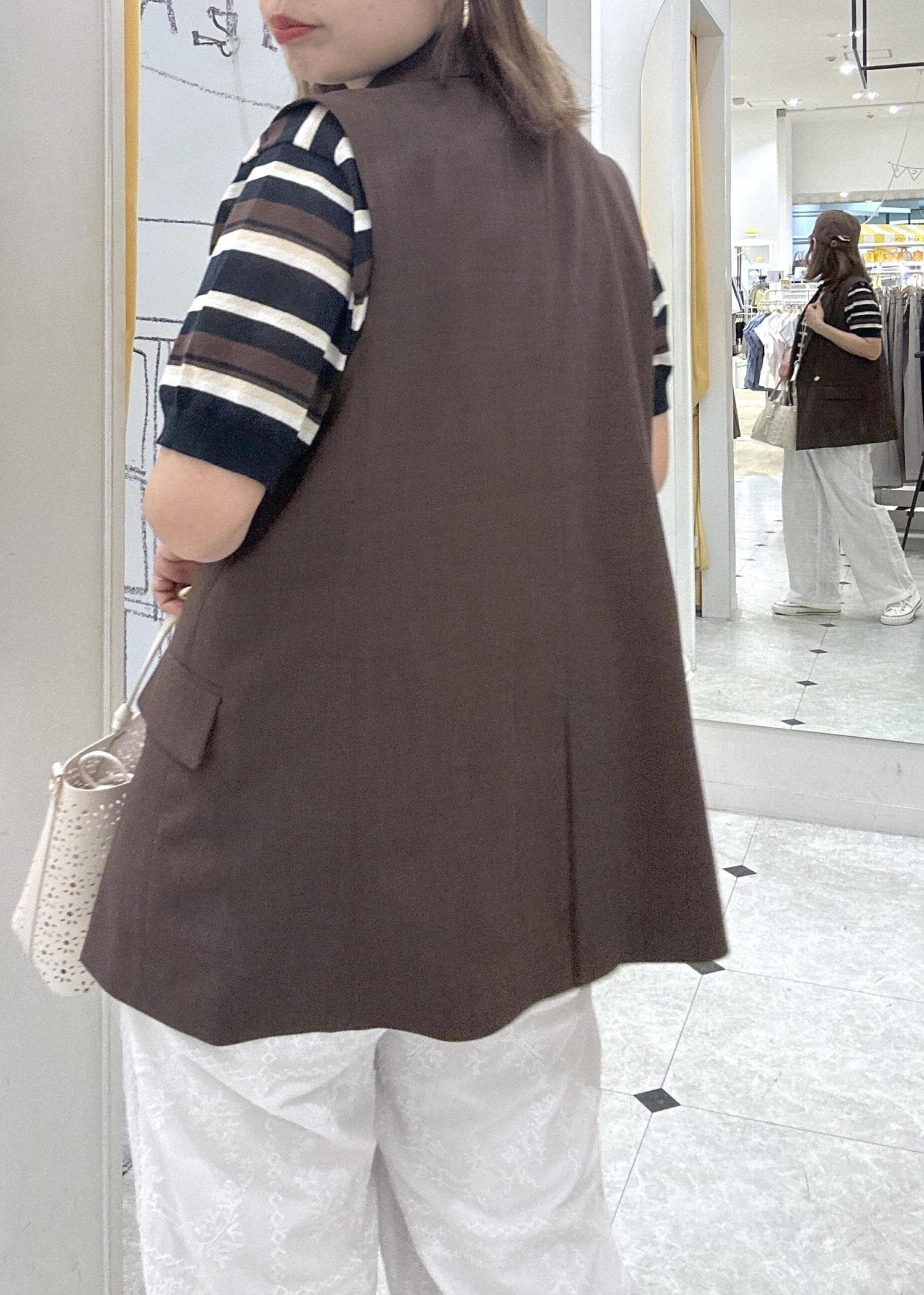 ブラウンにホワイトで軽さを出し、レースのパンツで女性らしさもさりげなくプラス。