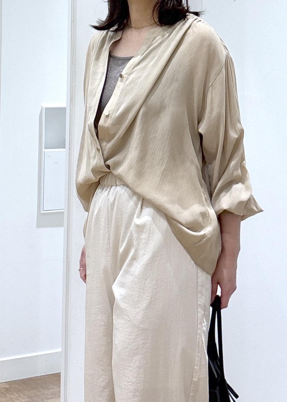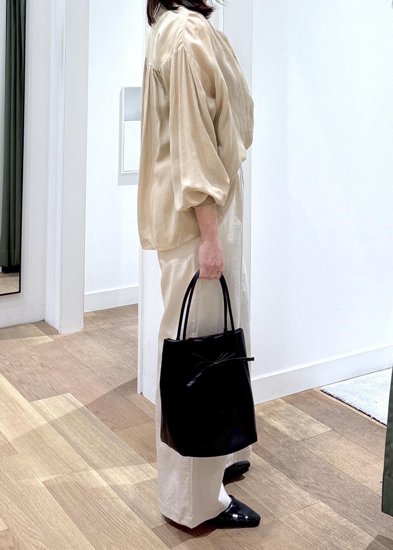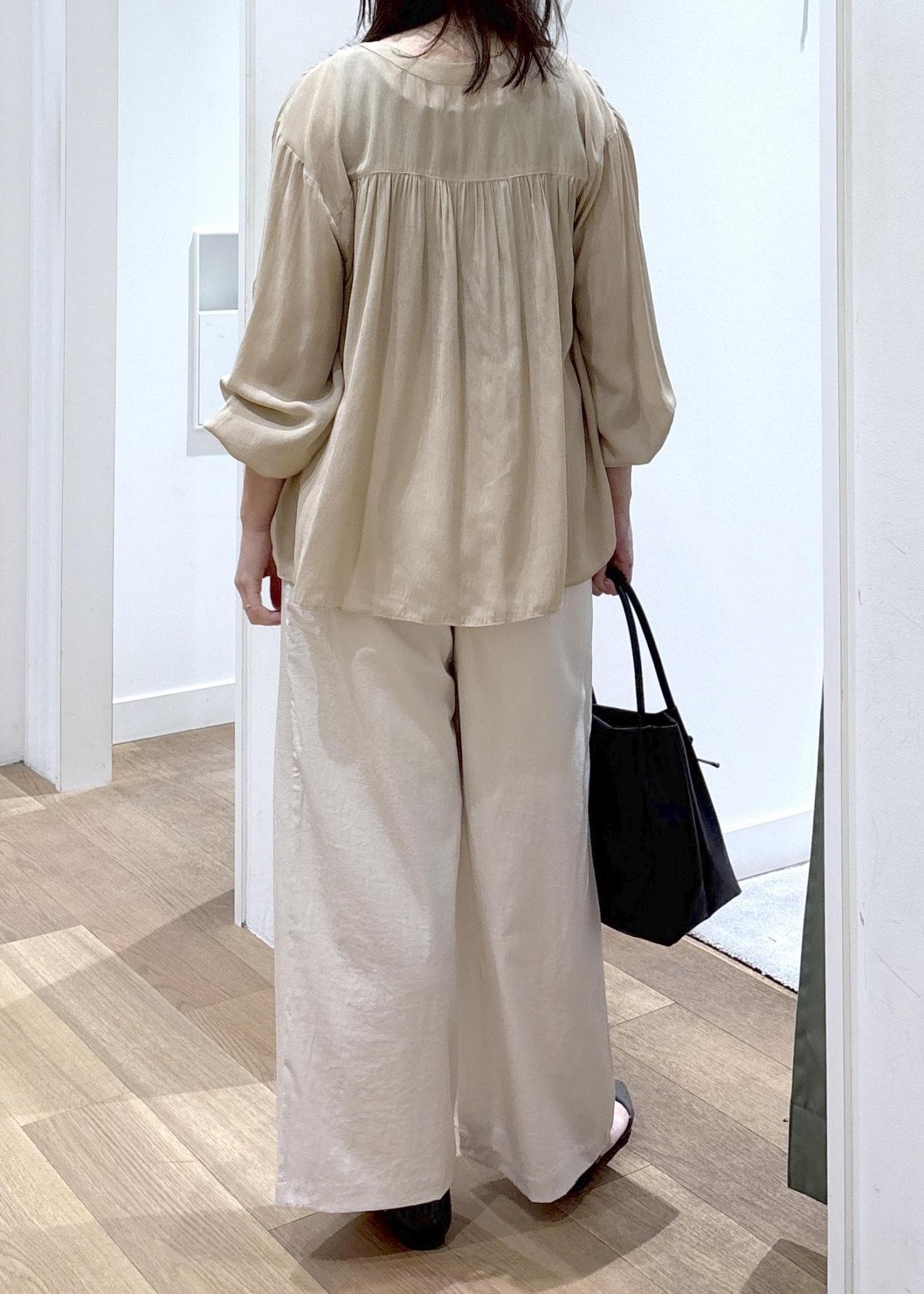 さらっとしていて柔らかく、インした時のシルエットもかわいいです。後ろはお尻が隠れるくらいの着丈です。 -