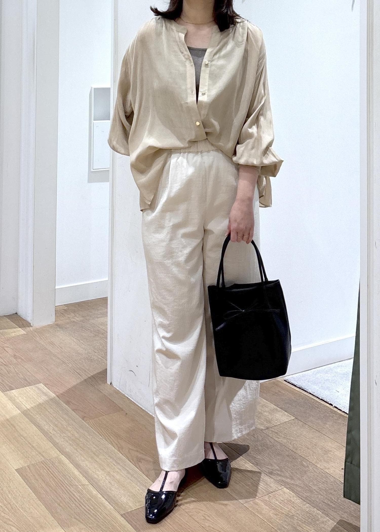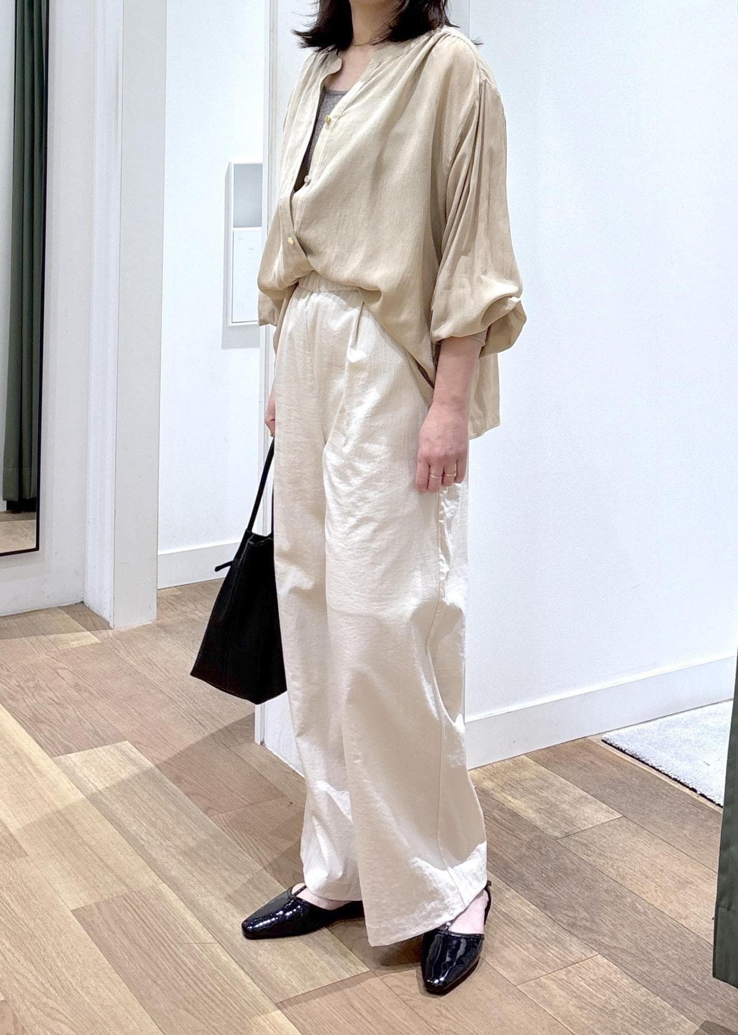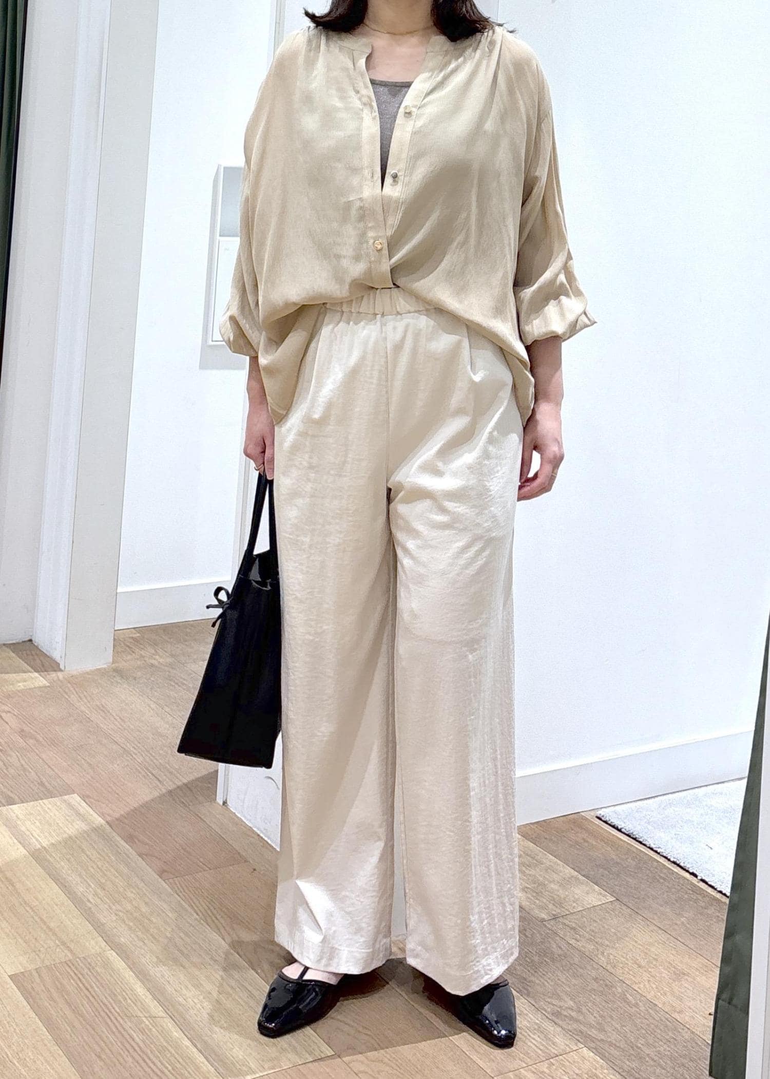 さらっとしていて柔らかく、インした時のシルエットもかわいいです。後ろはお尻が隠れるくらいの着丈です。 -