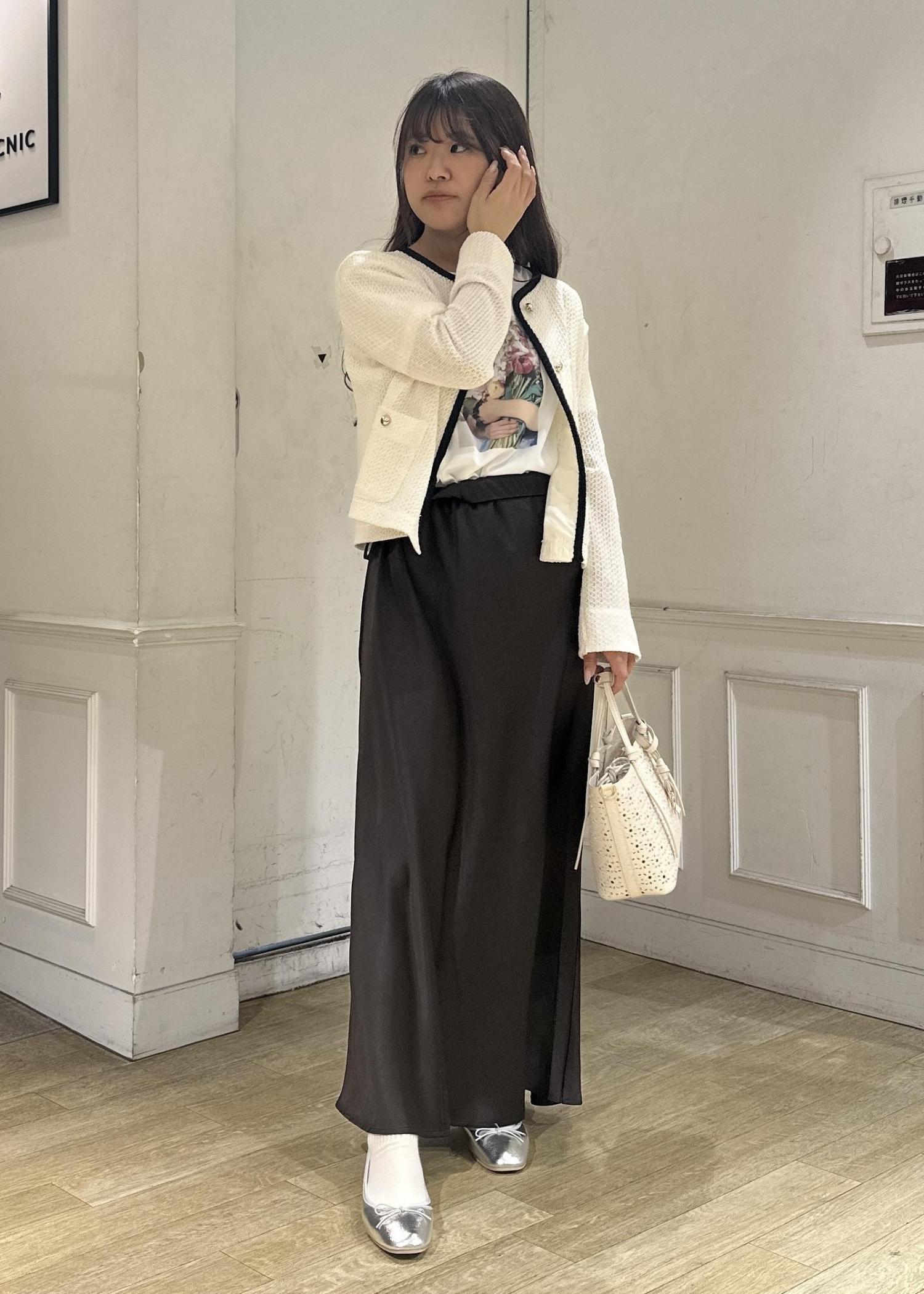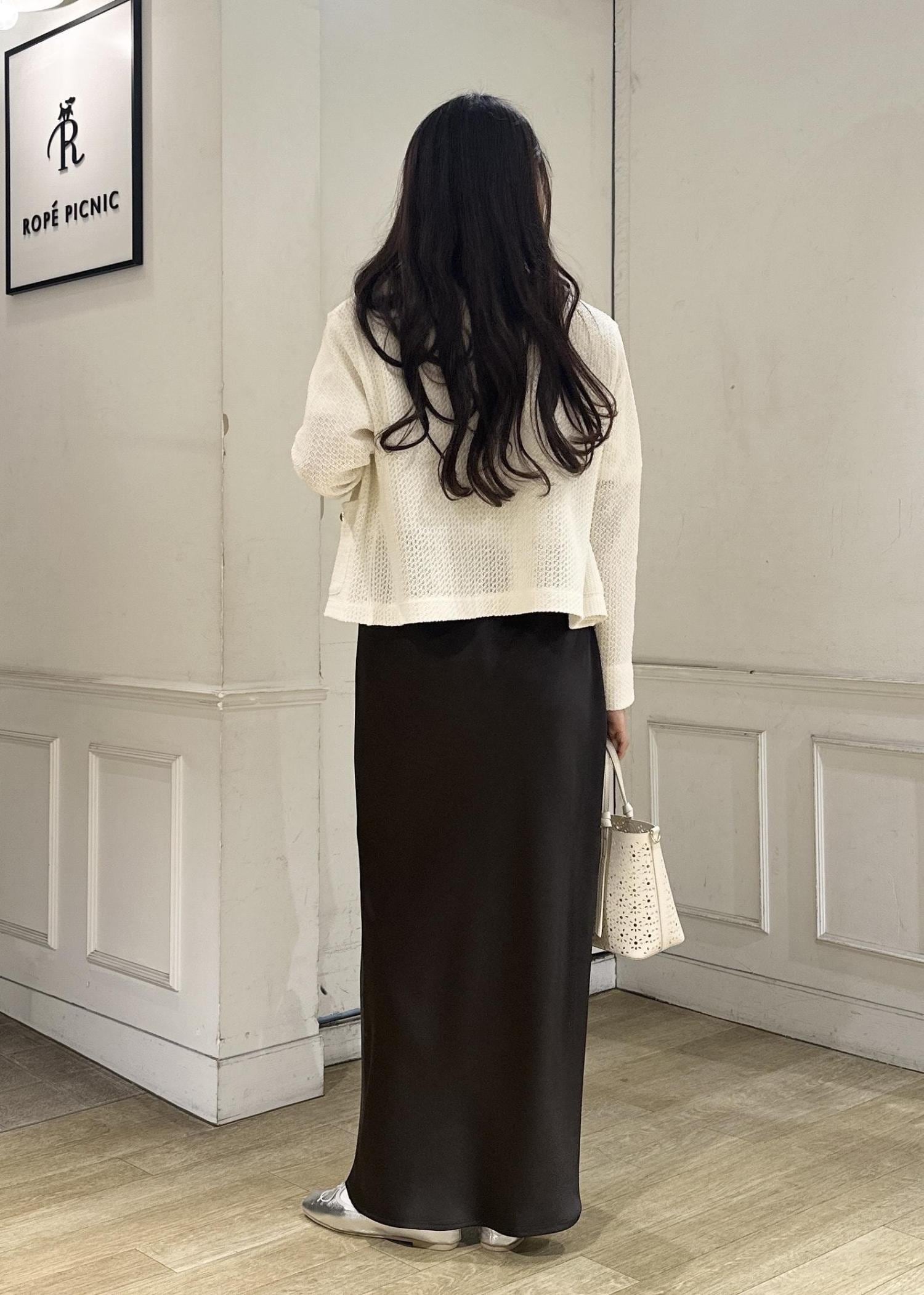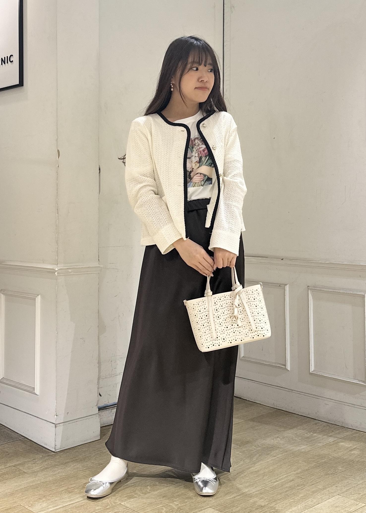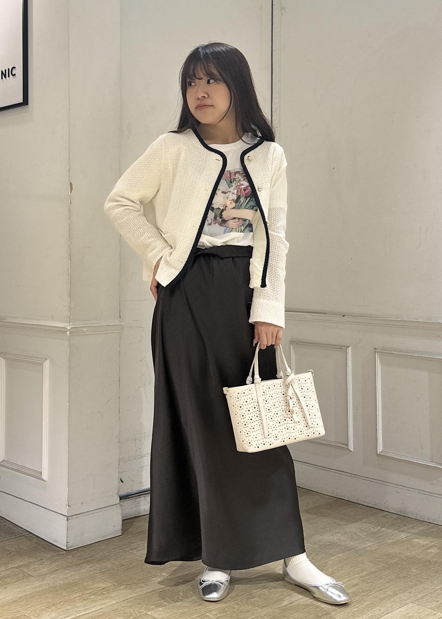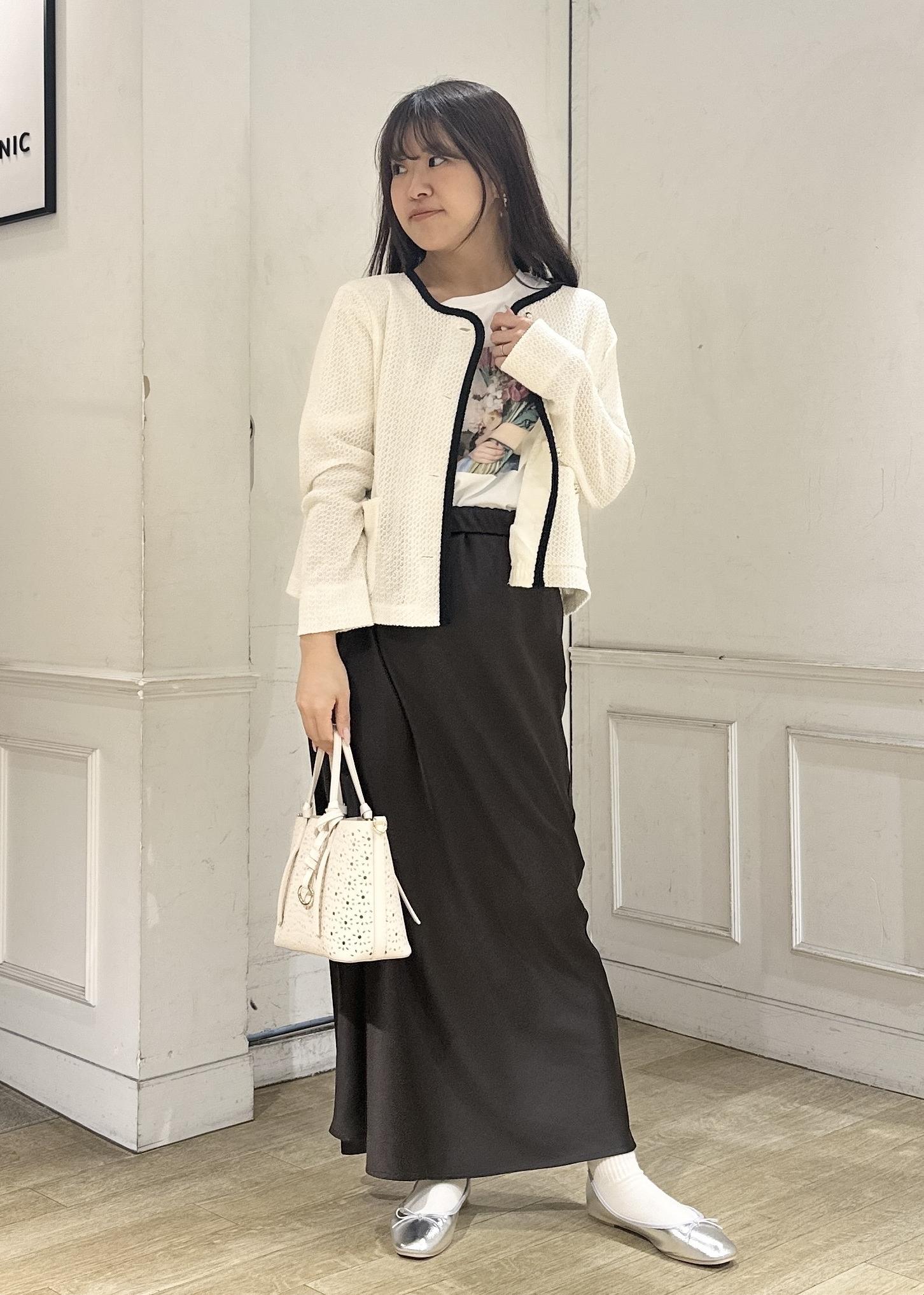 今年の春はブラウンがトレンドカラーとして沢山展開があるのでスカートは揺れ感が可愛いサテンスカートをチョイス。